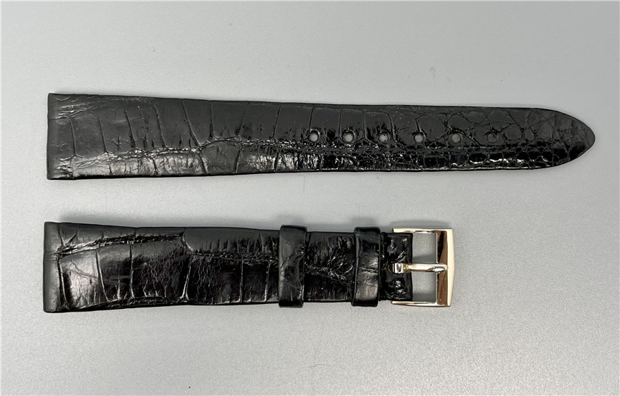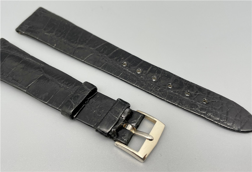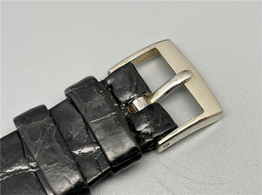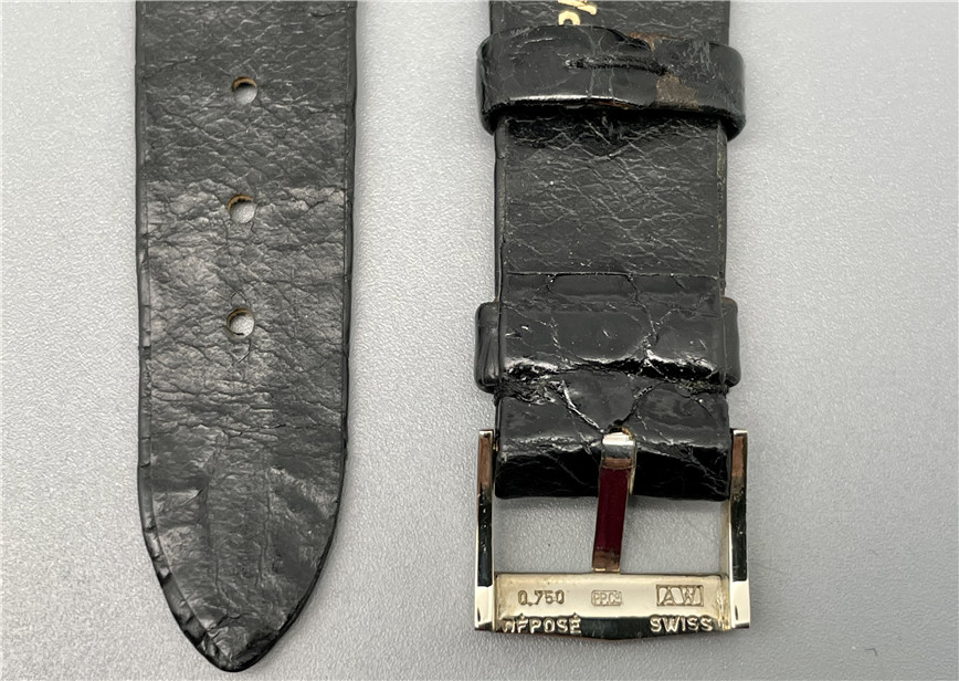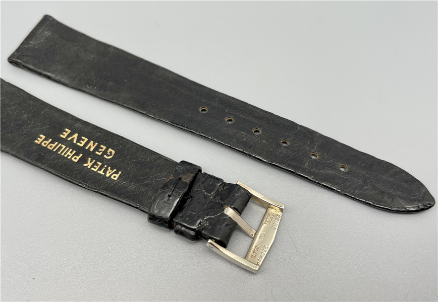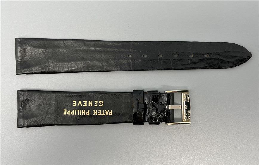 百达翡丽vintage原厂表扣及皮带,白金表扣,黑色鳄鱼皮带,14mm,平扣,表扣印记:swiss、AW、PPco、750。