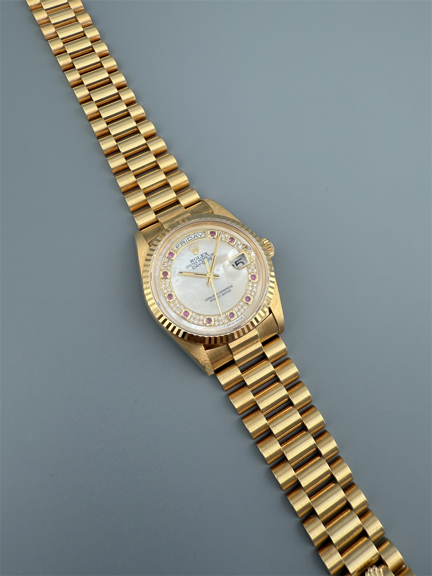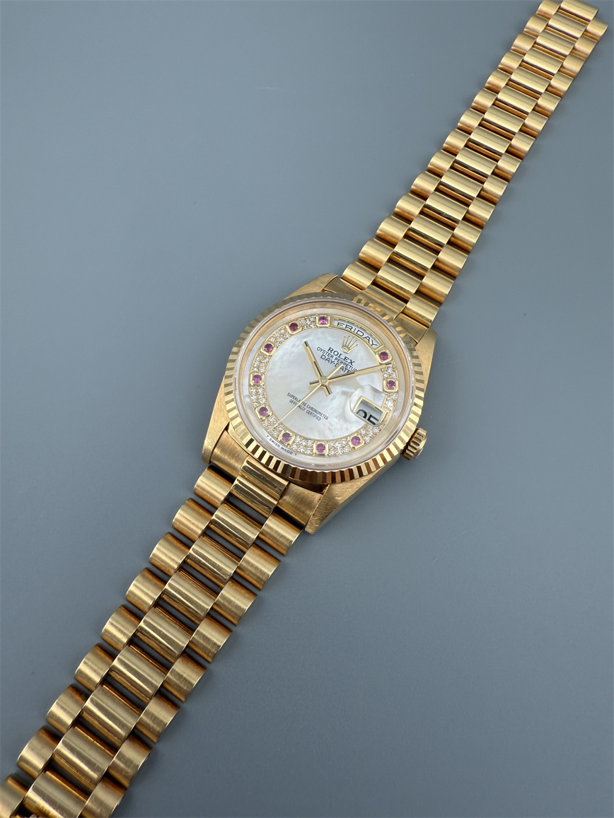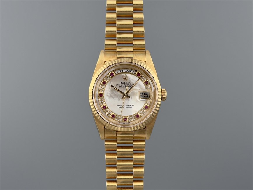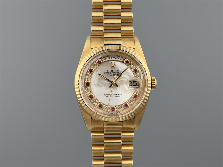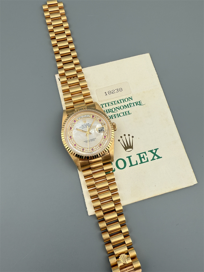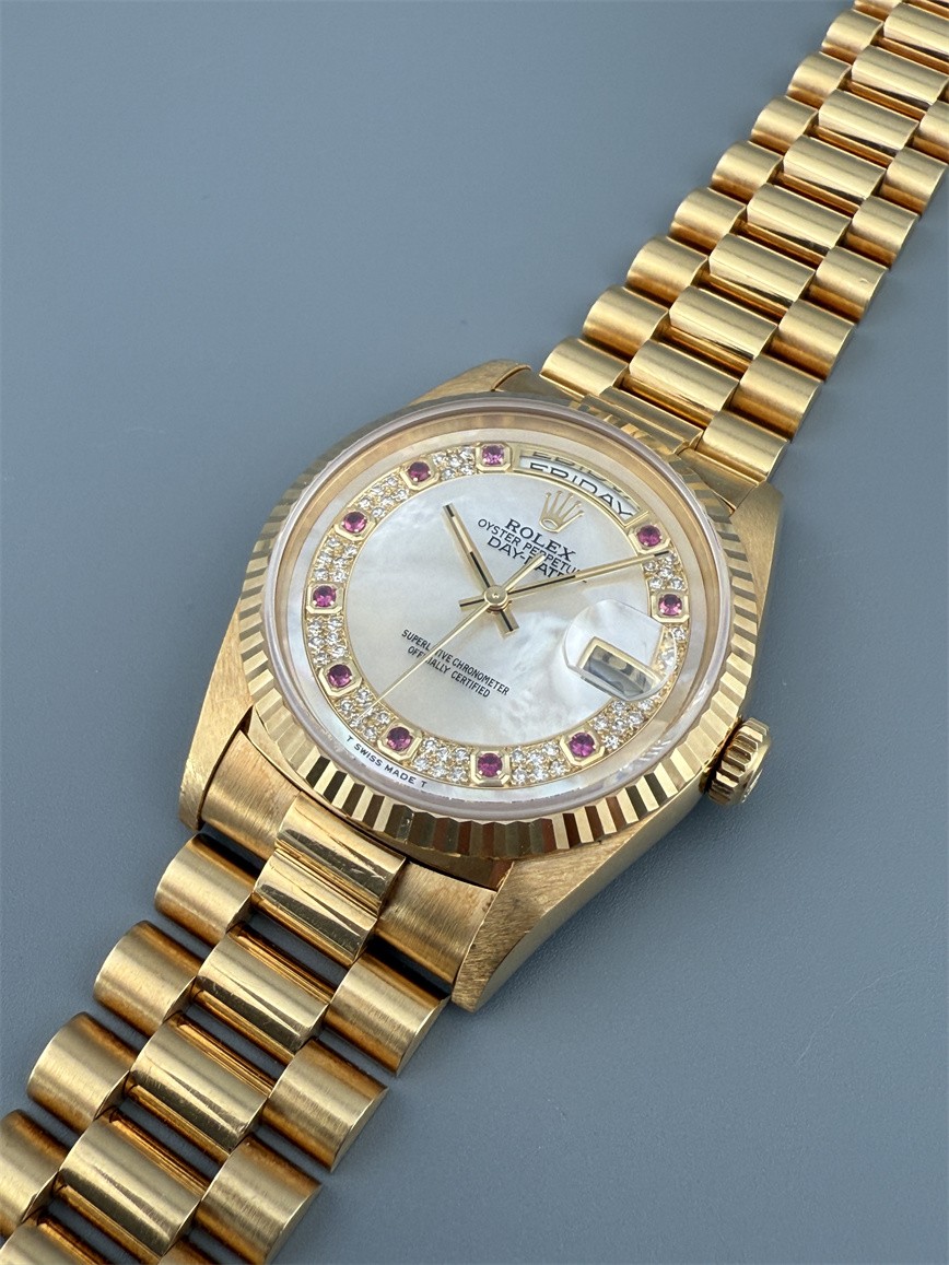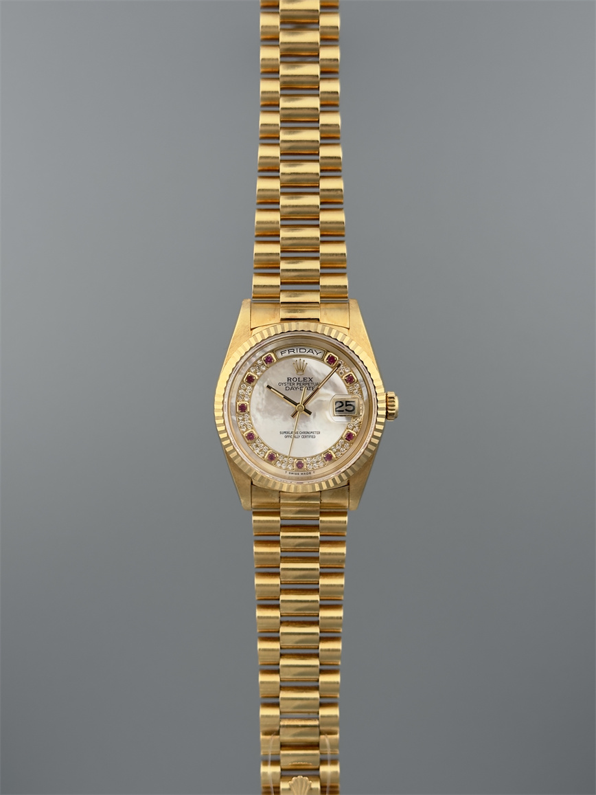 劳力士Ref.18238, 蚝式恒动Day-Date腕表,口径36mm。黄金表壳,贝母面,红宝石时标,中心秒针,星期和日历显示,自动机芯Cal. 3155,黄金President链带,劳力士logo折叠表扣,附原盒证书。