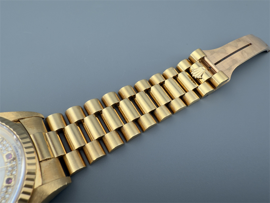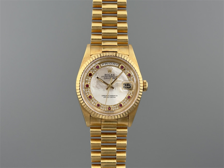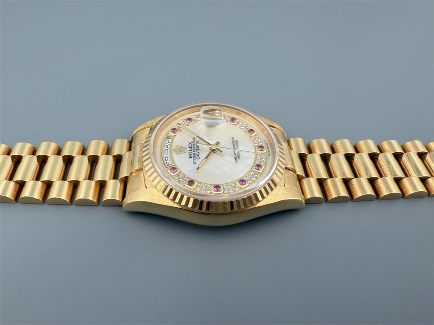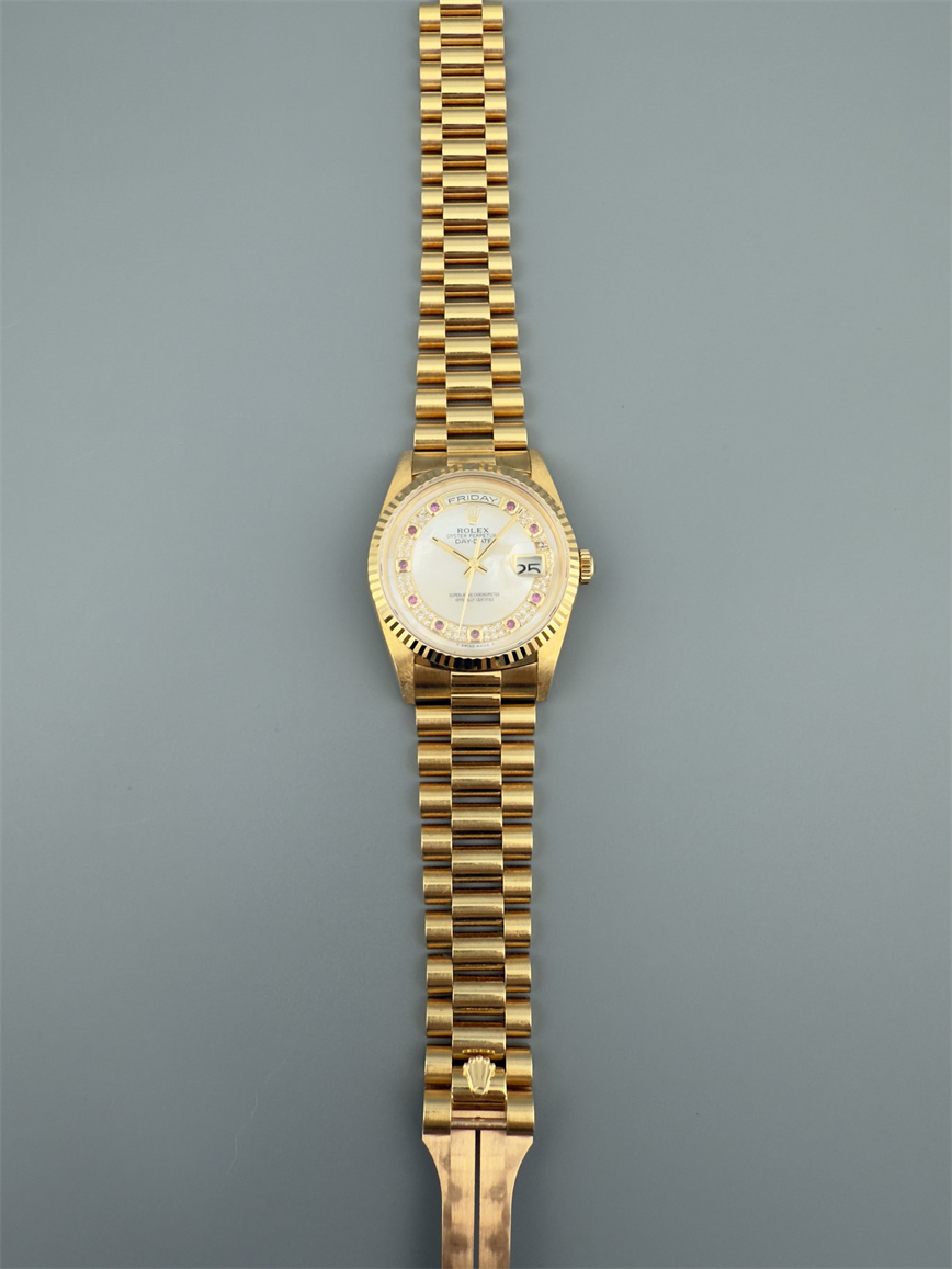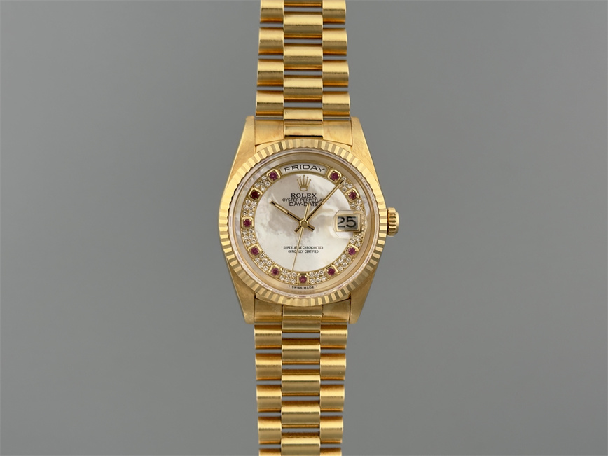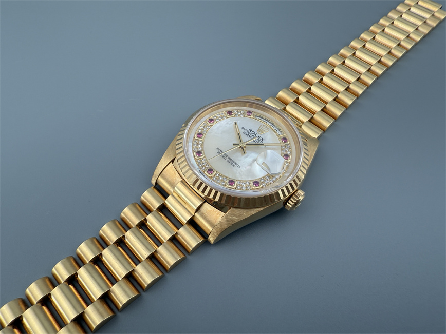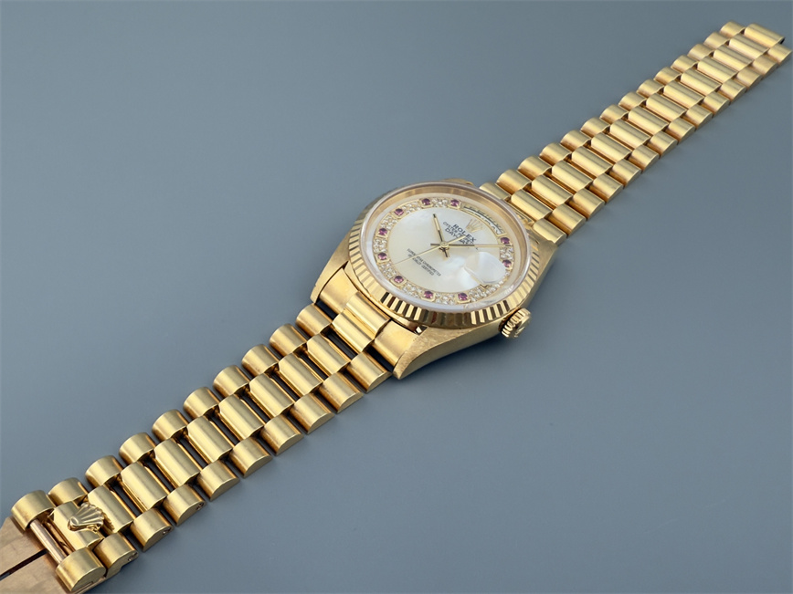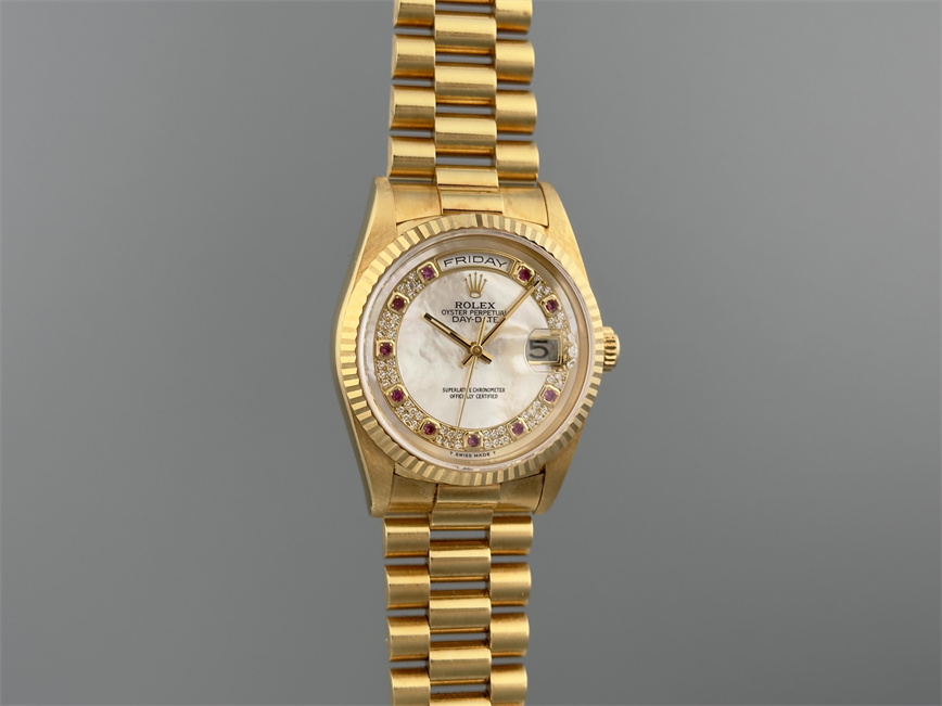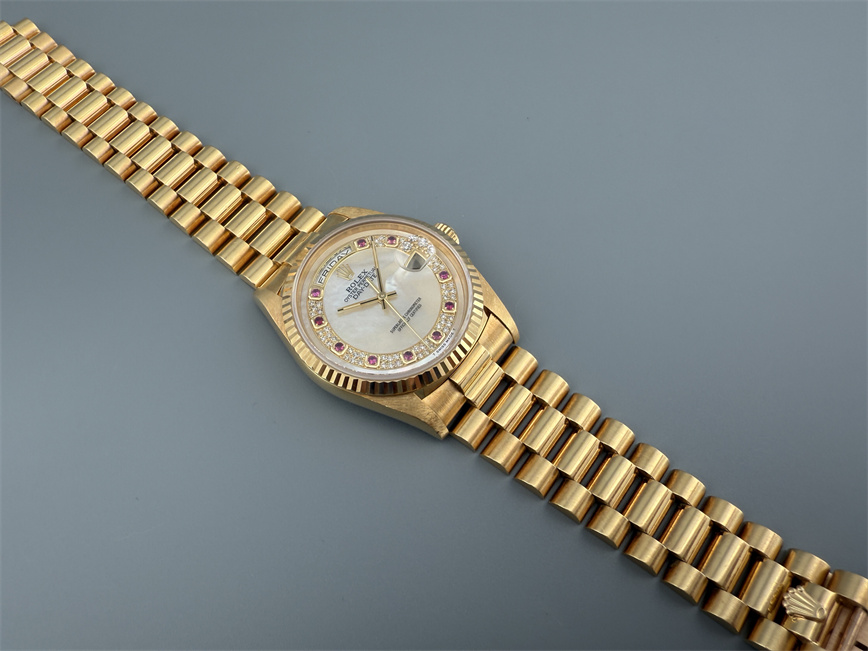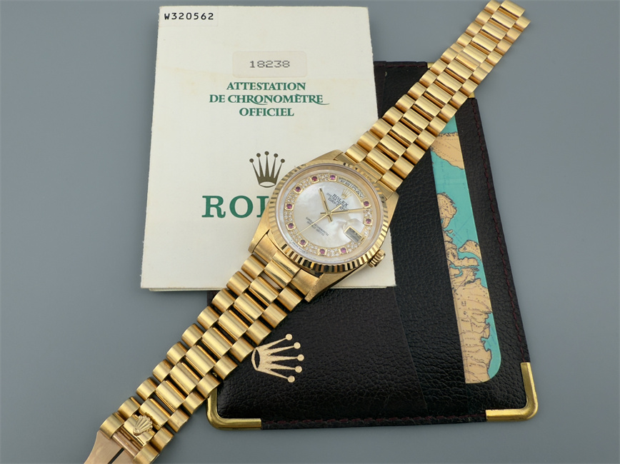 劳力士Ref.18238, 蚝式恒动Day-Date腕表,口径36mm。黄金表壳,贝母面,红宝石时标,中心秒针,星期和日历显示,自动机芯Cal. 3155,黄金President链带,劳力士logo折叠表扣,附原盒证书。