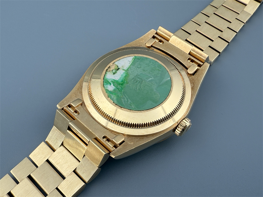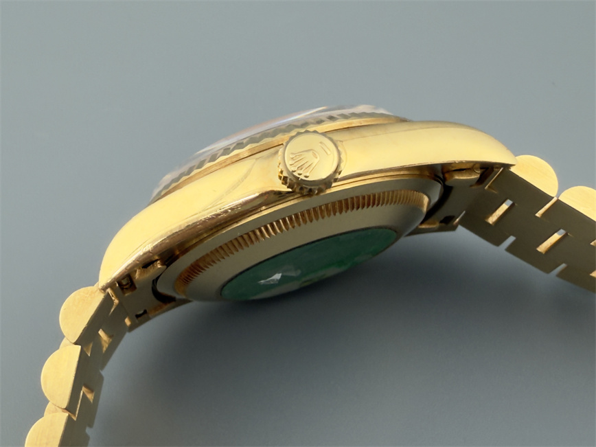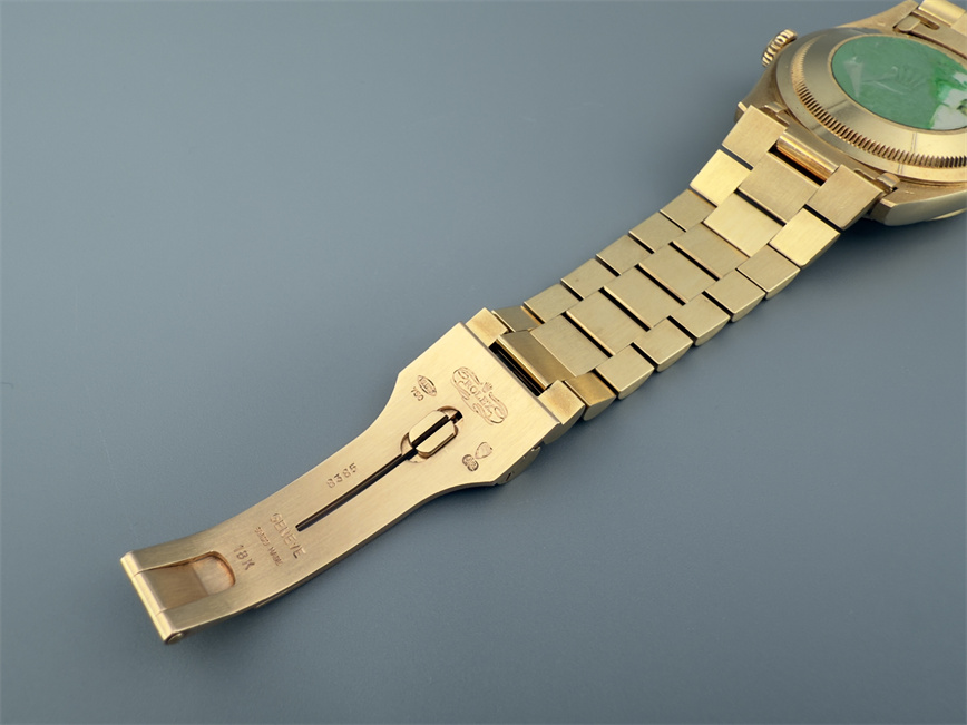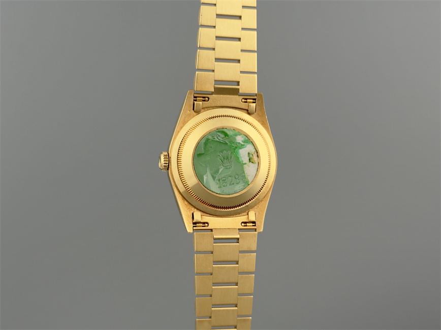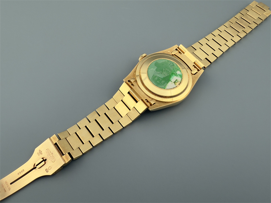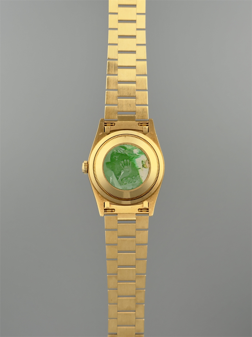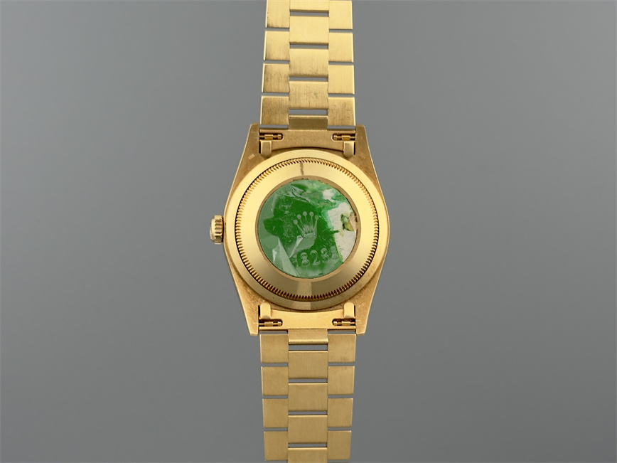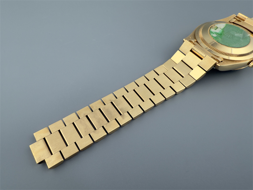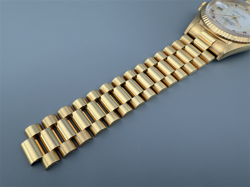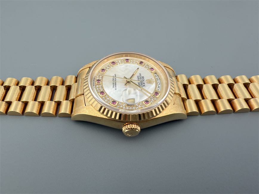 劳力士Ref.18238, 蚝式恒动Day-Date腕表,口径36mm。黄金表壳,贝母面,红宝石时标,中心秒针,星期和日历显示,自动机芯Cal. 3155,黄金President链带,劳力士logo折叠表扣,附原盒证书。
