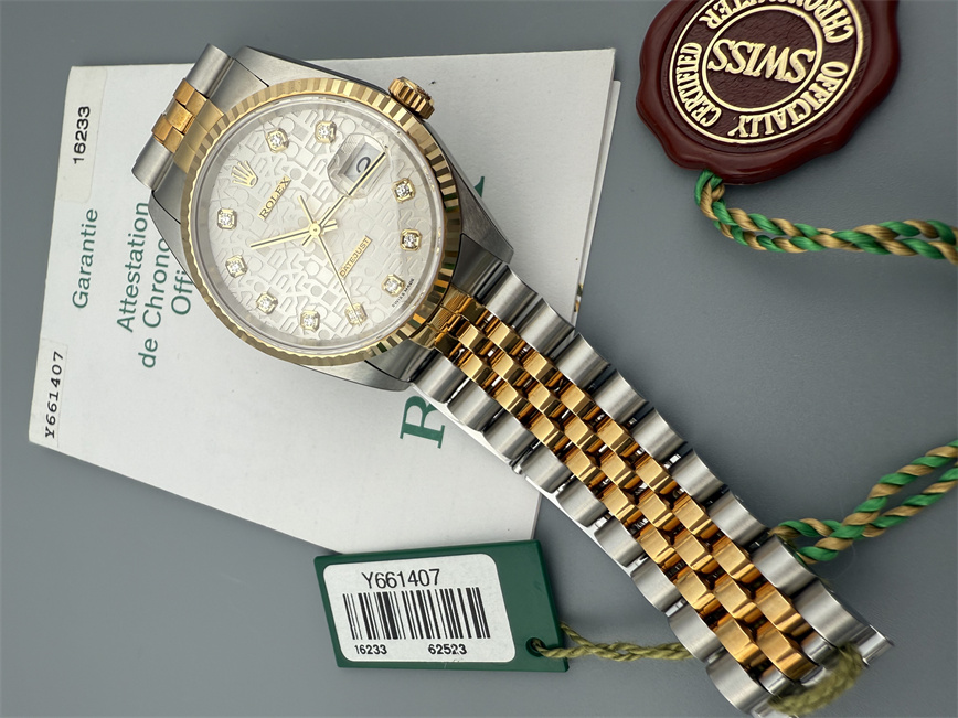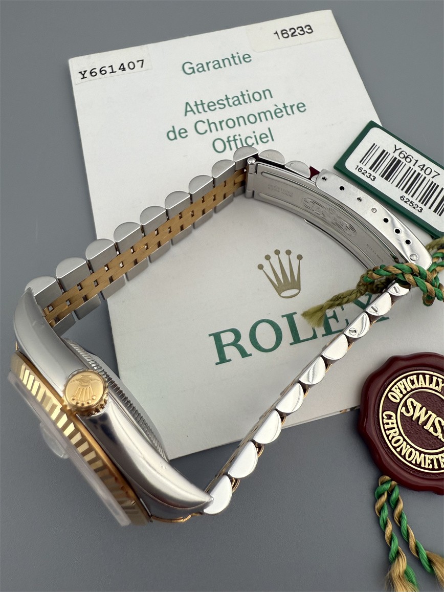 劳力士Ref.16233, 蚝式恒动Day-Date腕表,口径36mm。钢间金表壳,电脑面,钻石时标,中心秒针,星期和日历显示,自动机芯,President链带,劳力士logo折叠表扣,全新库存,附原始证书及吊牌。