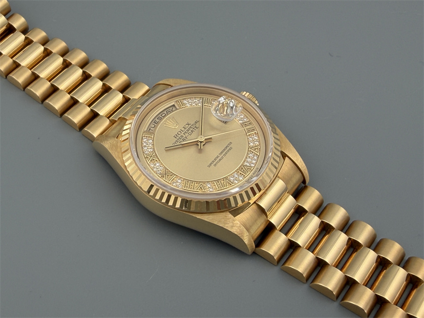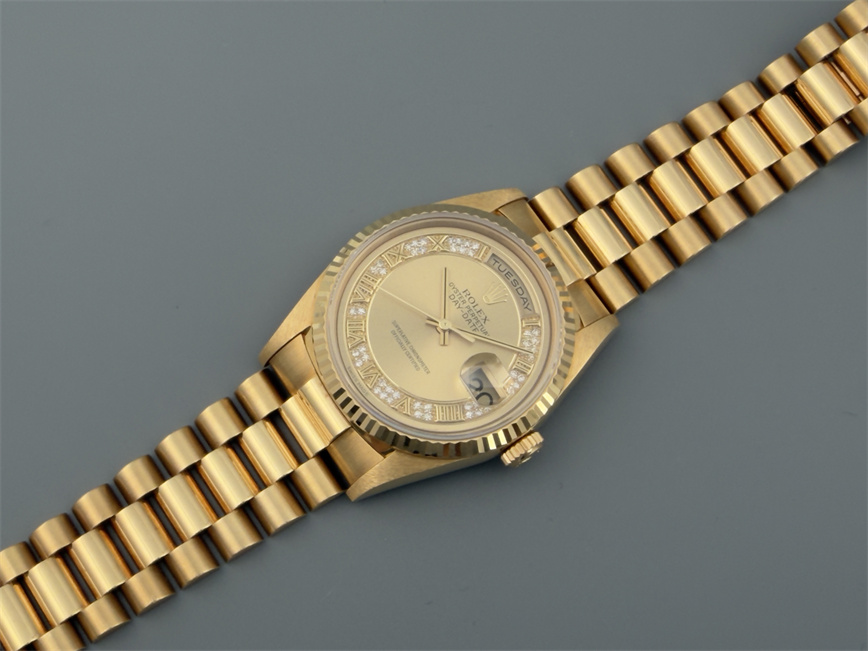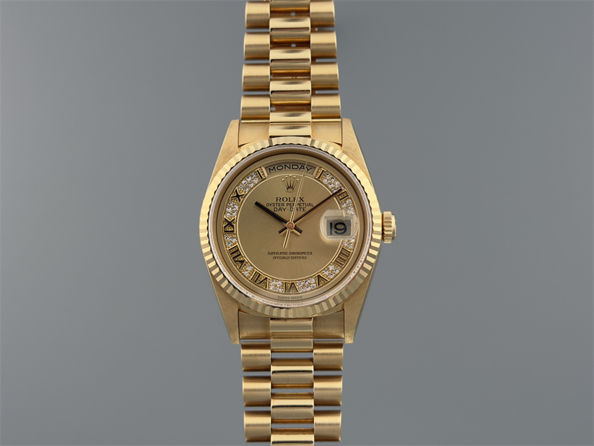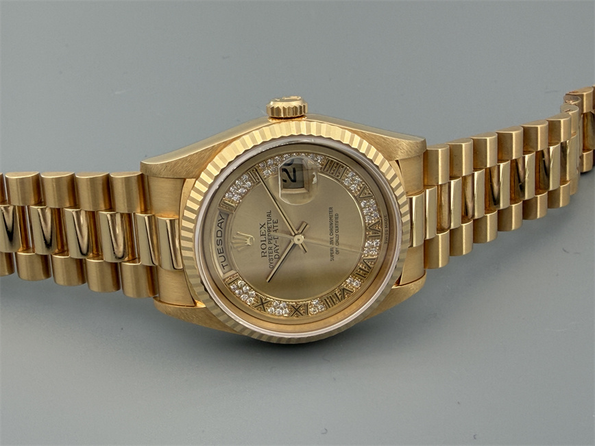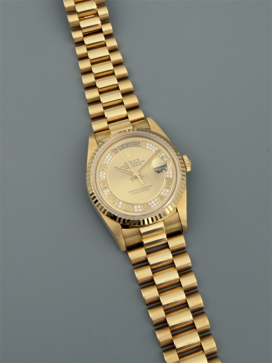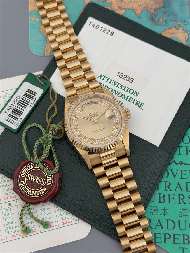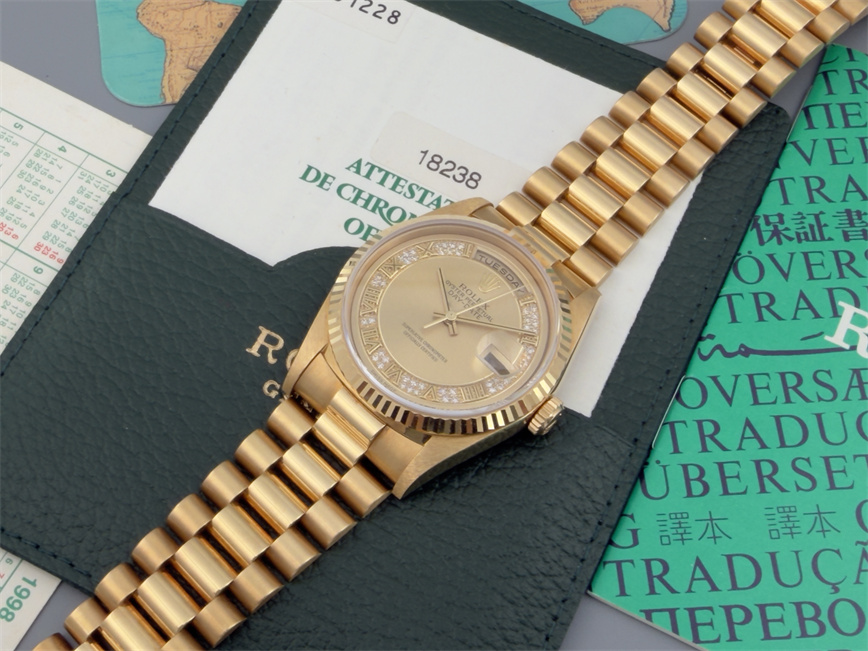 劳力士18238,Day-Date,约1999年,口径36毫米,18k黄金表壳和链带,金色盘面,金质罗马字时标,时标之间镶嵌钻石,中心秒针,星期和日历显示,自动机芯3155,附原始保卡。