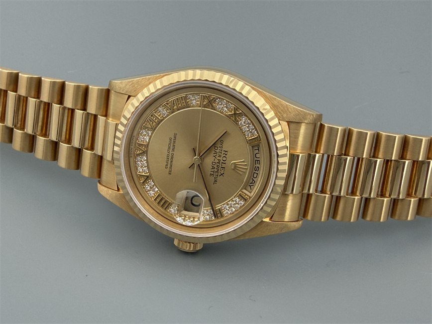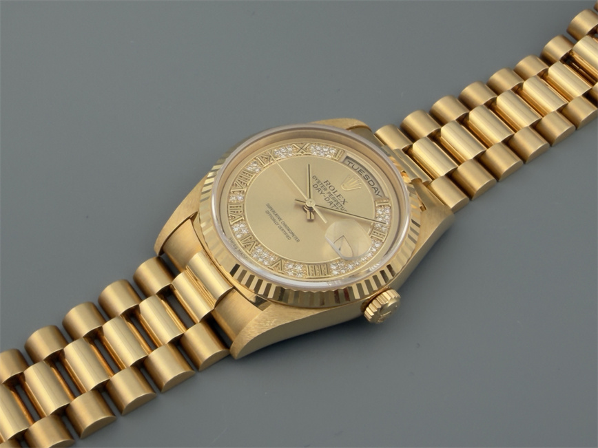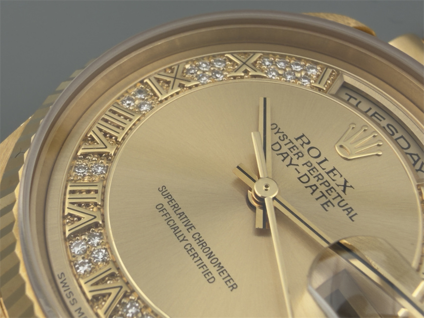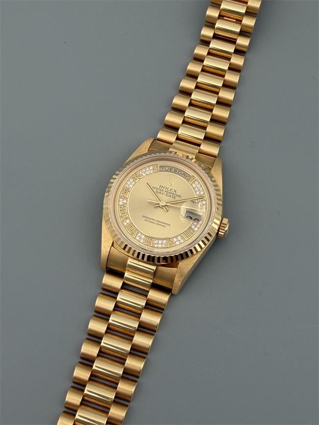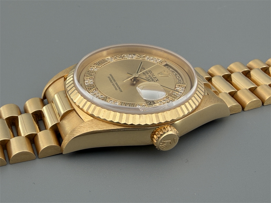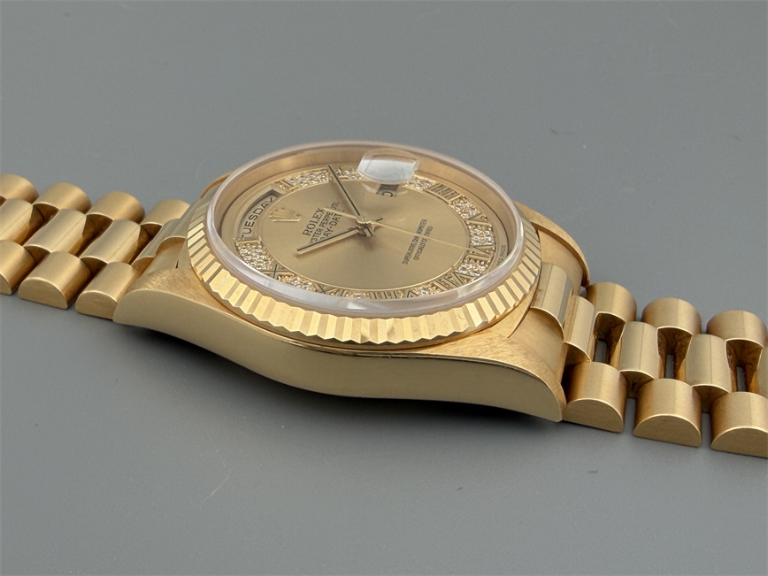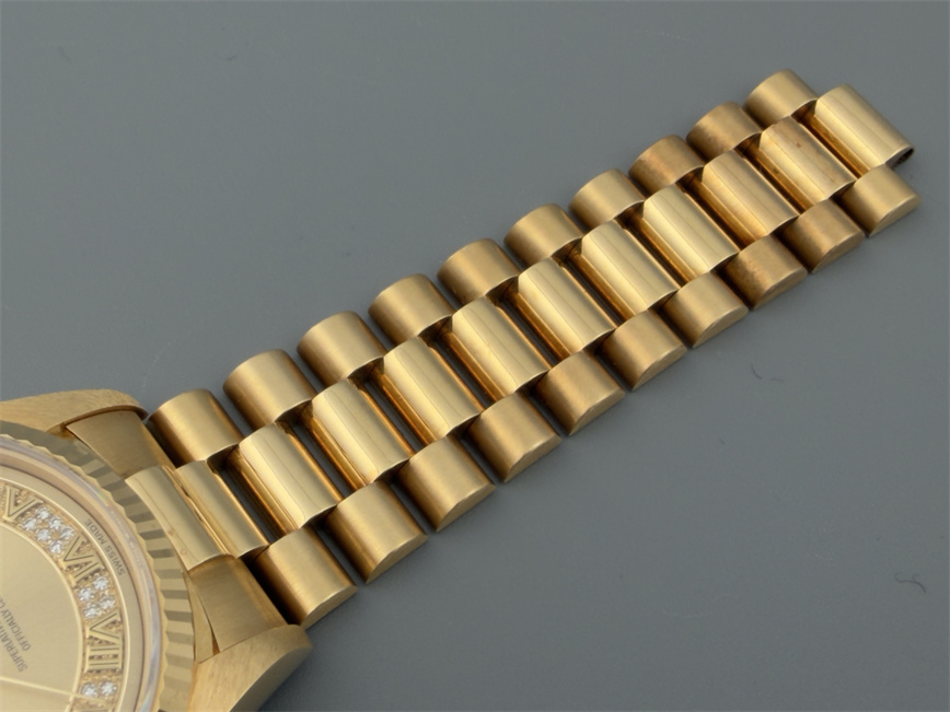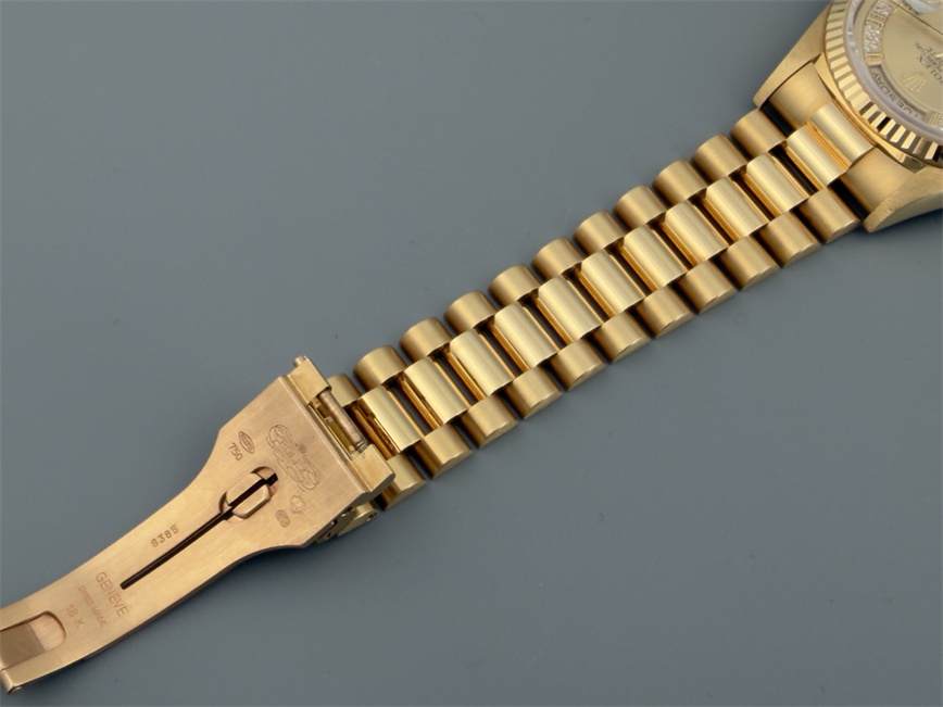 劳力士18238,Day-Date,约1999年,口径36毫米,18k黄金表壳和链带,金色盘面,金质罗马字时标,时标之间镶嵌钻石,中心秒针,星期和日历显示,自动机芯3155,附原始保卡。