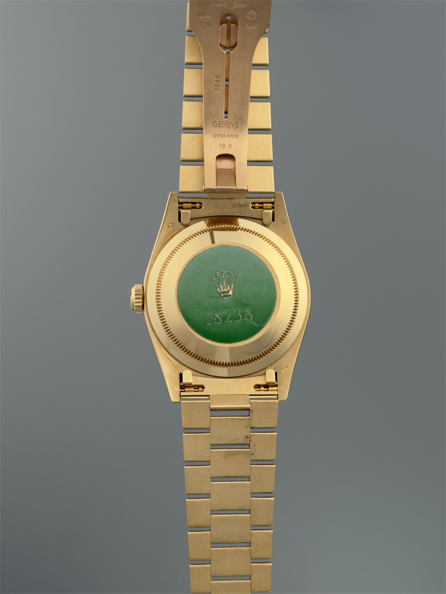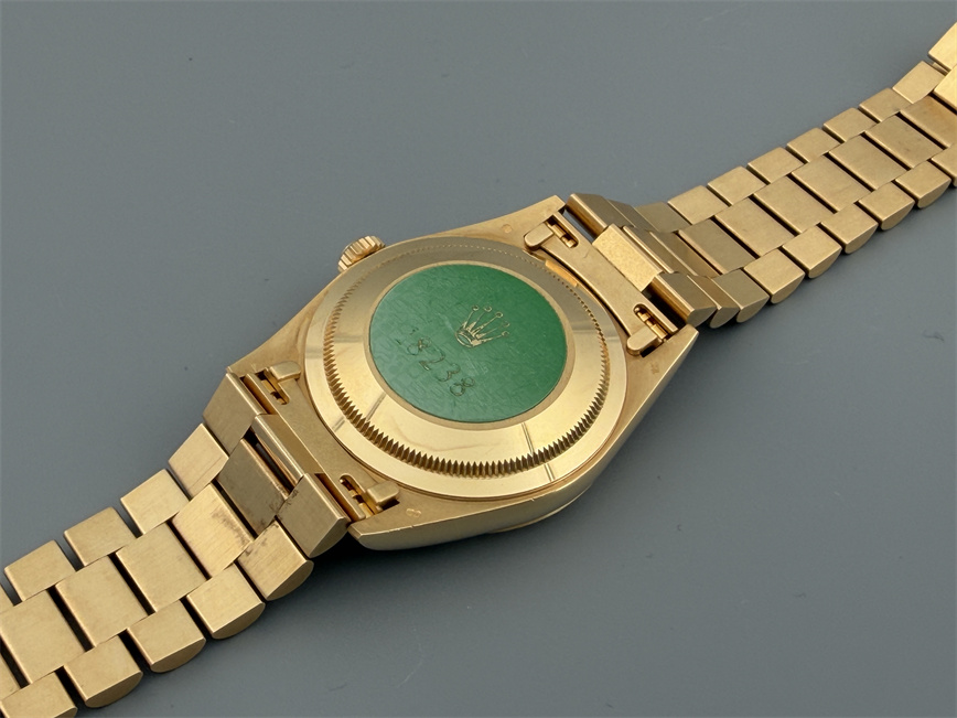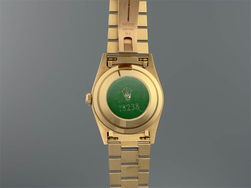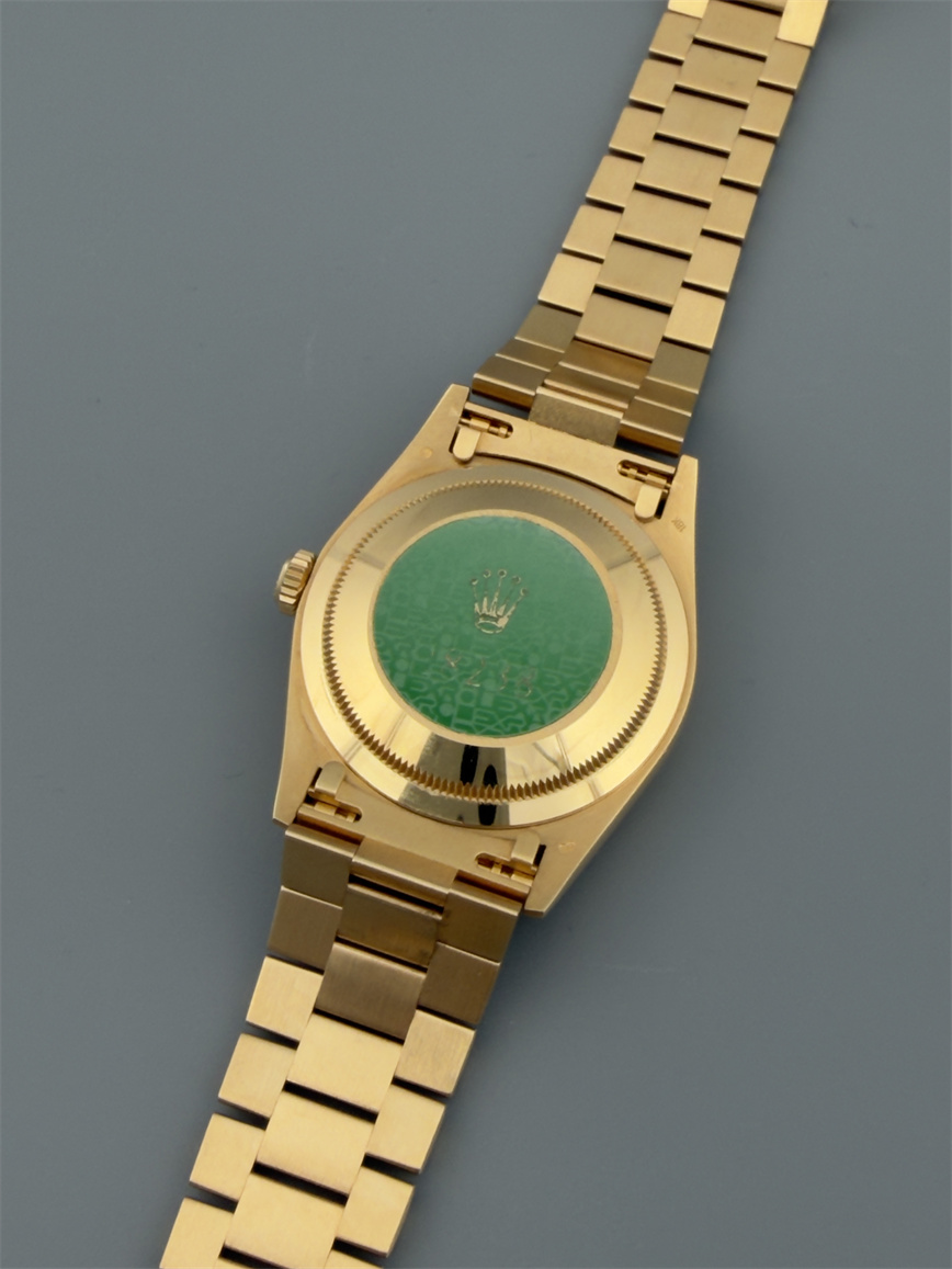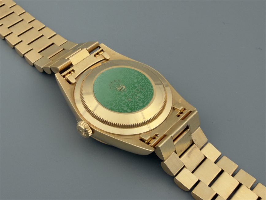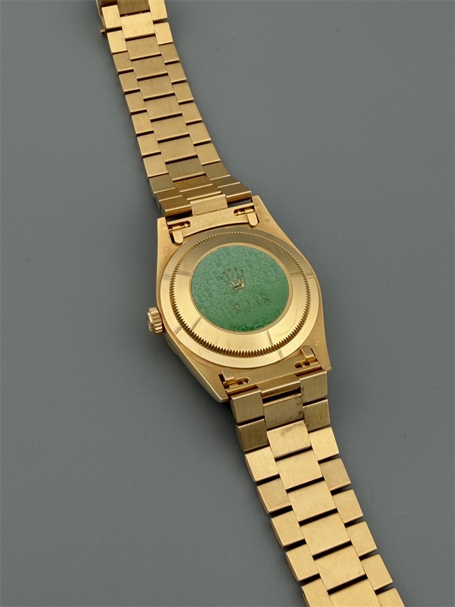 劳力士18238,Day-Date,约1999年,口径36毫米,18k黄金表壳和链带,金色盘面,金质罗马字时标,时标之间镶嵌钻石,中心秒针,星期和日历显示,自动机芯3155,附原始保卡。