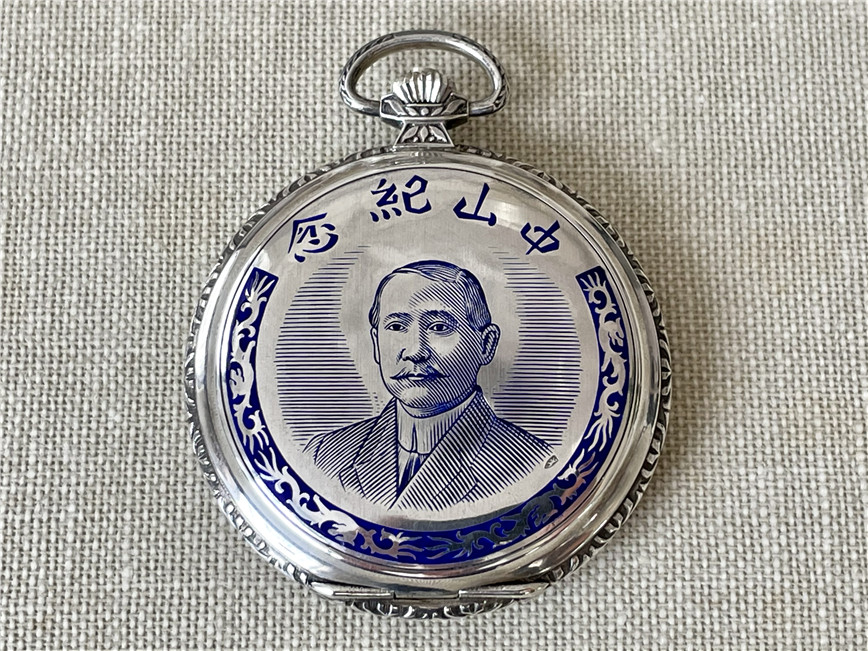 “中山纪念”,银材质怀表一对,约1920年代,口径45mm,附原装盒。无钥上链超薄猎表,表壳以蓝色珐琅描绘孙中山半身像,及“中山纪念”,另一面为珐琅描绘的中华民国国旗“青天白日满地红”、国民党党旗“青天白日旗”。表壳连续编号7992及7993。白色珐琅盘面,签名 “优马”,罗马字,小秒针,外圈分钟刻度,蓝钢梨形指针。机芯签名Cyma Tavannes,Ref.564K,镀铑,17石,杠杆擒纵,螺丝摆轮,宝玑游丝。