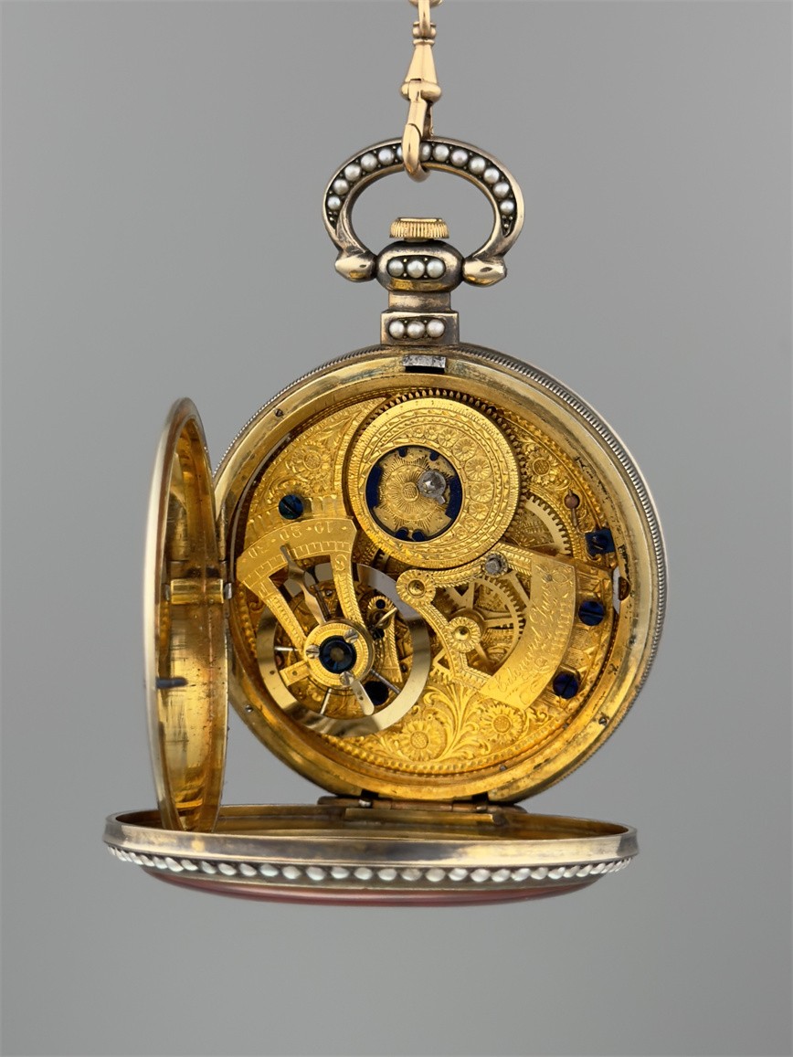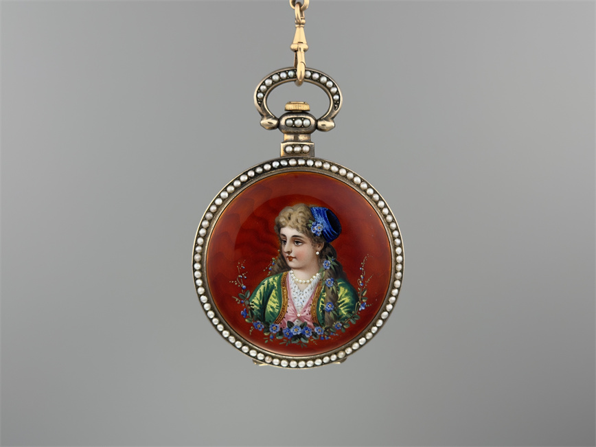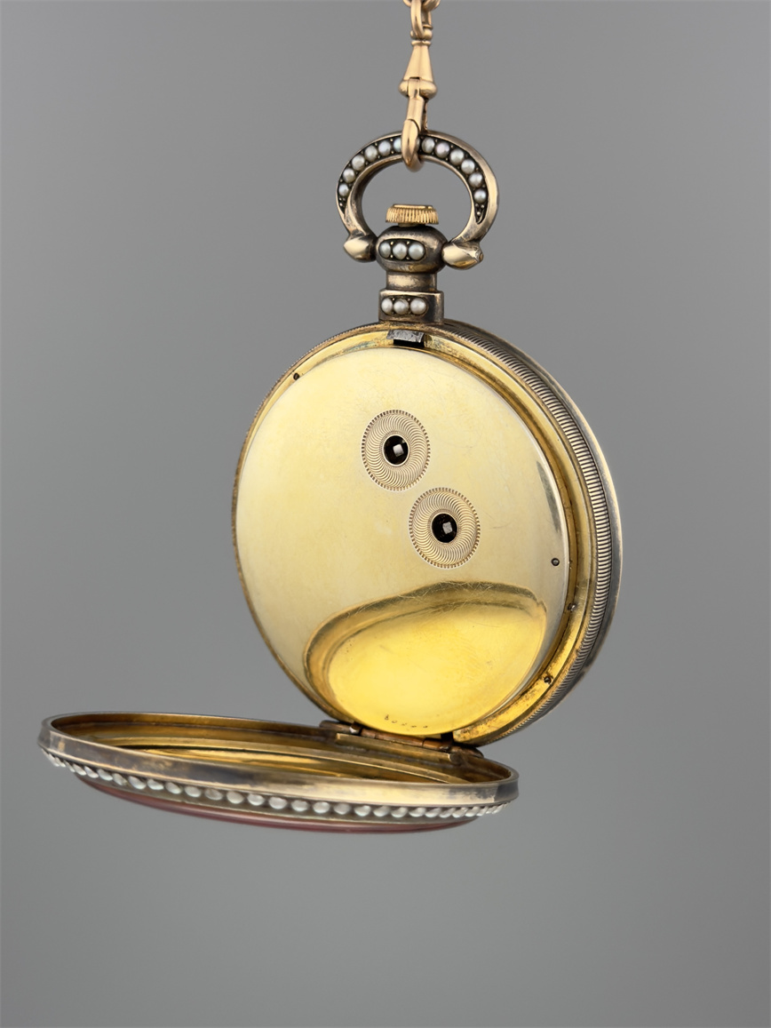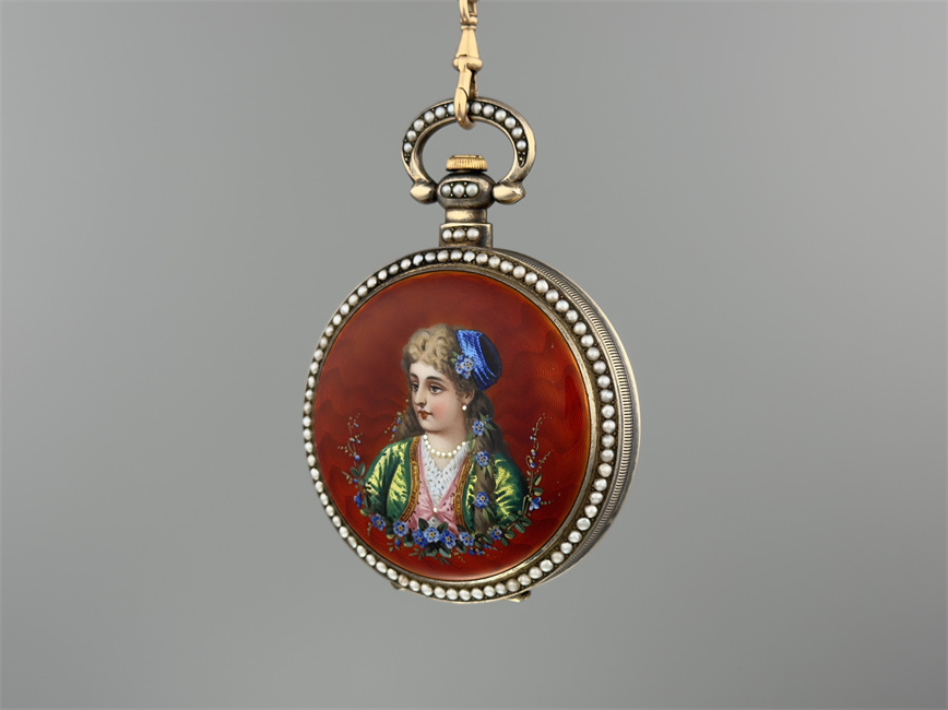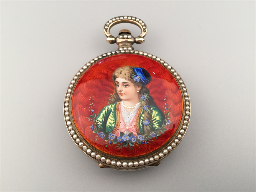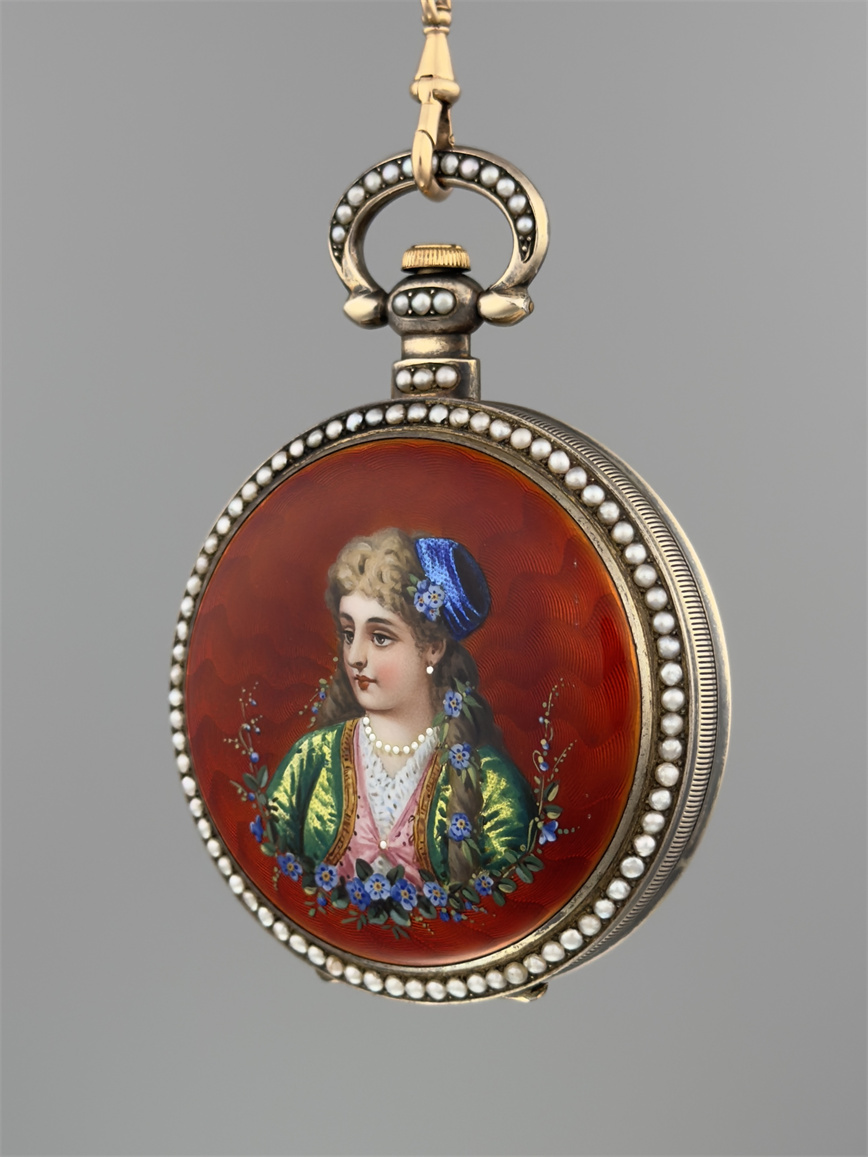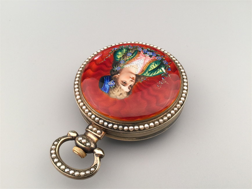 有喴珍珠珐琅中国市场怀表,签名Edouard Juvet, Fleurier。银镀金,口径58mm,142克,外壳描绘戴珍珠项链的盛装女士,以花卉纹围绕,背景半透明红色珐琅及机雕纹饰,表圈及表环镶嵌珍珠。白色珐琅盘面,中心秒针。钥匙上链,中国市场机芯,双联擒纵机构,签名Edouard Juvet。
