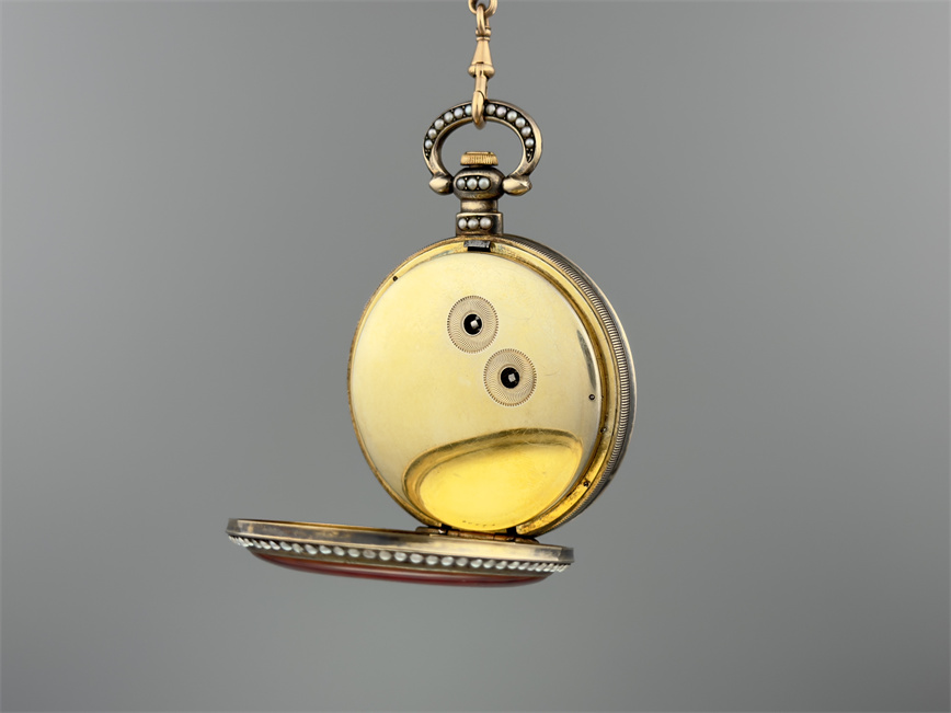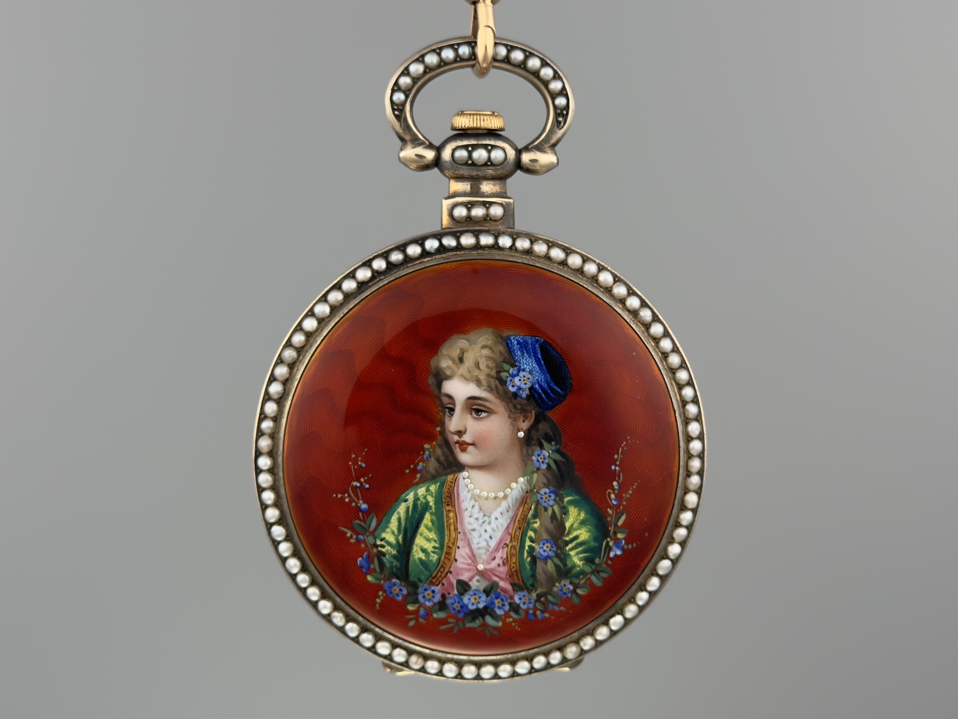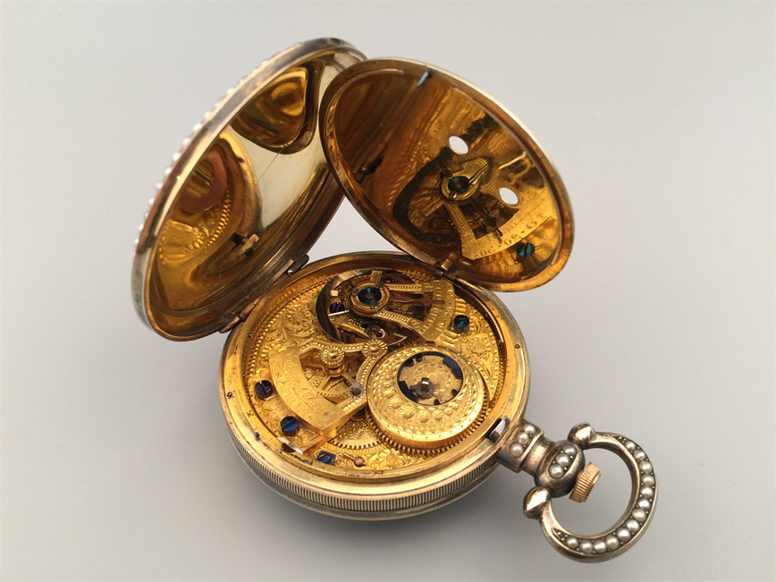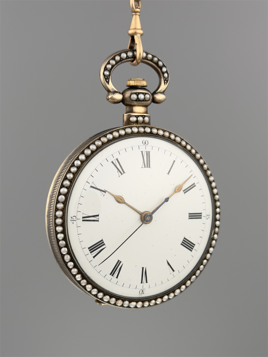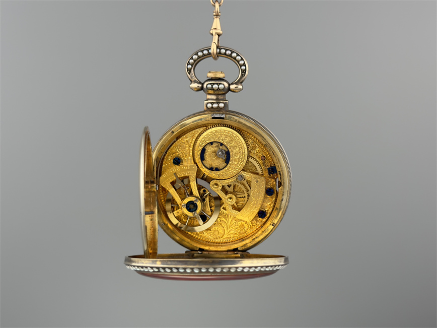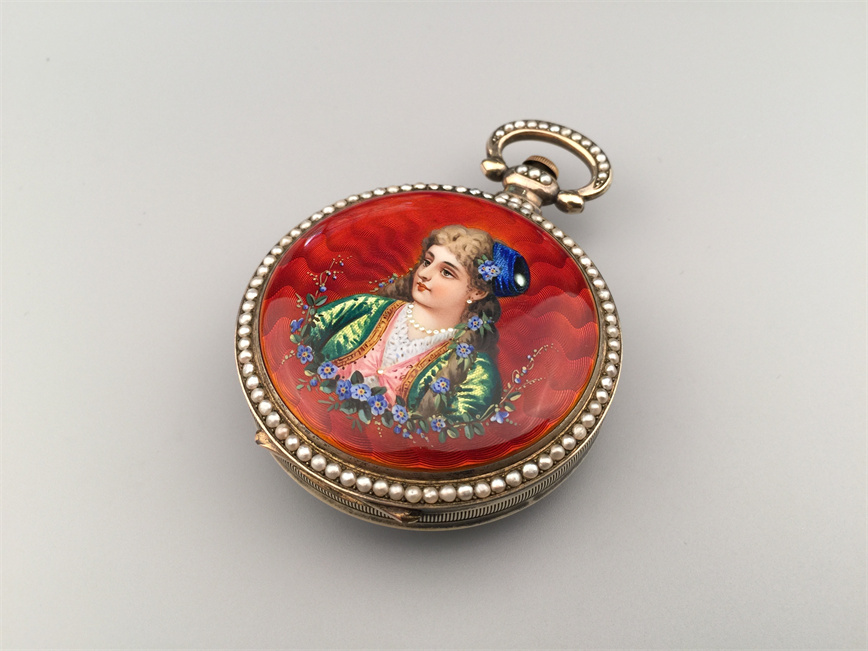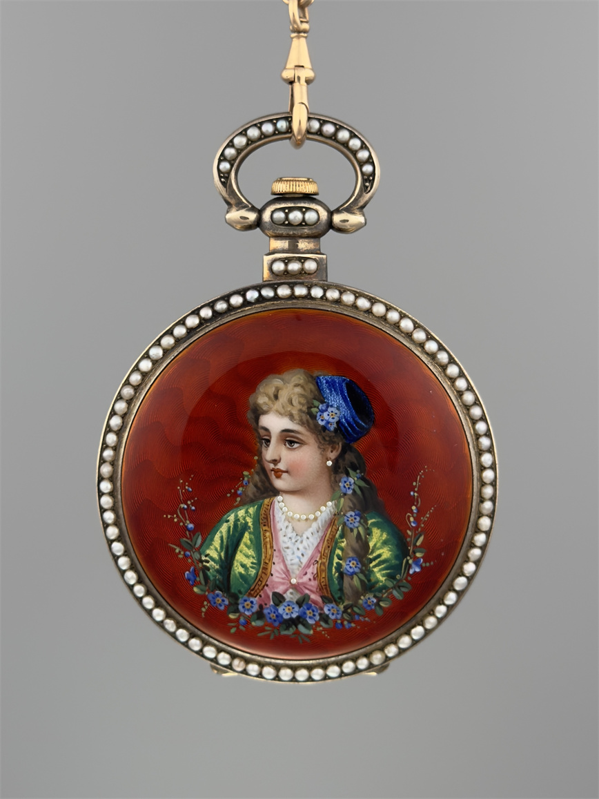 有喴珍珠珐琅中国市场怀表,签名Edouard Juvet, Fleurier。银镀金,口径58mm,142克,外壳描绘戴珍珠项链的盛装女士,以花卉纹围绕,背景半透明红色珐琅及机雕纹饰,表圈及表环镶嵌珍珠。白色珐琅盘面,中心秒针。钥匙上链,中国市场机芯,双联擒纵机构,签名Edouard Juvet。