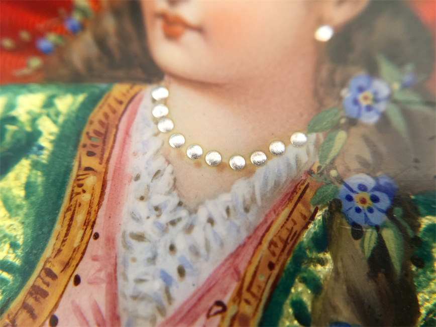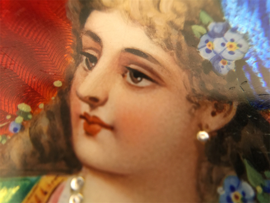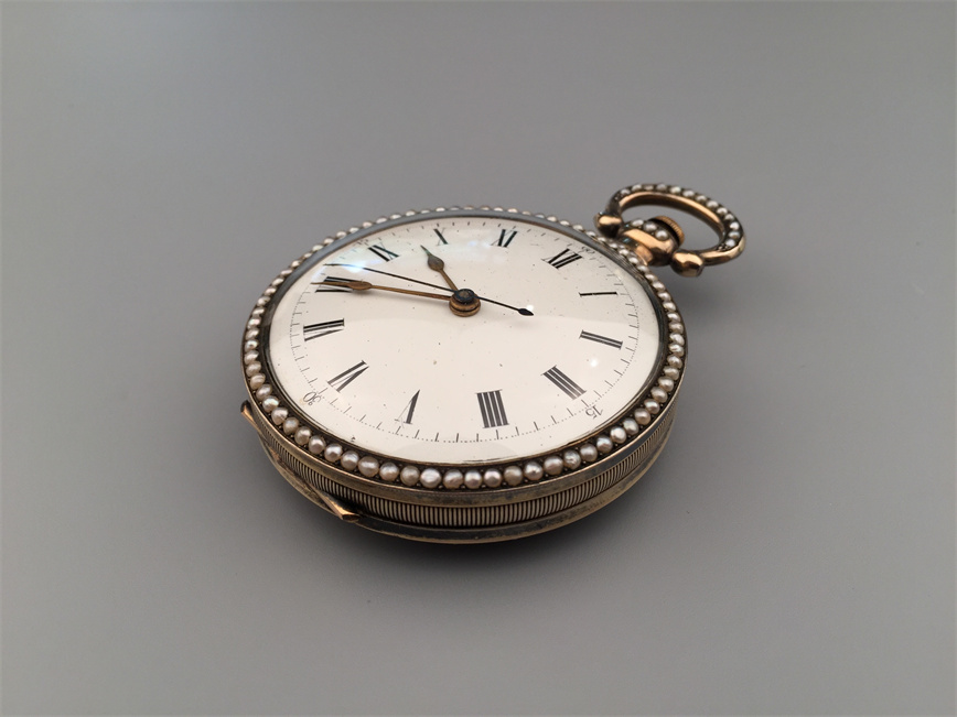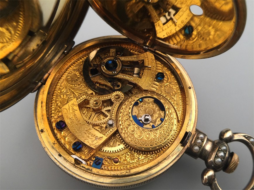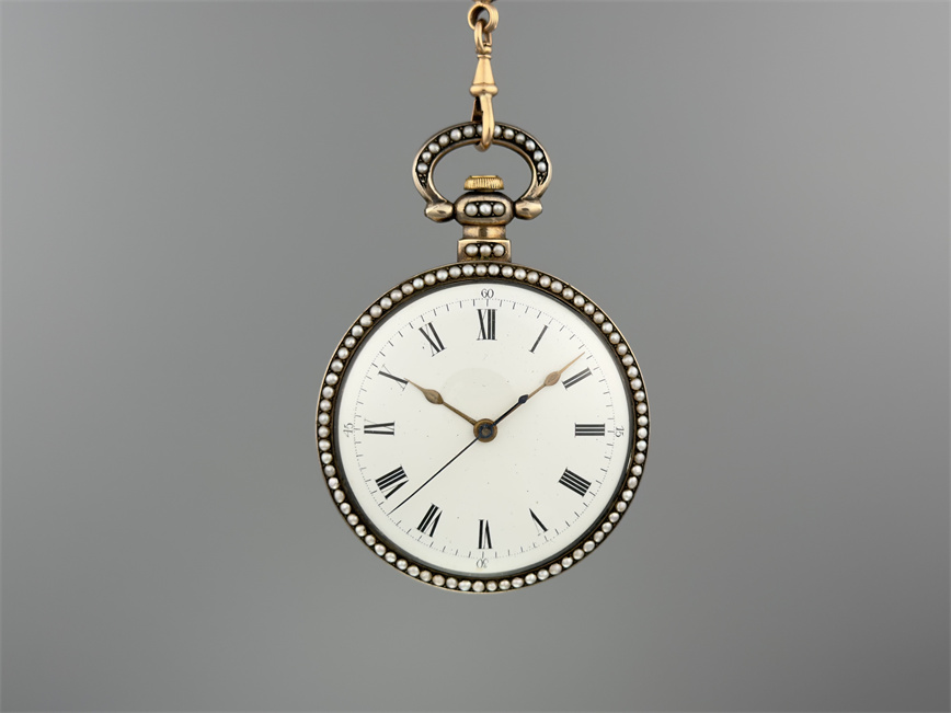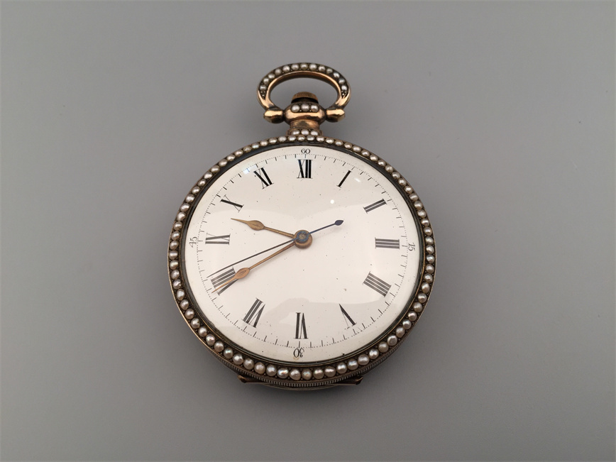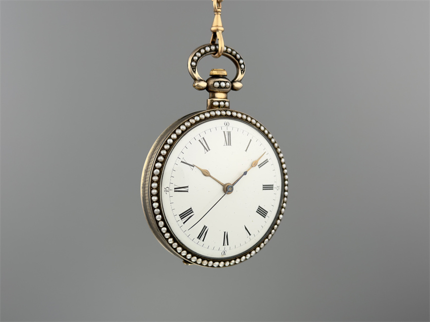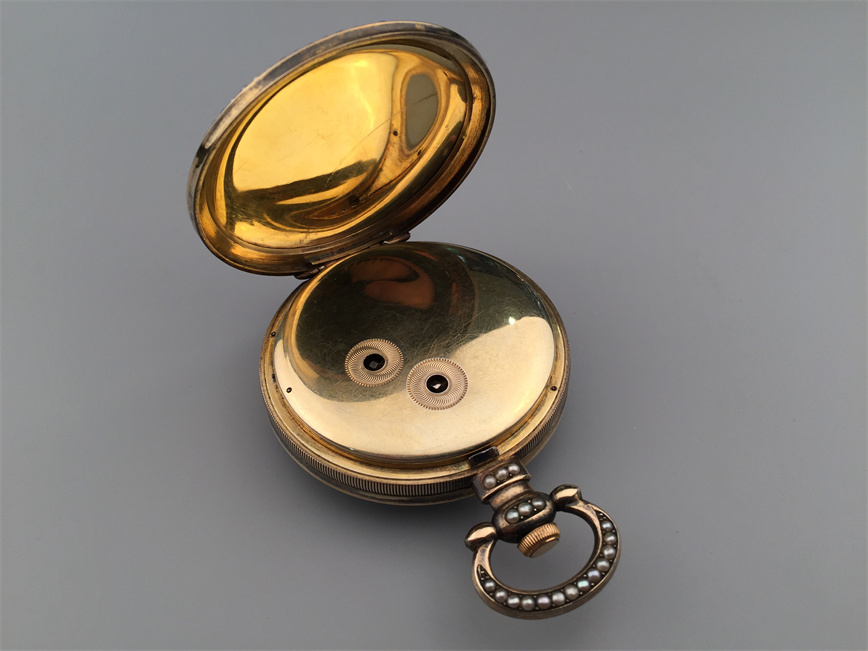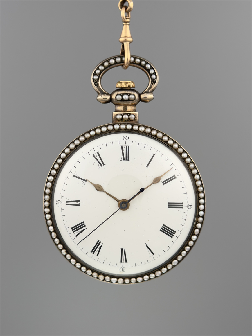 有喴珍珠珐琅中国市场怀表,签名Edouard Juvet, Fleurier。银镀金,口径58mm,142克,外壳描绘戴珍珠项链的盛装女士,以花卉纹围绕,背景半透明红色珐琅及机雕纹饰,表圈及表环镶嵌珍珠。白色珐琅盘面,中心秒针。钥匙上链,中国市场机芯,双联擒纵机构,签名Edouard Juvet。