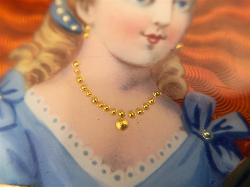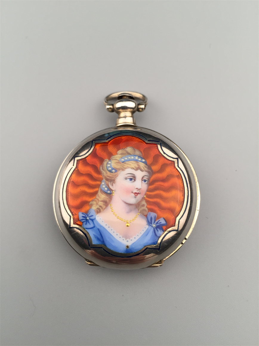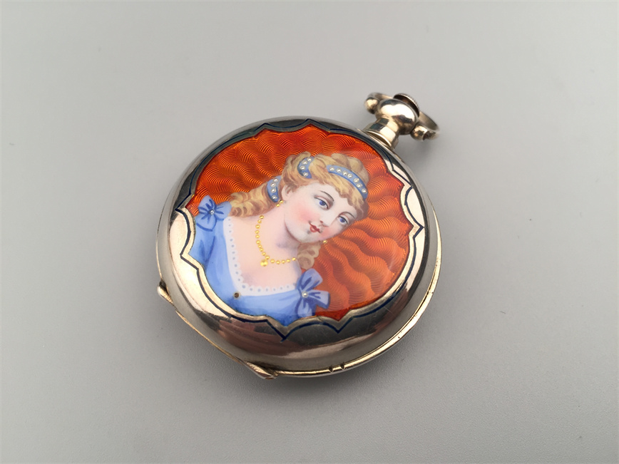 有喴开面怀表,银材质,口径39mm,外壳和机芯铭刻“有喴”,红色珐琅背景,描绘戴金项链的蓝衣淑女,罗马字,中心秒针,为中国市场制作。