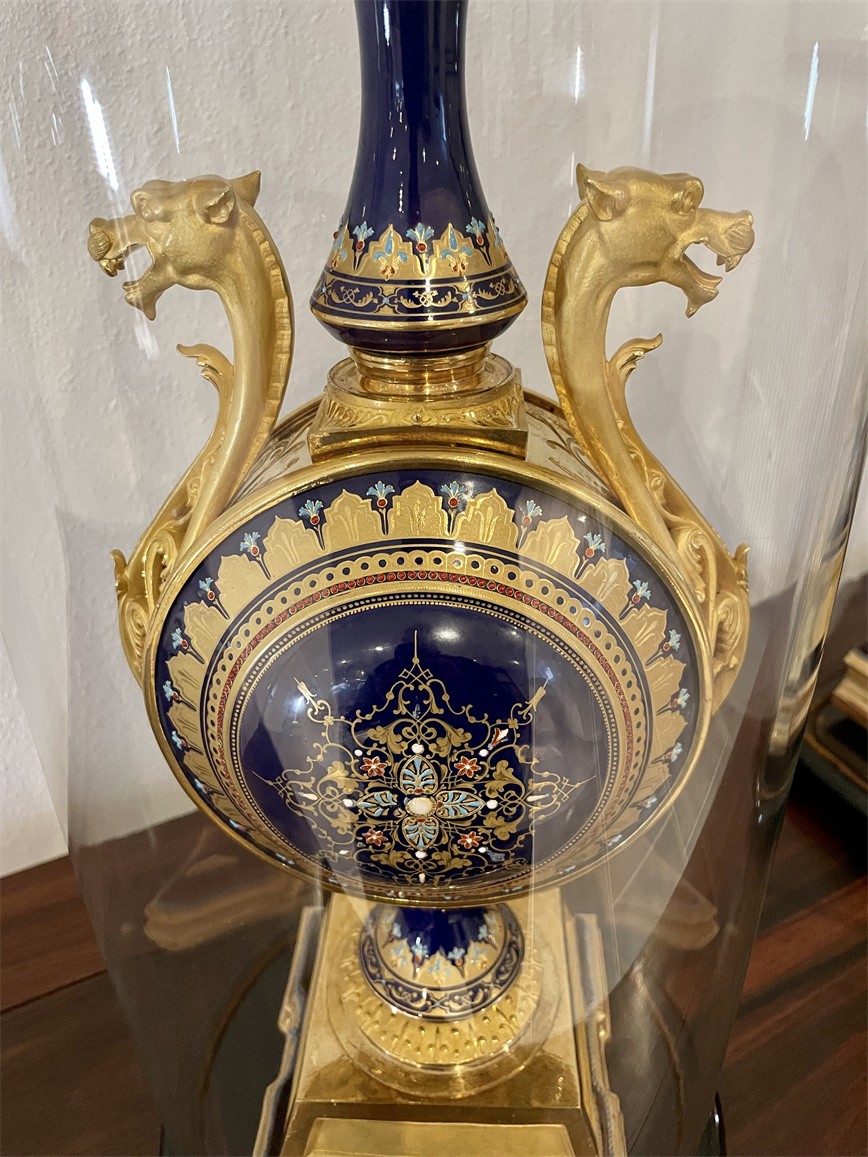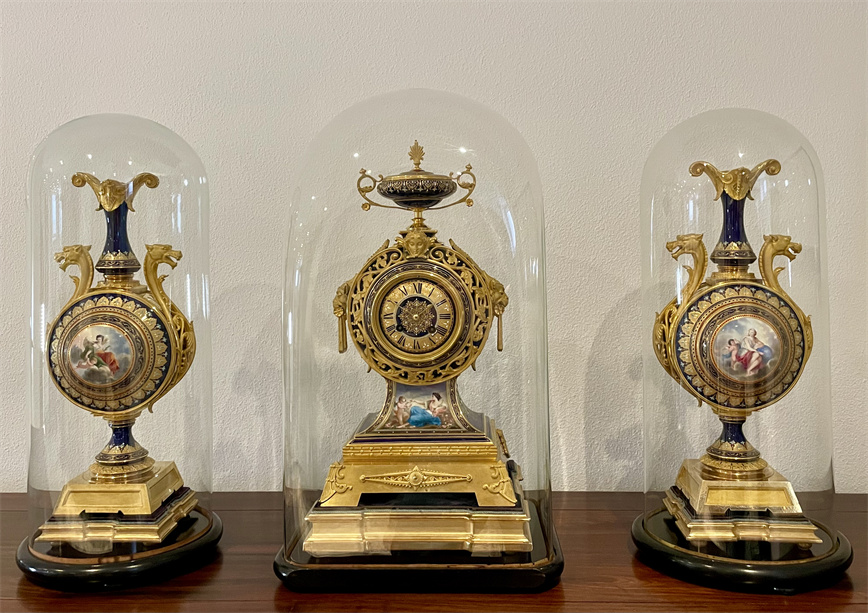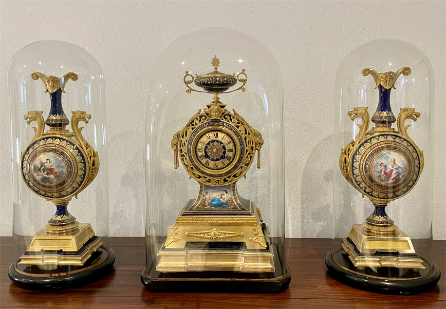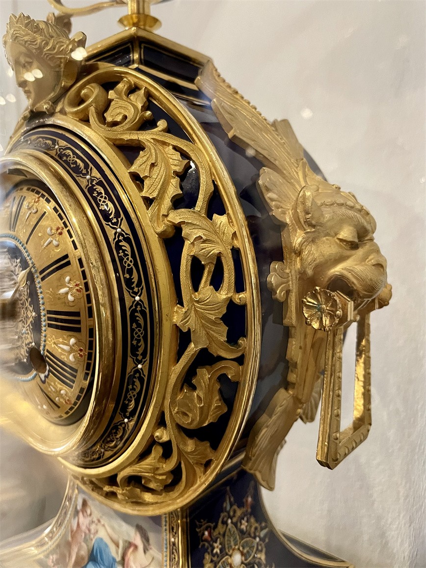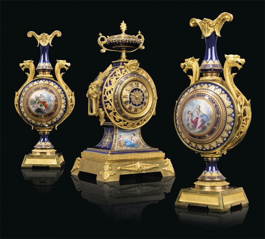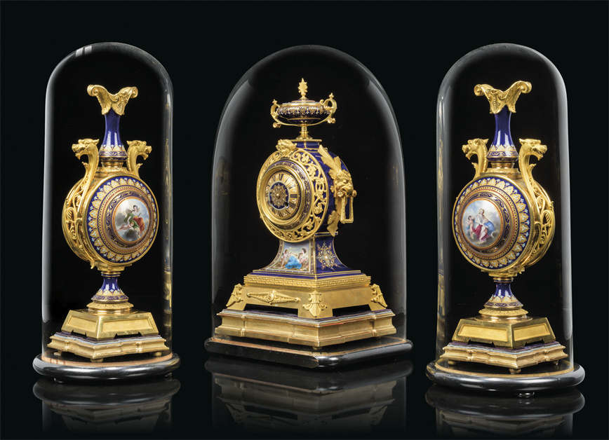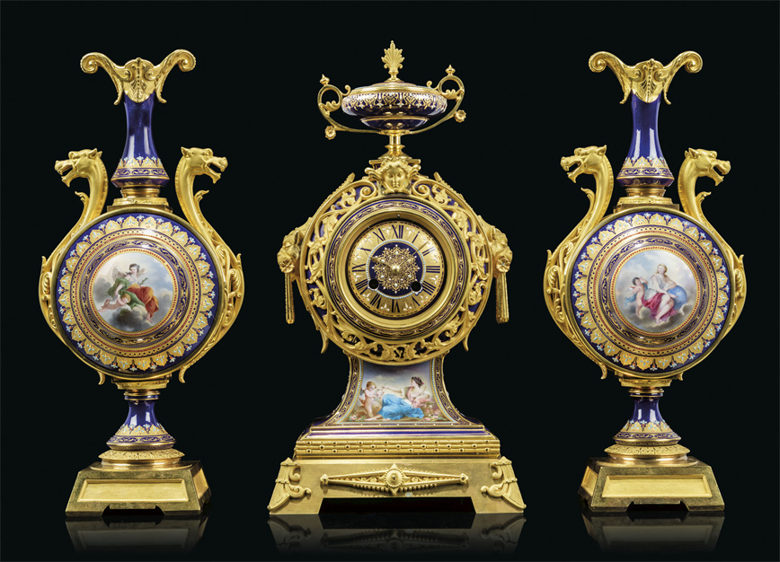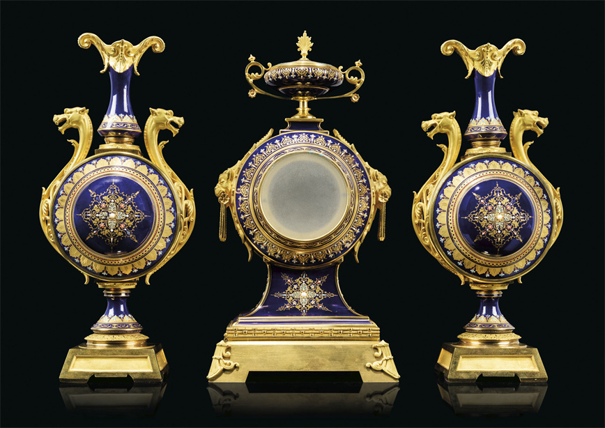 保存完美,馆级品质的法国Sèvres钴蓝色磨光瓷胎珐琅三件式座钟。1850-1870年代,这套精致罕有的重要法国皇家名瓷座钟包括一个时钟和一对花瓶;Ormolu镀金,座钟底部装饰一幅精心绘制的维纳斯和丘比特的肖像,带有 Japy Frères 双发条盒敲击式机芯,花瓶以喀迈拉神兽镀金式把手装饰,鼓形主体,装饰主题Victory and Uranus。每件均都带有紫色天鹅绒镀金木底座和乌木底座上的玻璃展示圆顶罩。