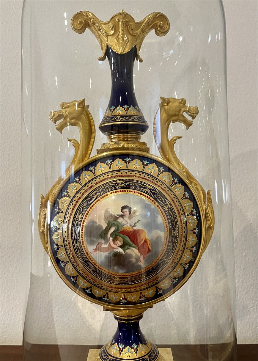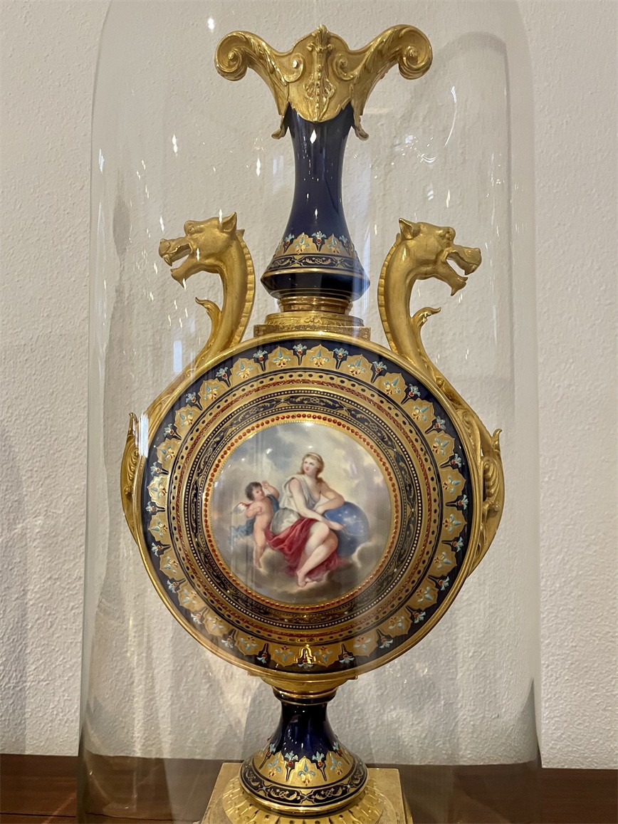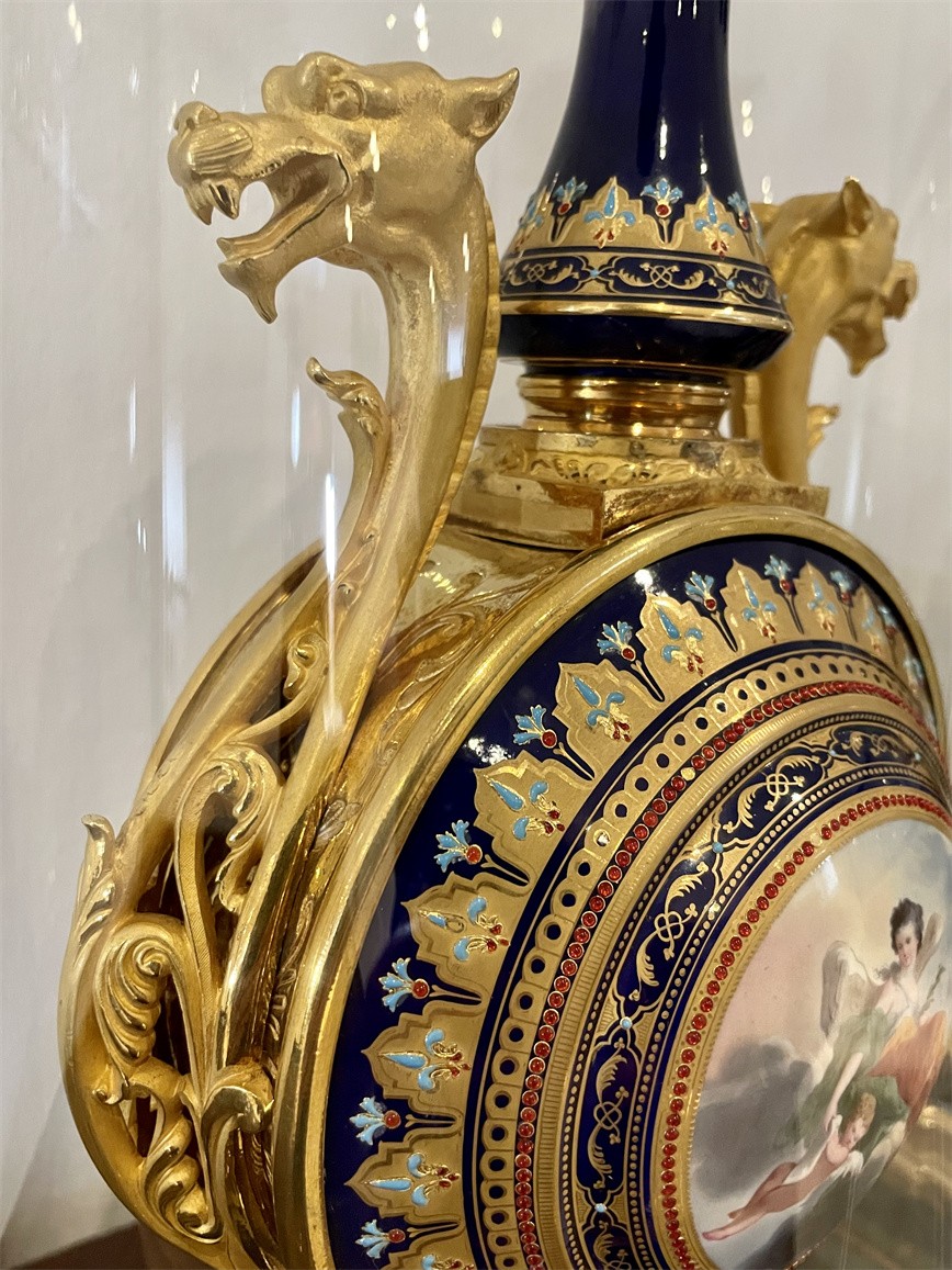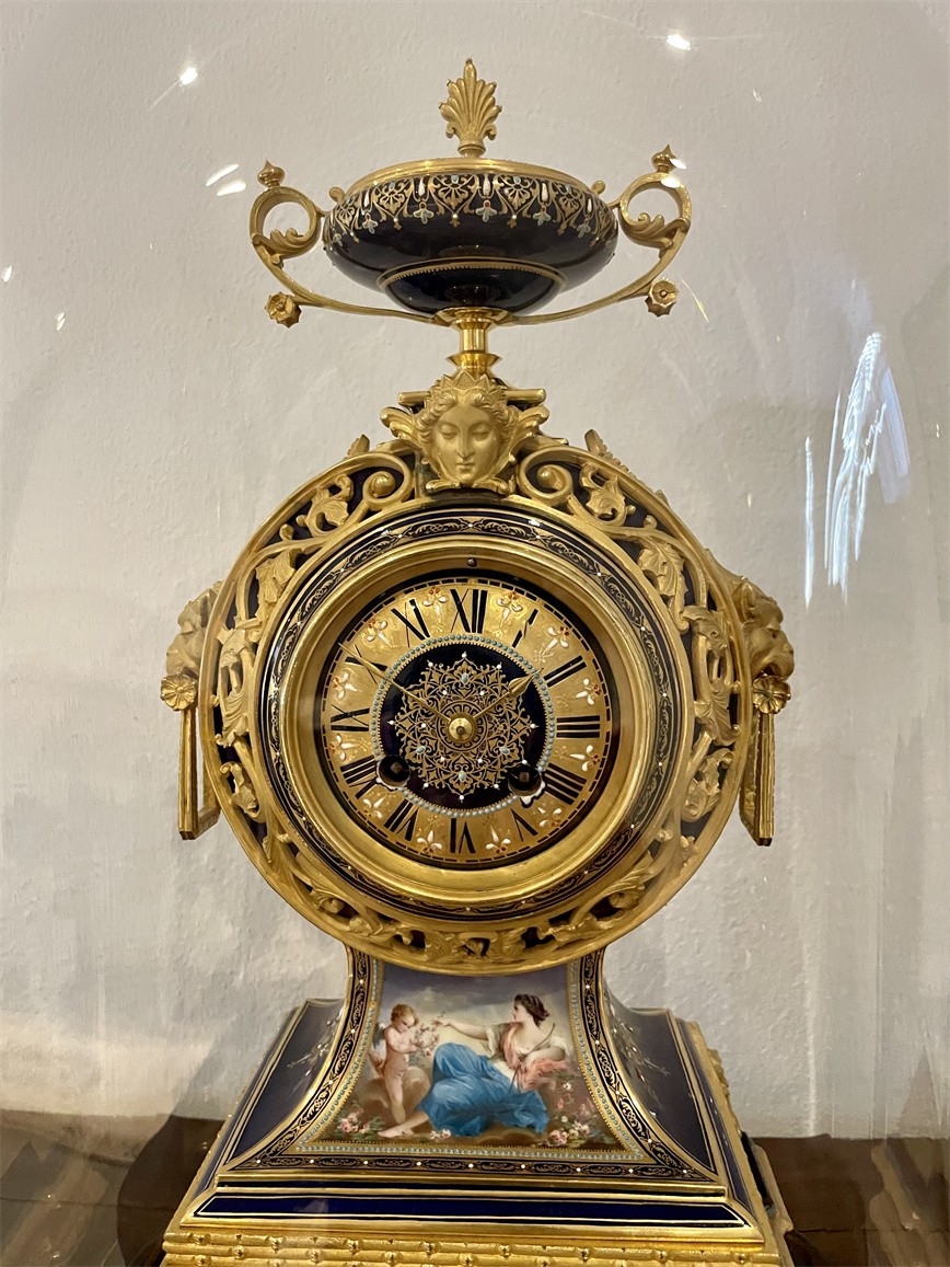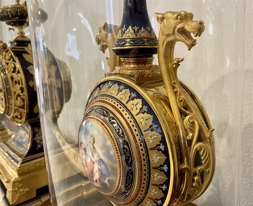 保存完美,馆级品质的法国Sèvres钴蓝色磨光瓷胎珐琅三件式座钟。1850-1870年代,这套精致罕有的重要法国皇家名瓷座钟包括一个时钟和一对花瓶;Ormolu镀金,座钟底部装饰一幅精心绘制的维纳斯和丘比特的肖像,带有 Japy Frères 双发条盒敲击式机芯,花瓶以喀迈拉神兽镀金式把手装饰,鼓形主体,装饰主题Victory and Uranus。每件均都带有紫色天鹅绒镀金木底座和乌木底座上的玻璃展示圆顶罩。
