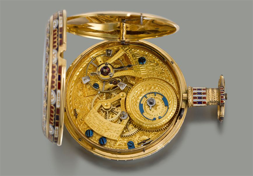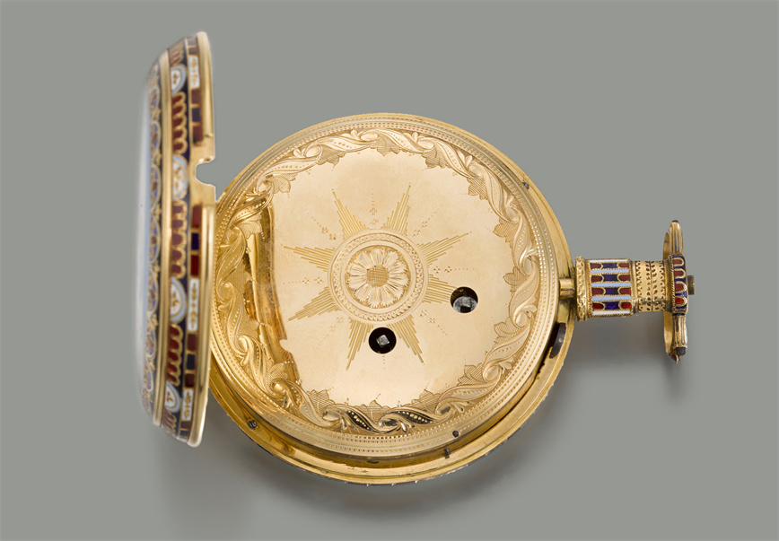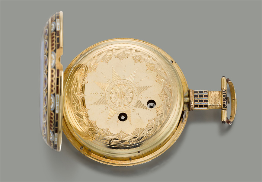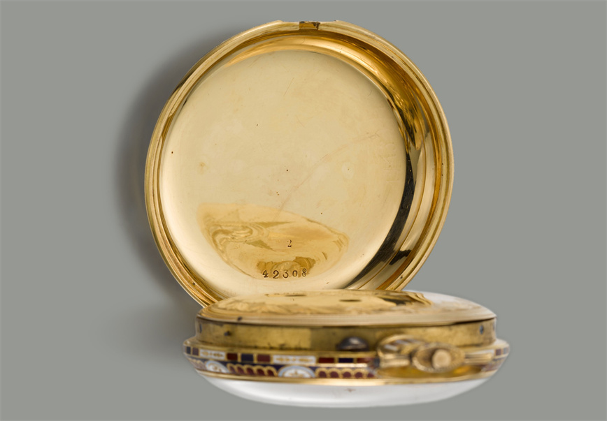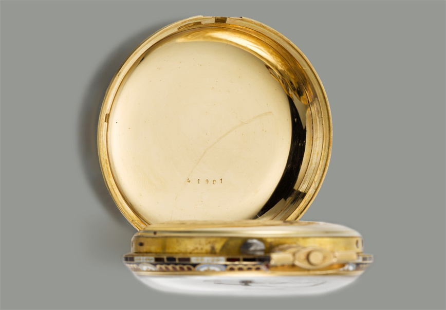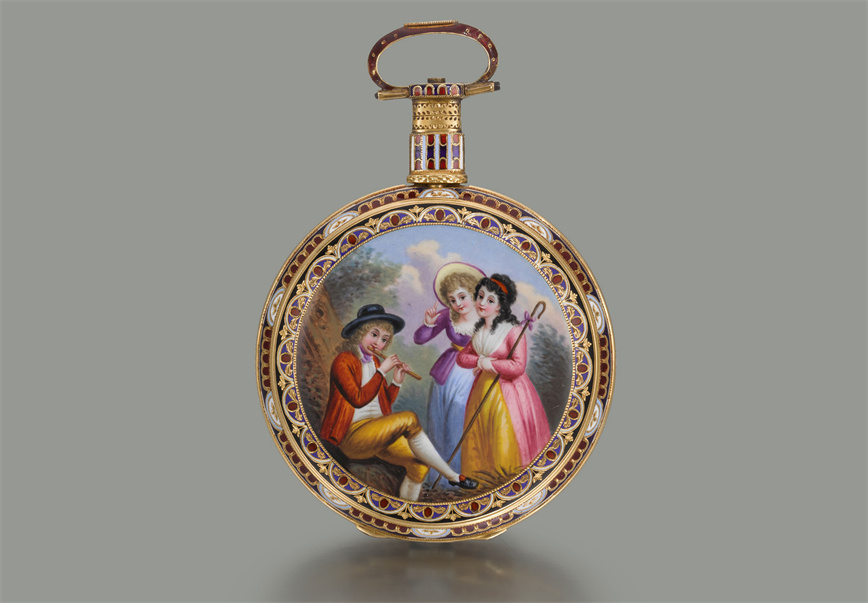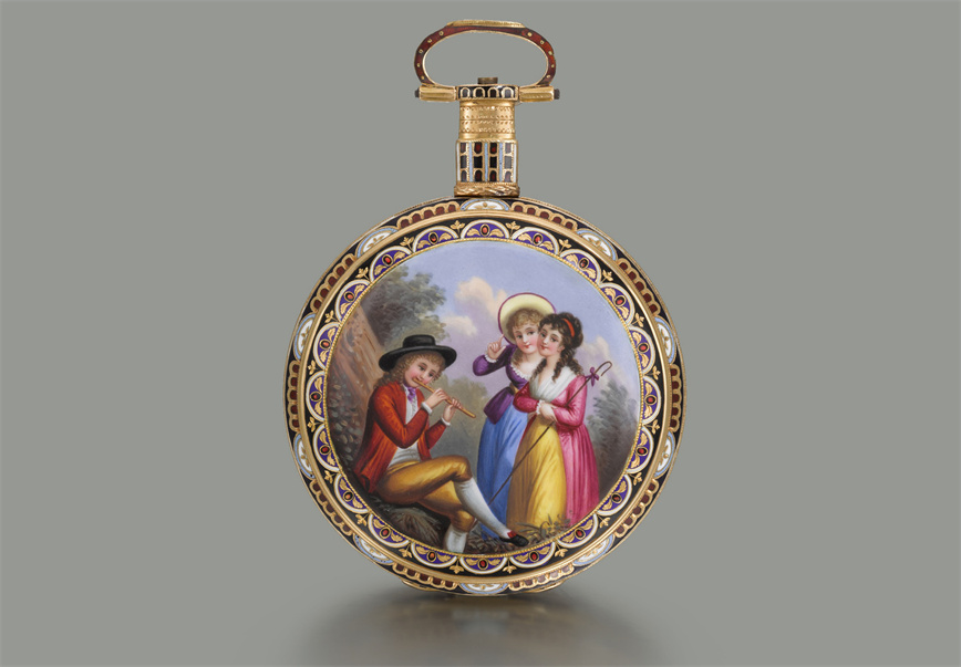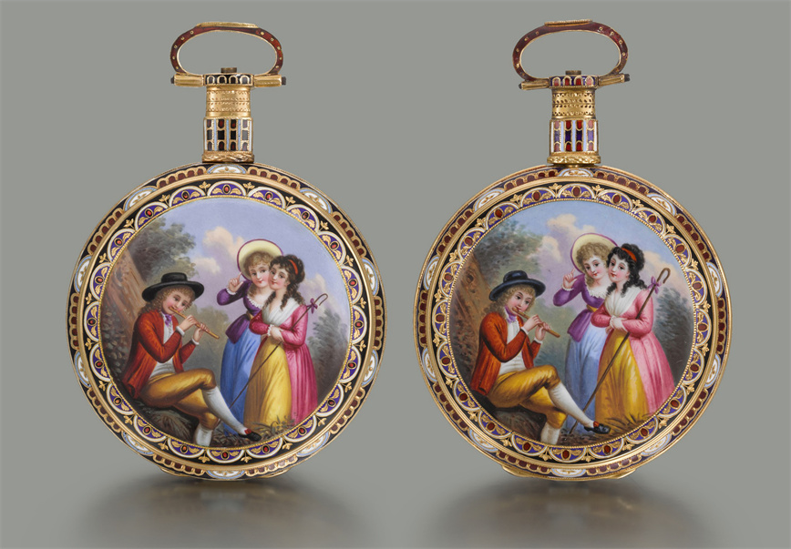 爱德华‧有喴EDOUARD JUVET,瑞士弗勒里耶,约1865年,对表“小夜曲”,口径59mm,黄金微绘珐琅古董怀表,为中国市场而制。镀金中国机芯,繁复华丽的雕刻装饰,中国式双联擒纵机构,钻石端石,签名Edouard Juvet, Fleurier。白色珐琅表盘,罗马数字,桃形指针,中央秒针,外圈分钟刻度,阿拉伯字刻钟刻度。黄金表壳,多色珐琅微绘,描绘吹笛的牧羊人和两位聆听的女士。表圈和表环上有多色珐琅装饰。
