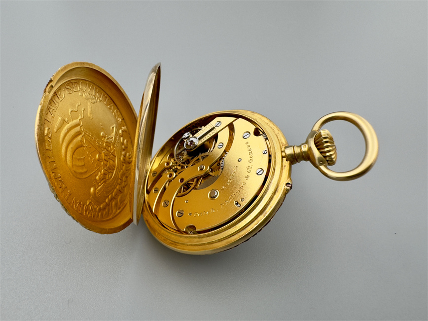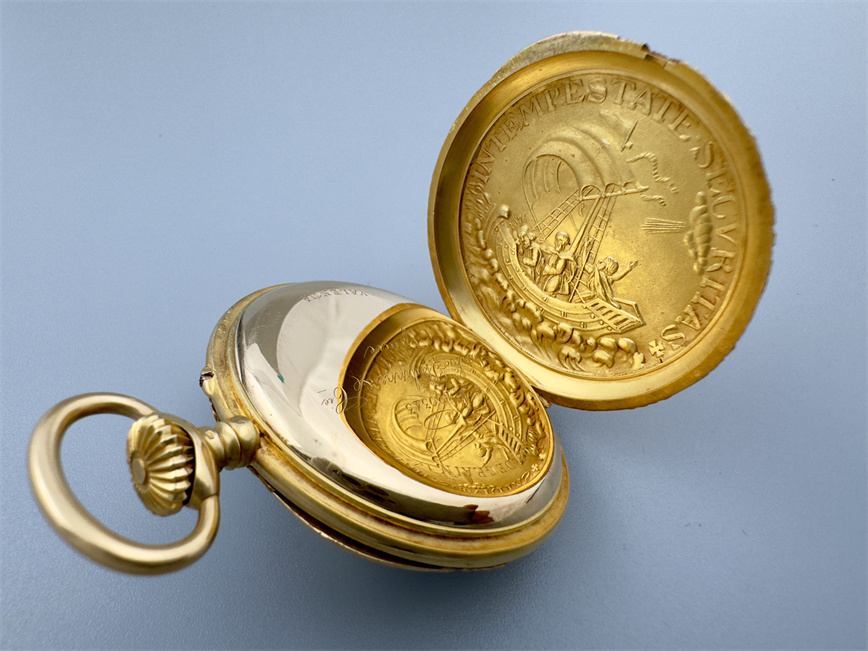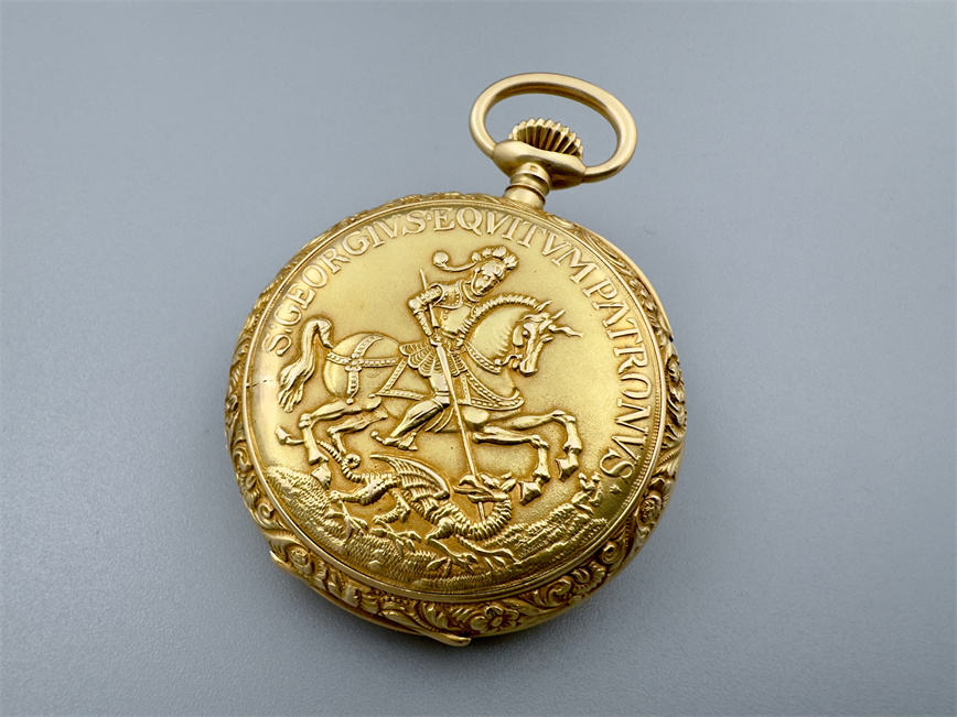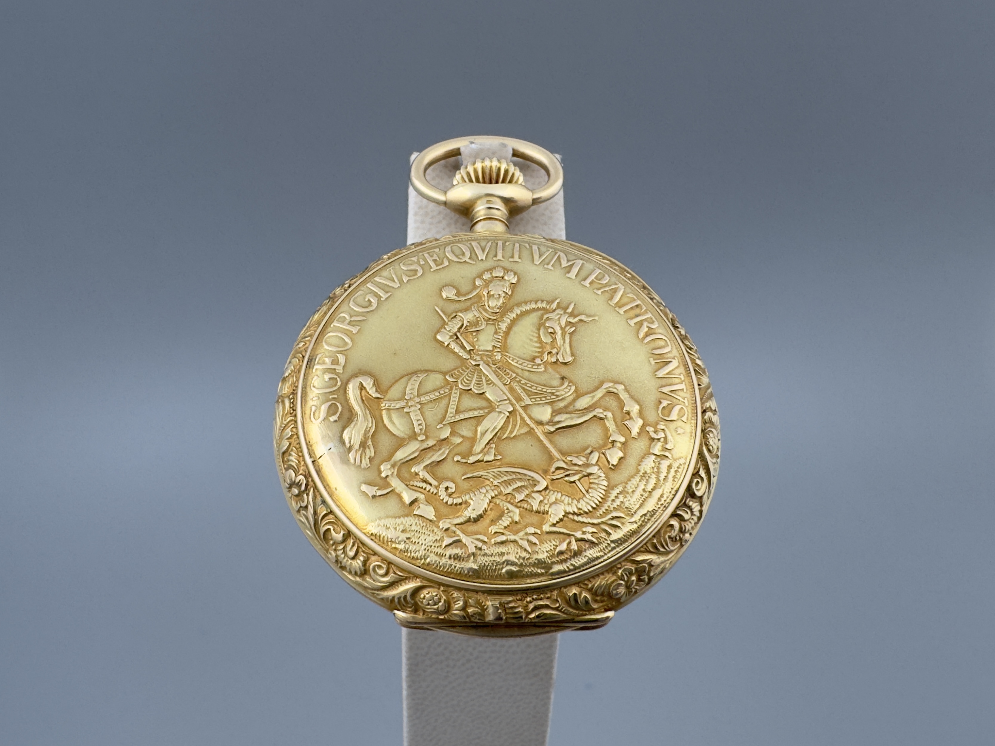 开面怀表,18K黄金表壳,表壳浮雕图案“圣乔治屠龙”,铭刻拉丁语箴言“S . GEORGIVS . EQVITUM . PATRONVS.”,译:骑士的守护神圣乔治;表壳内部浮雕图案“耶稣平静风暴”,铭刻箴言“IN TEMPESTATE SECURITAS”,译:暴风雨中的平安。双面表圈雕刻花卉装饰,金质防尘盖。17法分机芯,无匙上链,磨砂镀金,双金属补偿摆轮,狼牙式上链,蓝钢宝玑游丝,指针式微调。雕花盘面,蓝钢路易十五指针,放射状蓝色罗马字,在椭圆形白色珐琅背景之上,外圈白色珐琅轨道,蓝色圆点和巴顿时标。表壳、防尘盖和机芯签名百达翡丽。