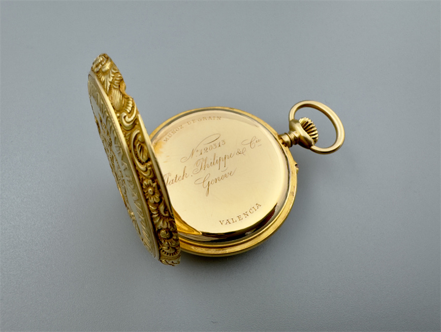 防尘盖铭刻“Muñoz Degrain, Valencia”,即“穆尼奥斯·德格伦,巴伦西亚”,确认怀表主人是西班牙著名画家安东尼奥·穆尼奥斯·德格伦(Antonio Muñoz Degrain,1840-1924),他出生于西班牙巴伦西亚,父亲是一位制表师,他以折衷主义风格开始,后在他的职业生涯中转向印象派。他以其受文学作品启发的风景画和场景而闻名,代表作《奥赛罗与苔丝狄蒙娜》《台伯河畔》《洗衣女工》《马略卡岛帕尔马海景》。