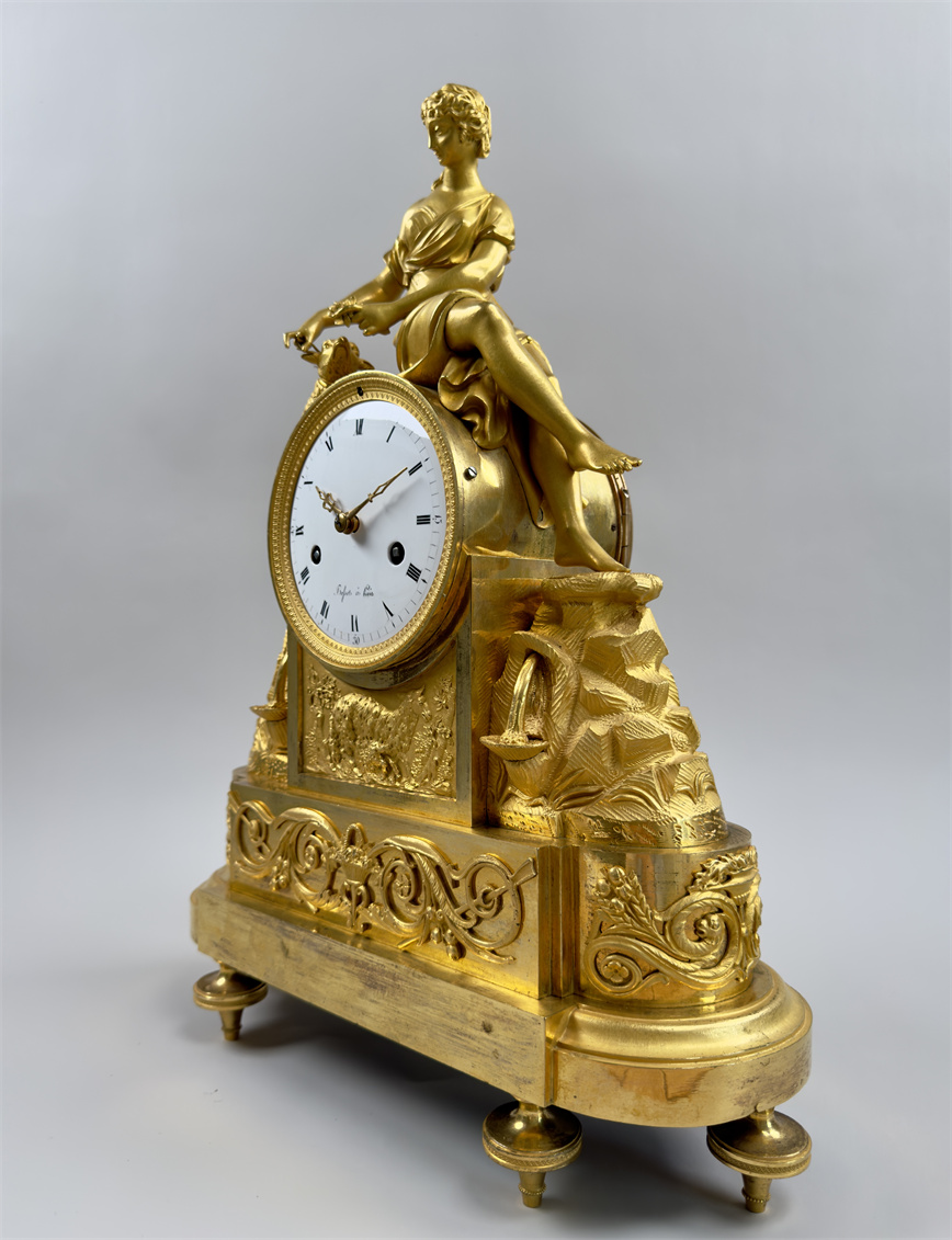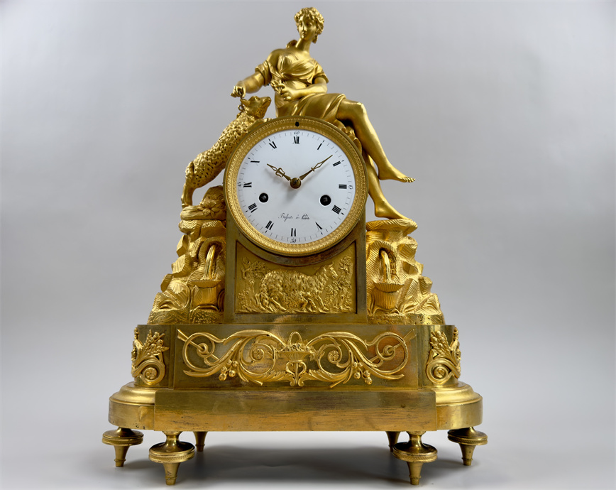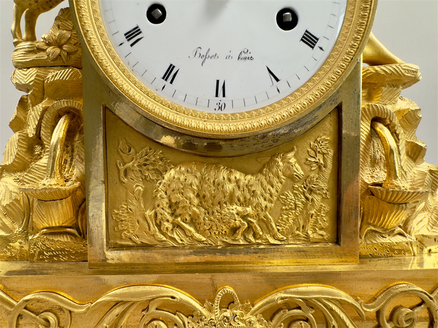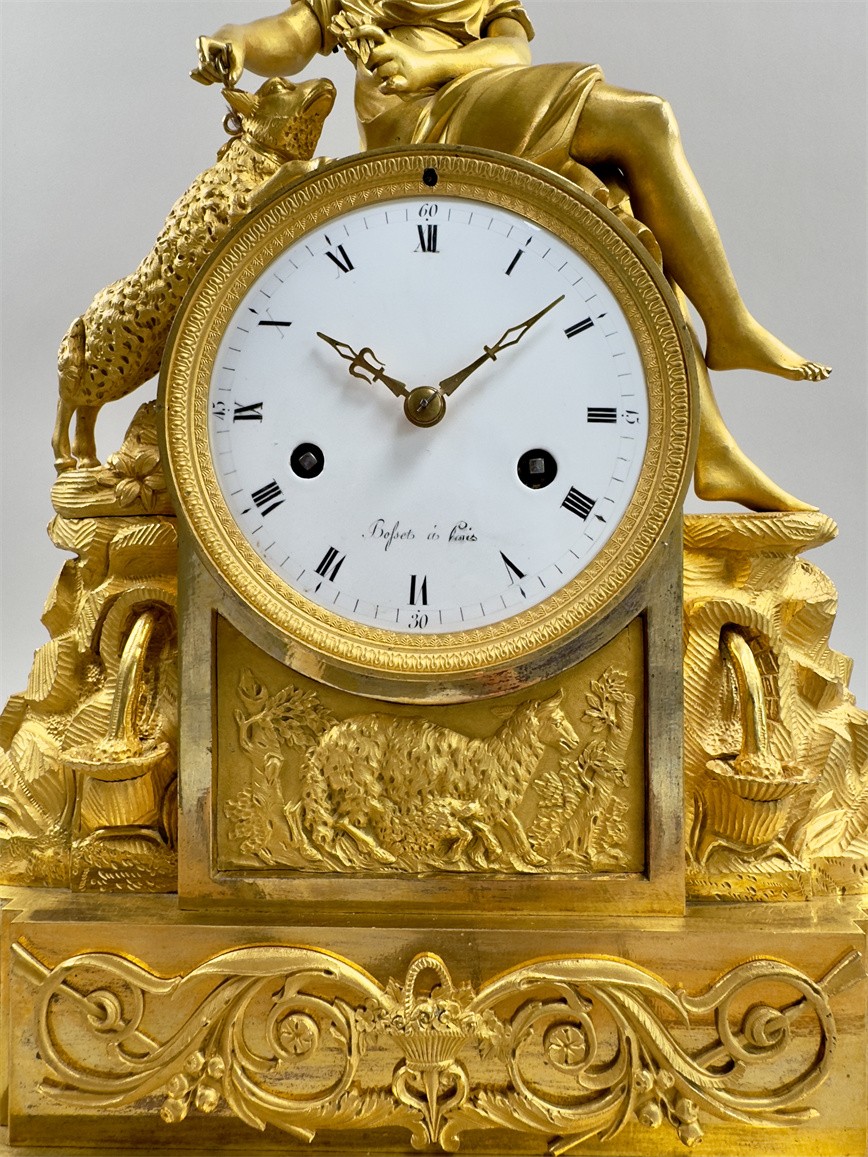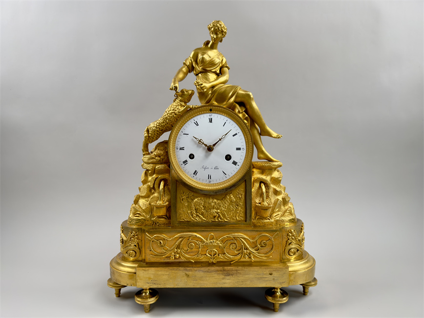 法国巴黎,18世纪末,尺寸42.5*32*12厘米,半小时鸣报。台阶式底座,四个支脚,最下一层是花篮和卷曲植物的浮雕纹样,中层雕塑描绘了岩石之上的流水和花卉,最中间是白色珐琅表盘,罗马字,签名Bosset à Paris,盘面下方是浮雕的羊和树木,最上层是年轻的牧羊女和羔羊。