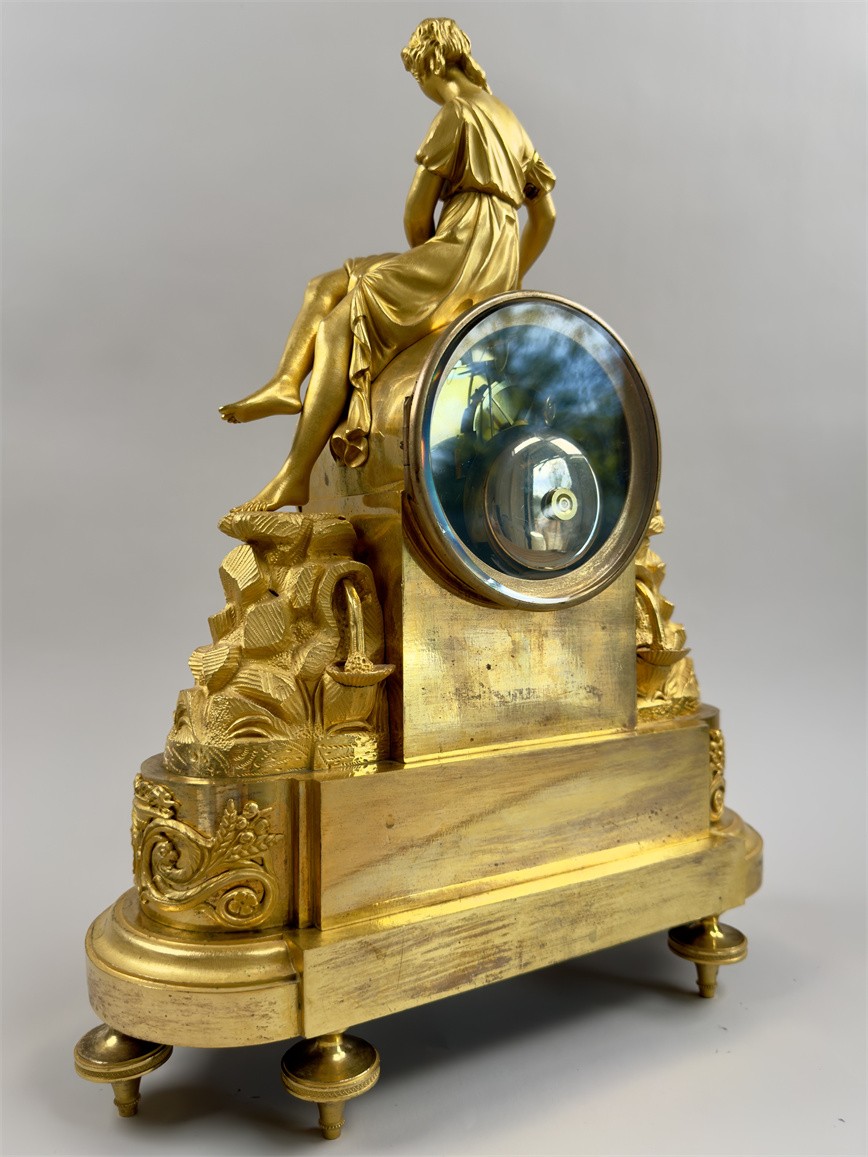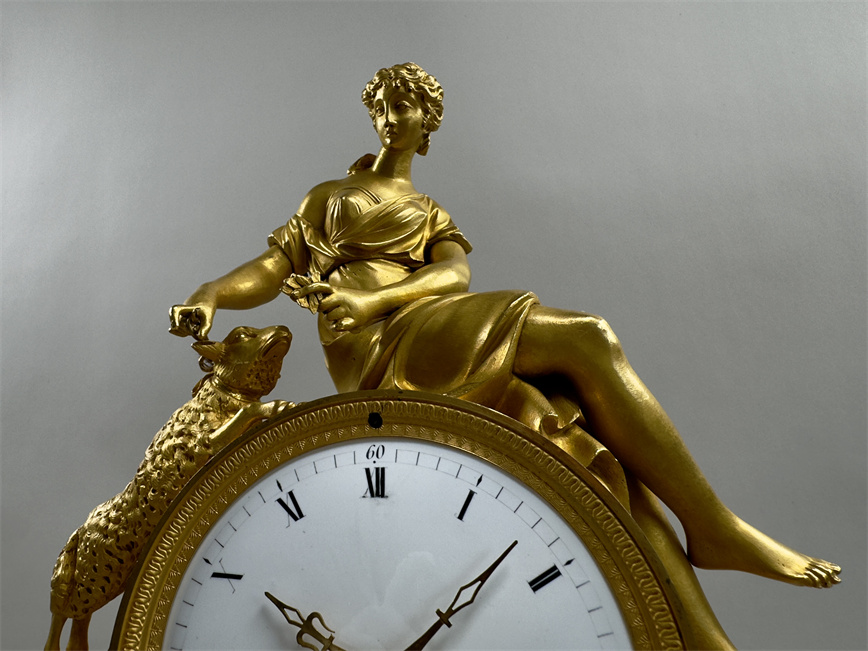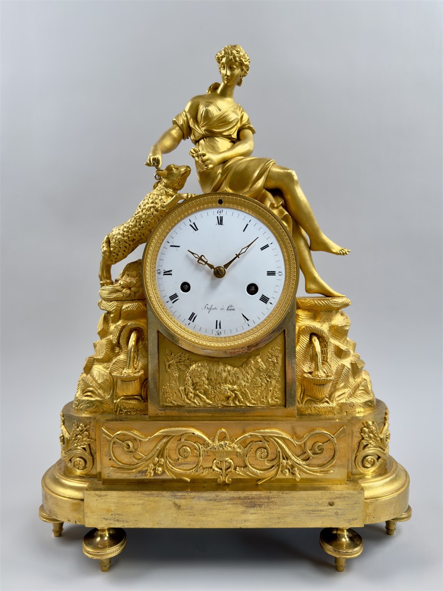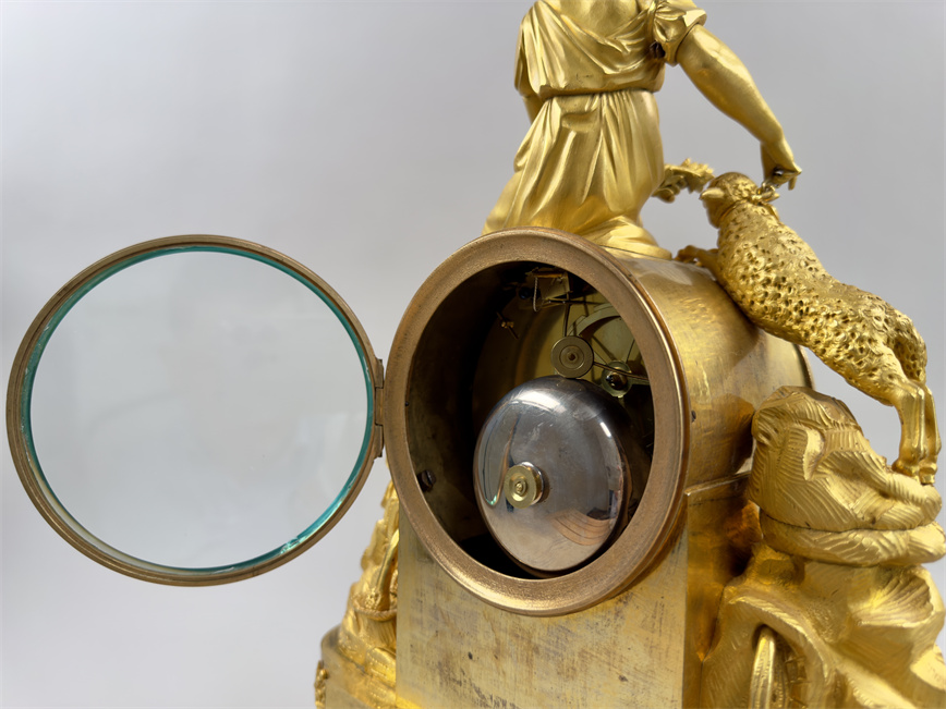 法国巴黎,18世纪末,尺寸42.5*32*12厘米,半小时鸣报。台阶式底座,四个支脚,最下一层是花篮和卷曲植物的浮雕纹样,中层雕塑描绘了岩石之上的流水和花卉,最中间是白色珐琅表盘,罗马字,签名Bosset à Paris,盘面下方是浮雕的羊和树木,最上层是年轻的牧羊女和羔羊。
