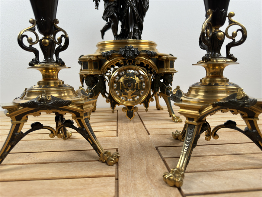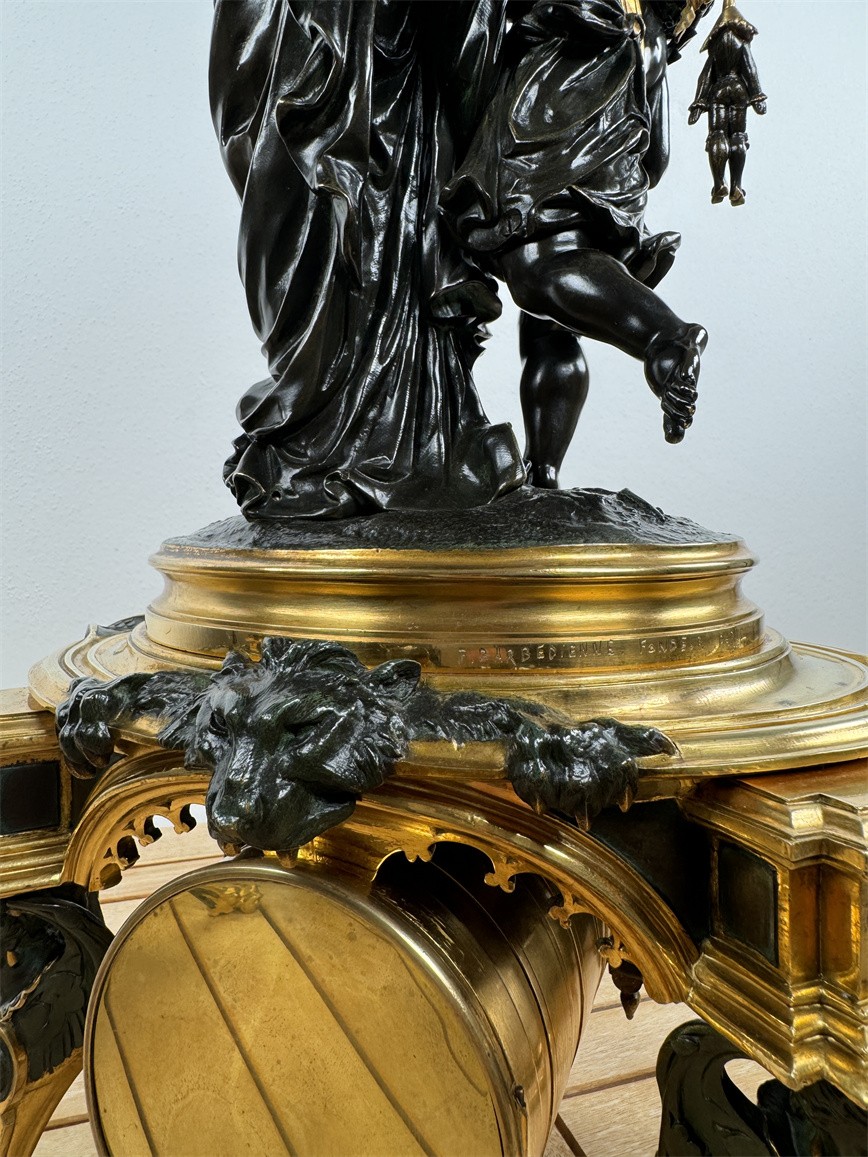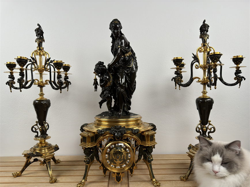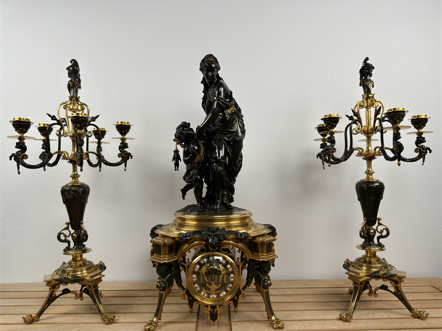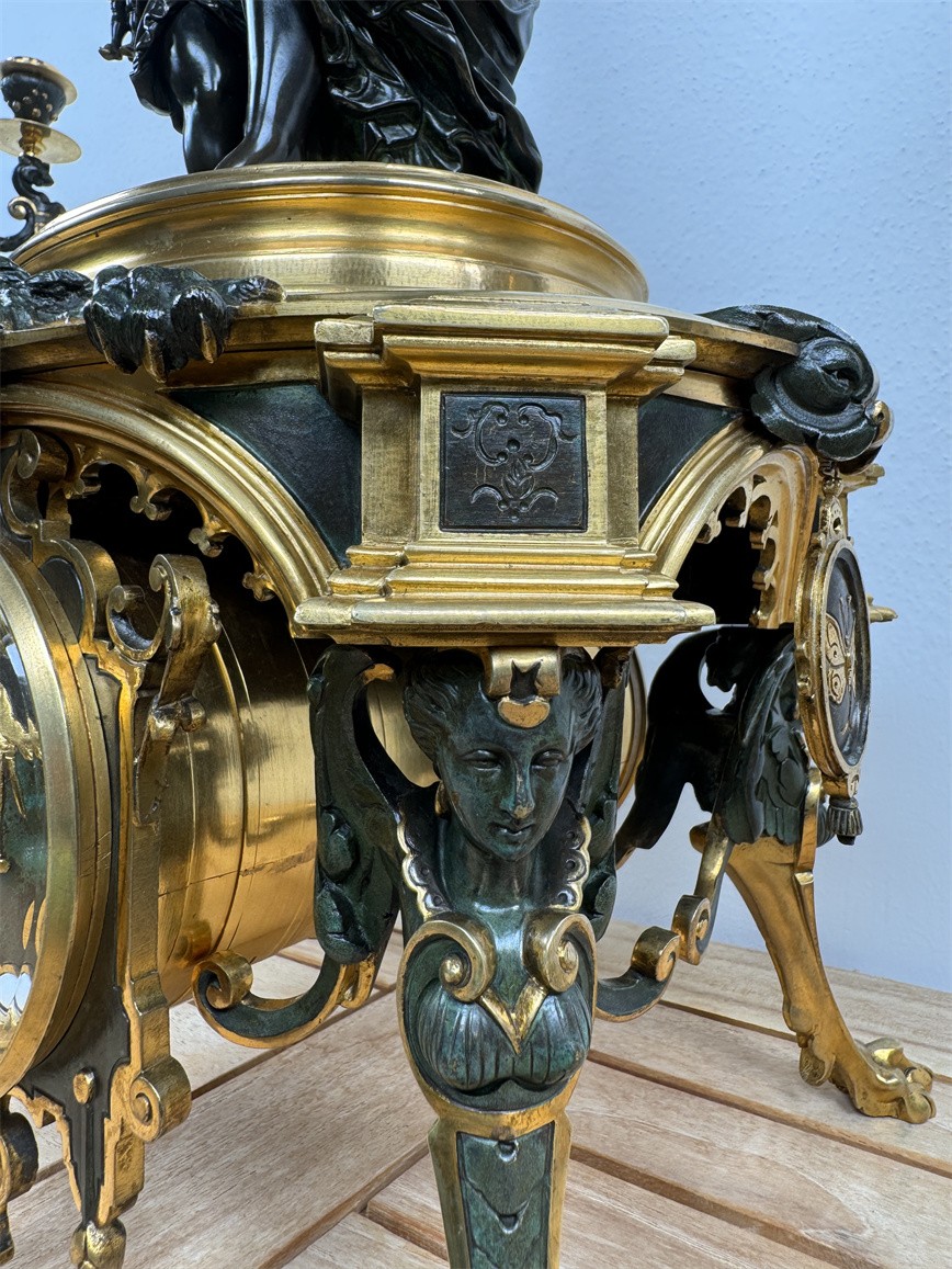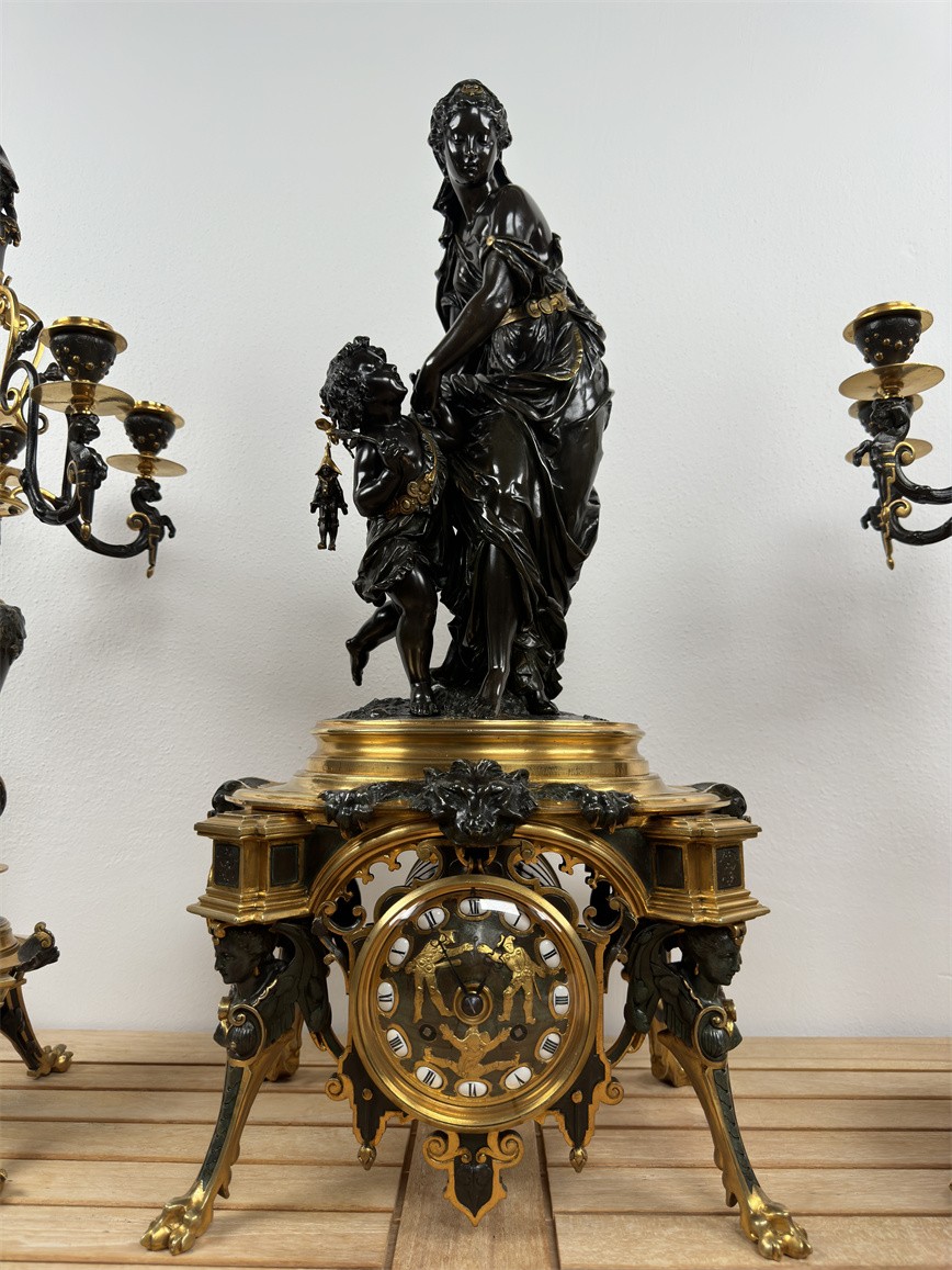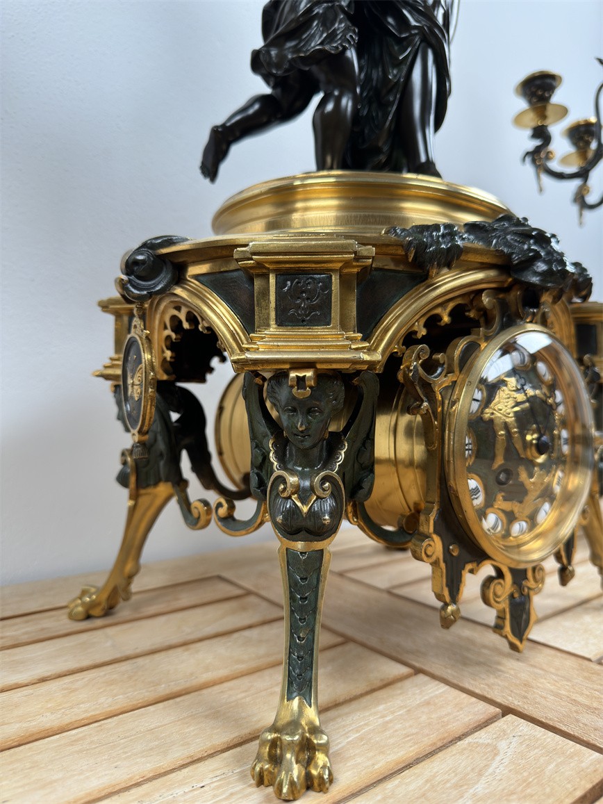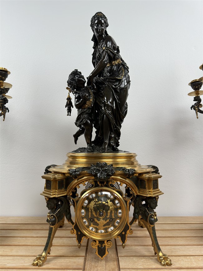 非常精美,艺术水准极高的馆级青铜镀金三件套古董壁炉钟,法国巴黎,约1888年,签名费迪南德·巴贝迪安(Ferdinand Barbedienne)。青铜钟盘上有白底黑色罗马数字珐琅刻度时标,中央饰有三个鎏金人物。报时机芯Brocot擒纵机构,签名Roblin & Fils Freres, A Paris。椭圆形底座由四个带兽爪的翼膀女像柱支撑,顶部是古典女性雕像,旁边昂头上望,肩挂潘奇内罗像的孩子,基座上签名 F. Barbedienne Fondeur Paris。附一对完全相配的五灯烛台,每件高约 63 厘米。