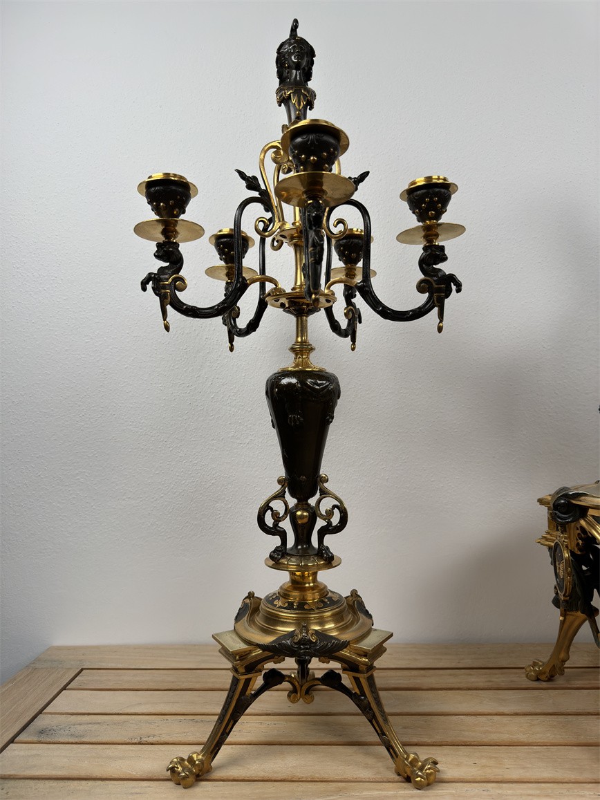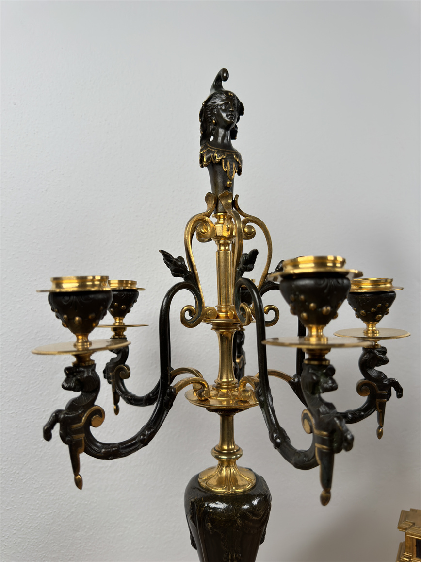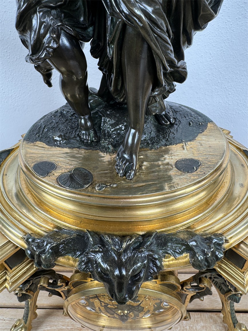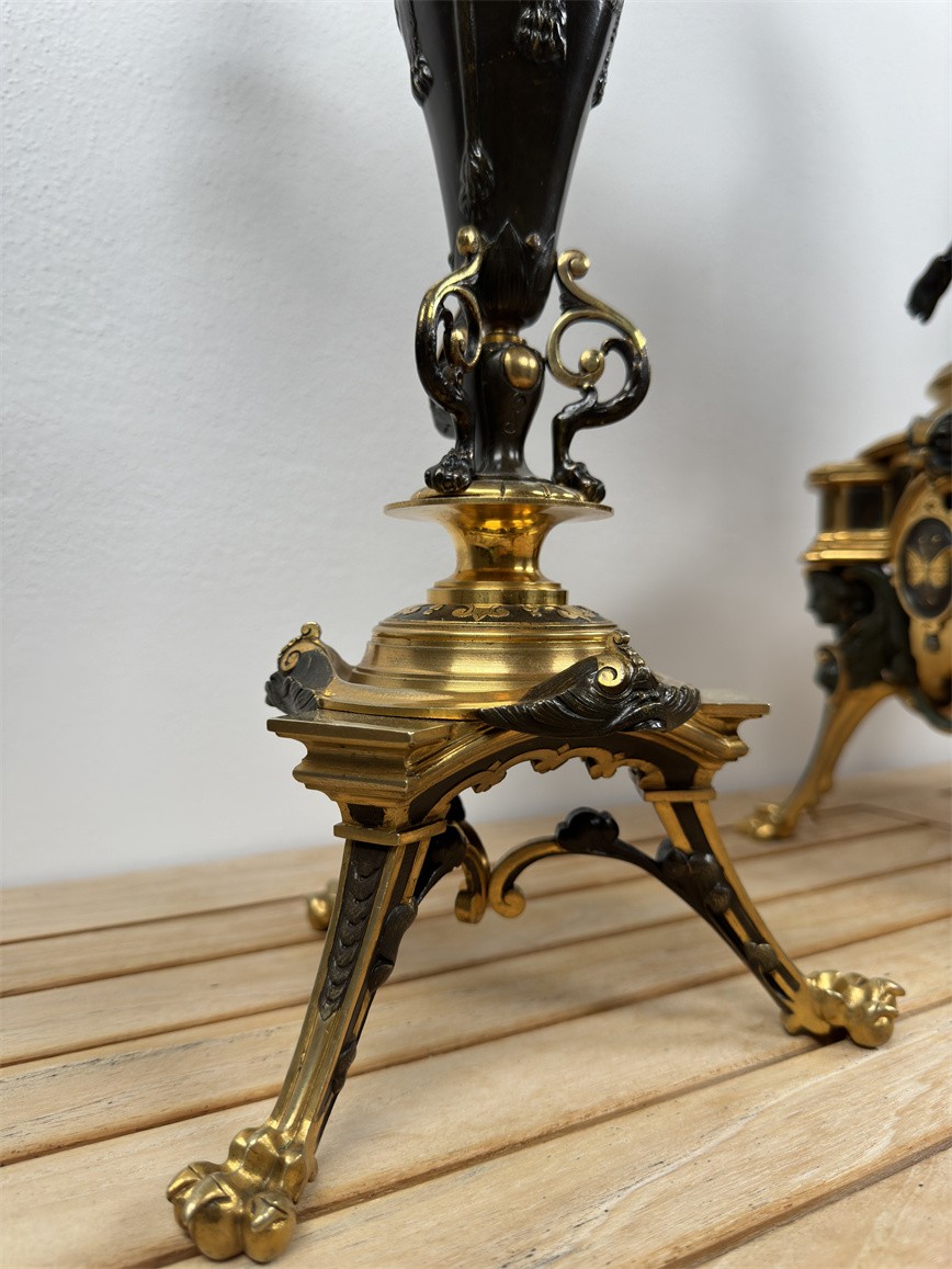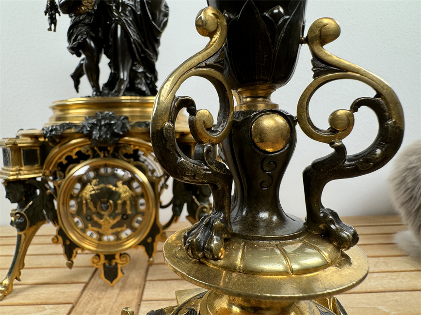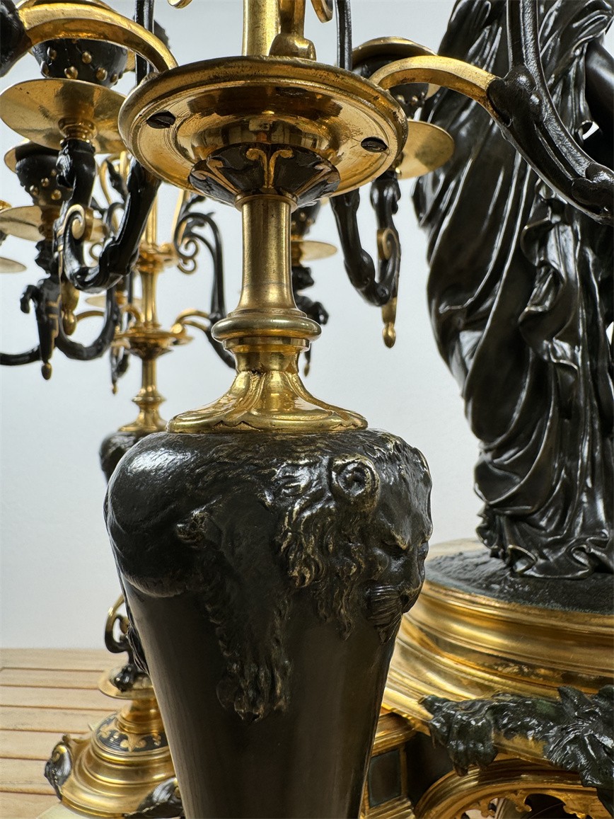 非常精美,艺术水准极高的馆级青铜镀金三件套古董壁炉钟,法国巴黎,约1888年,签名费迪南德·巴贝迪安(Ferdinand Barbedienne)。青铜钟盘上有白底黑色罗马数字珐琅刻度时标,中央饰有三个鎏金人物。报时机芯Brocot擒纵机构,签名Roblin & Fils Freres, A Paris。椭圆形底座由四个带兽爪的翼膀女像柱支撑,顶部是古典女性雕像,旁边昂头上望,肩挂潘奇内罗像的孩子,基座上签名 F. Barbedienne Fondeur Paris。附一对完全相配的五灯烛台,每件高约 63 厘米。