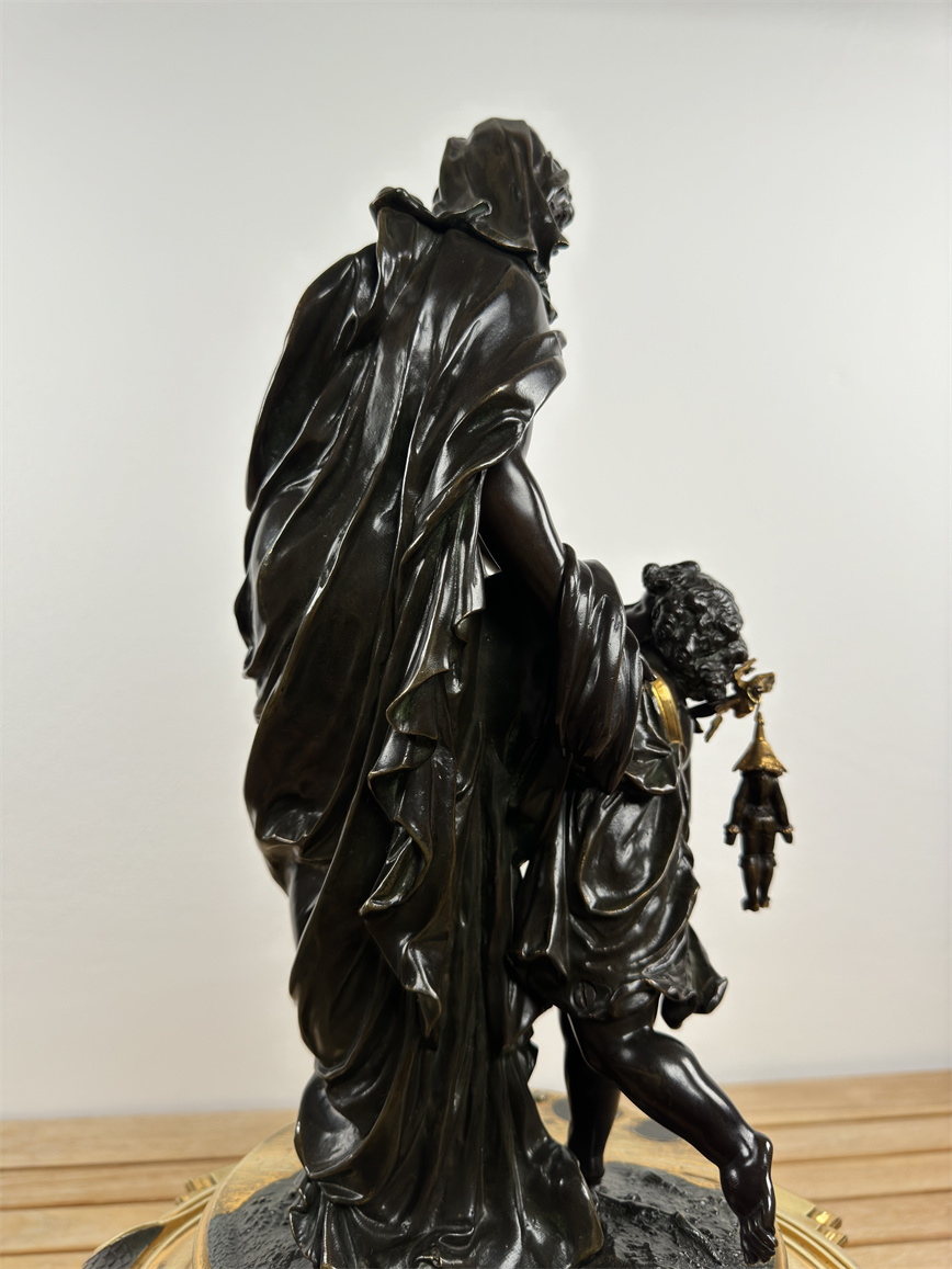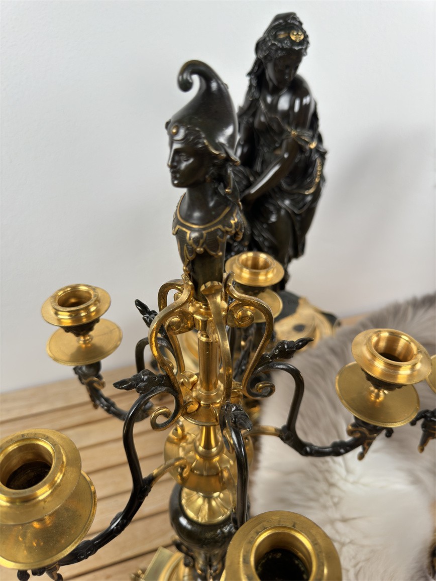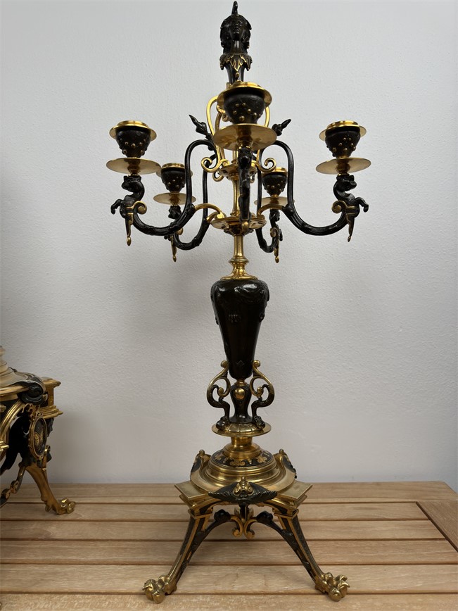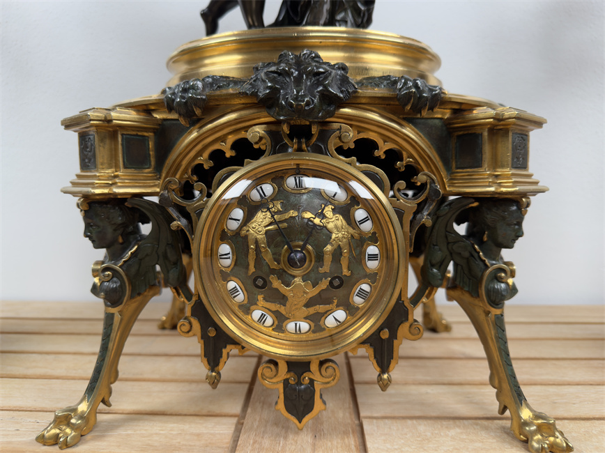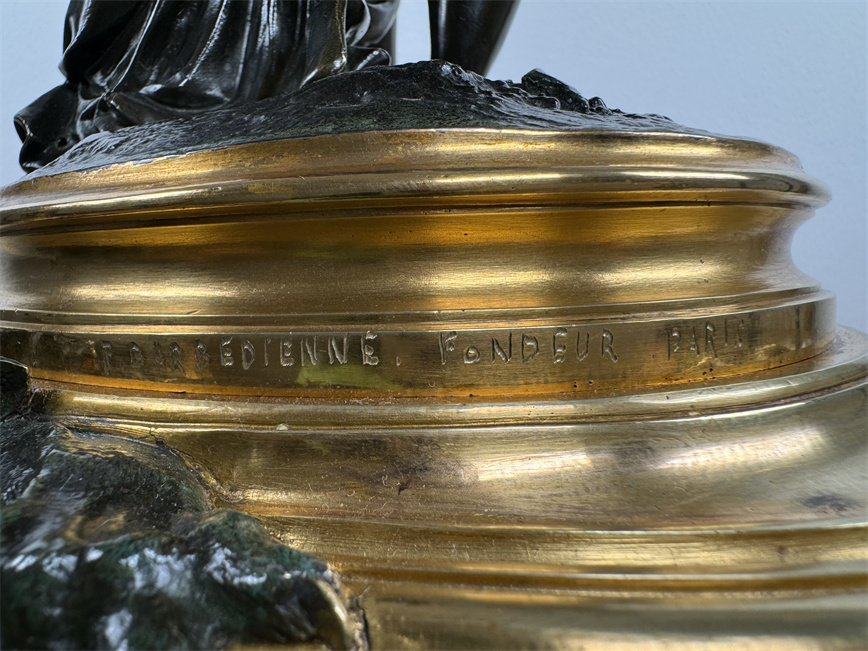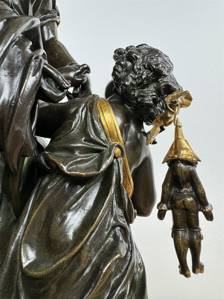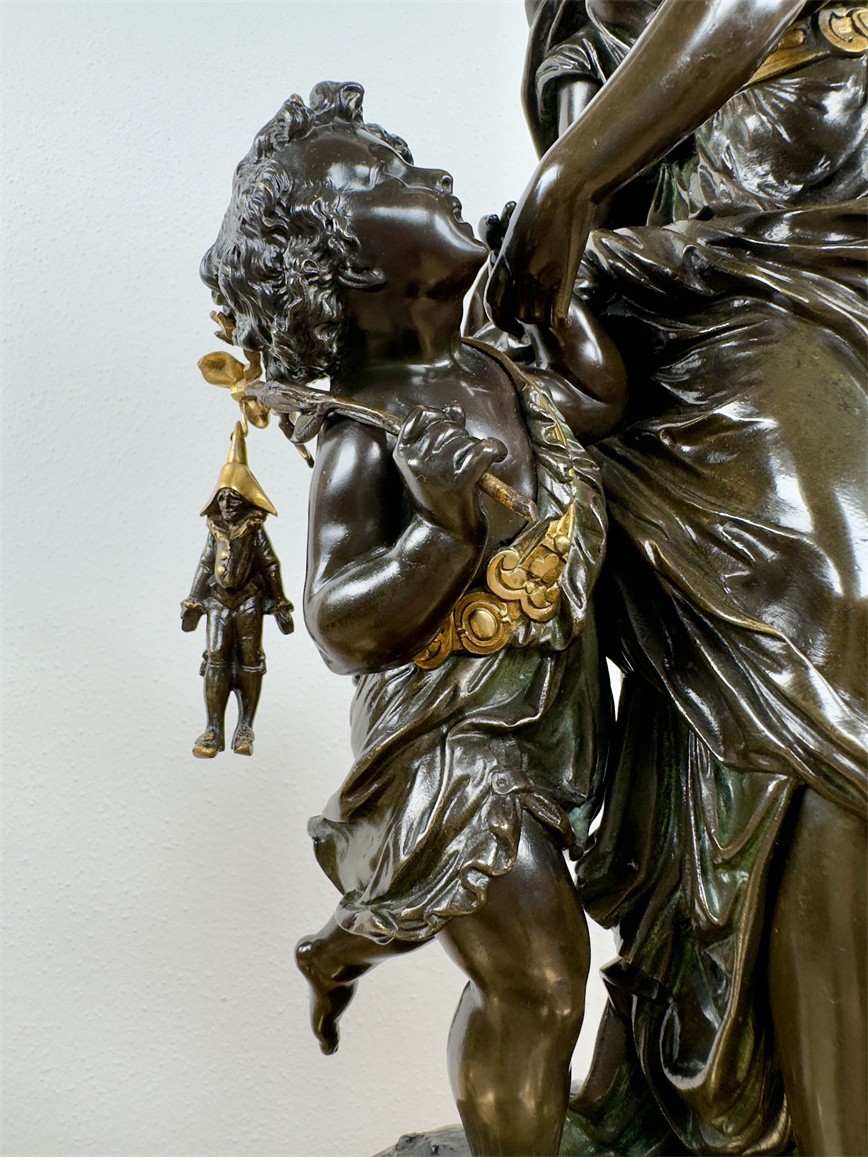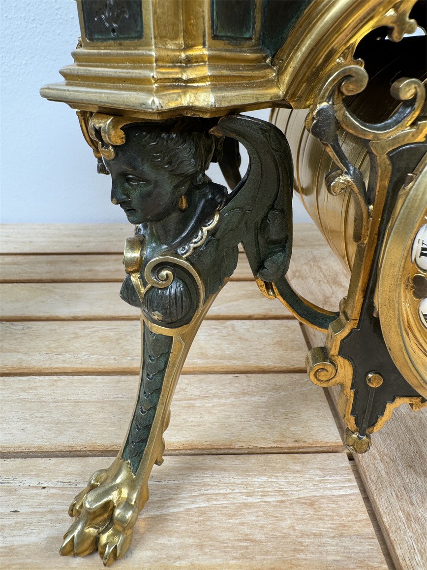 非常精美,艺术水准极高的馆级青铜镀金三件套古董壁炉钟,法国巴黎,约1888年,签名费迪南德·巴贝迪安(Ferdinand Barbedienne)。青铜钟盘上有白底黑色罗马数字珐琅刻度时标,中央饰有三个鎏金人物。报时机芯Brocot擒纵机构,签名Roblin & Fils Freres, A Paris。椭圆形底座由四个带兽爪的翼膀女像柱支撑,顶部是古典女性雕像,旁边昂头上望,肩挂潘奇内罗像的孩子,基座上签名 F. Barbedienne Fondeur Paris。附一对完全相配的五灯烛台,每件高约 63 厘米。