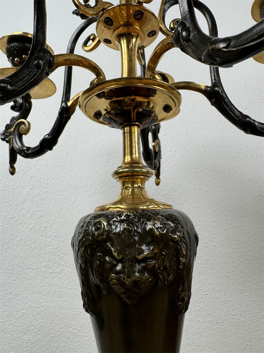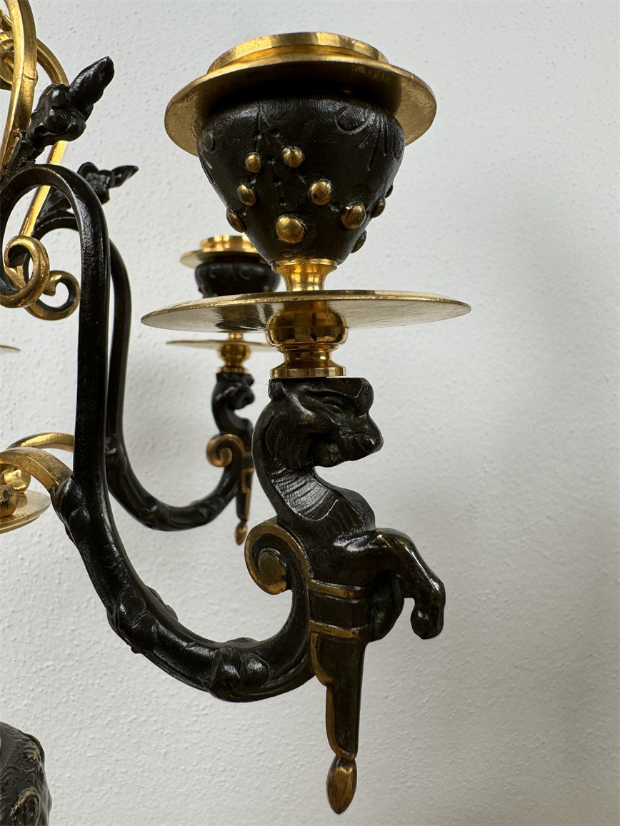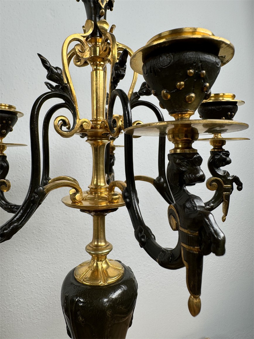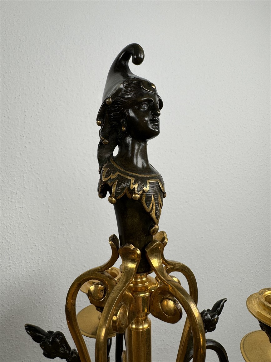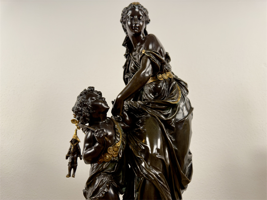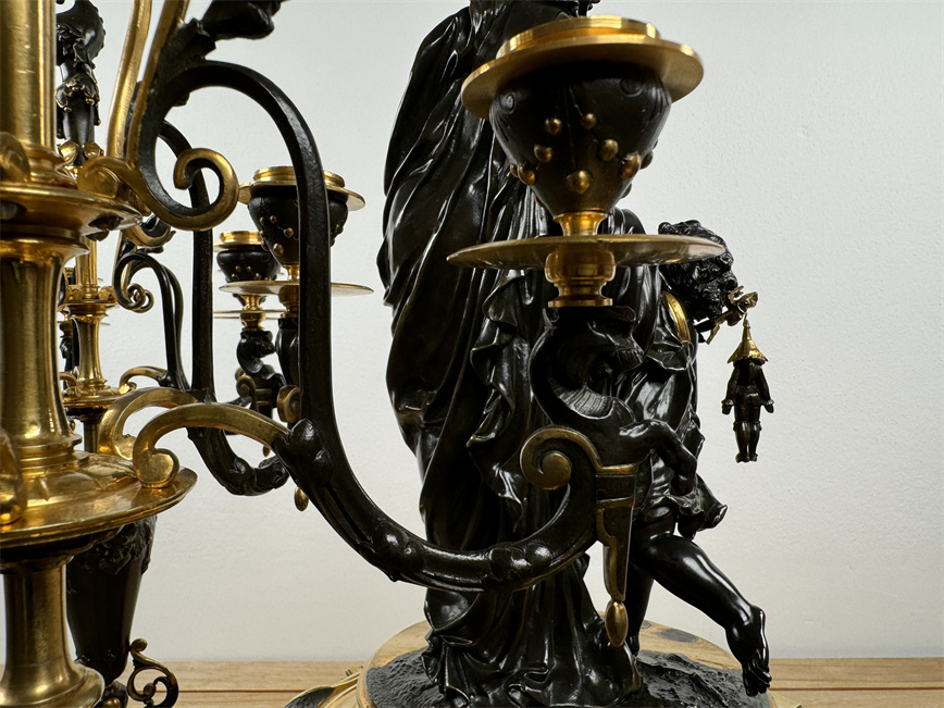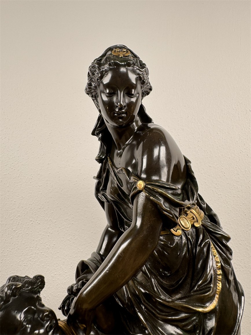非常精美,艺术水准极高的馆级青铜镀金三件套古董壁炉钟,法国巴黎,约1888年,签名费迪南德·巴贝迪安(Ferdinand Barbedienne)。青铜钟盘上有白底黑色罗马数字珐琅刻度时标,中央饰有三个鎏金人物。报时机芯Brocot擒纵机构,签名Roblin & Fils Freres, A Paris。椭圆形底座由四个带兽爪的翼膀女像柱支撑,顶部是古典女性雕像,旁边昂头上望,肩挂潘奇内罗像的孩子,基座上签名 F. Barbedienne Fondeur Paris。附一对完全相配的五灯烛台,每件高约 63 厘米。