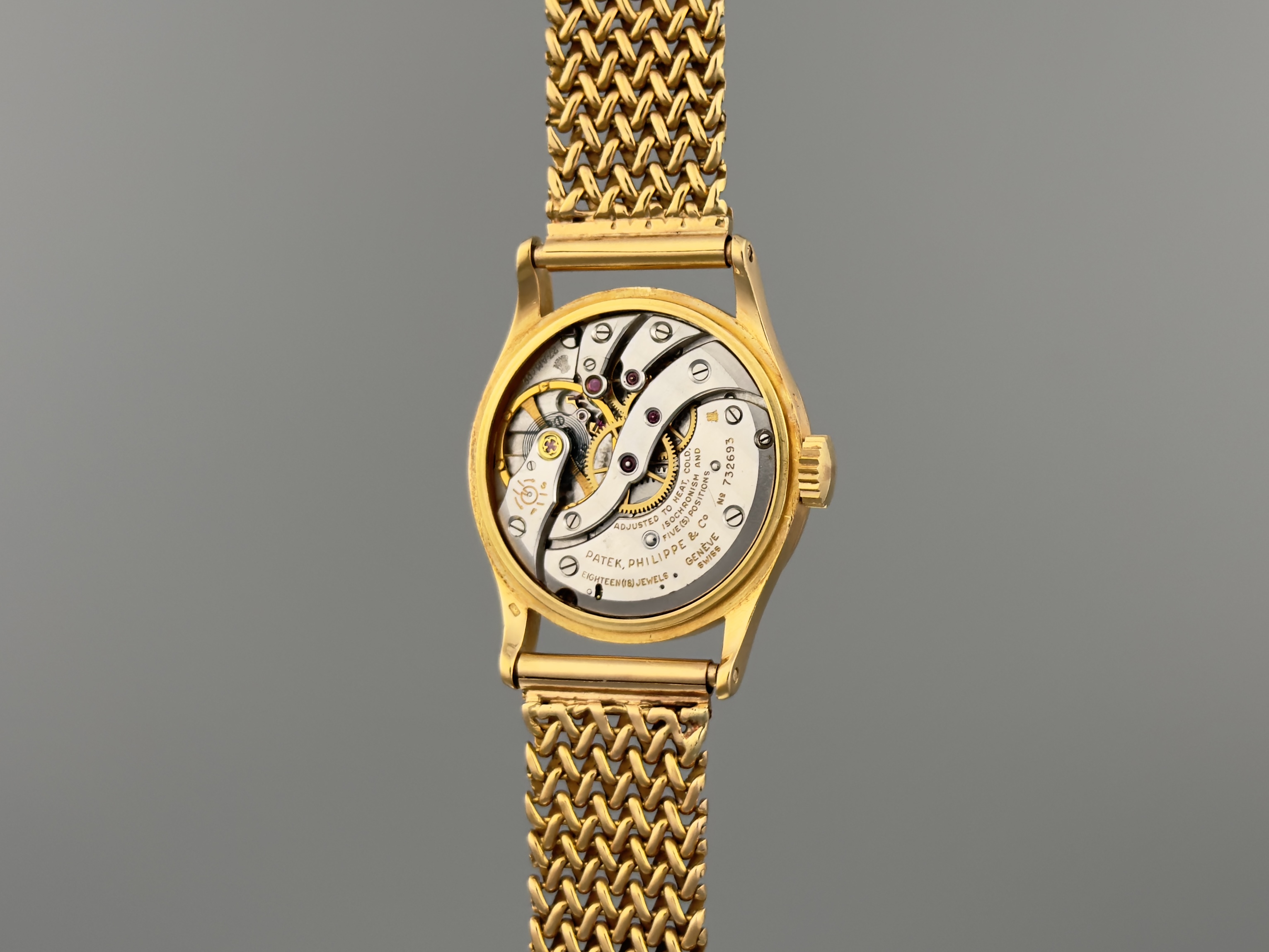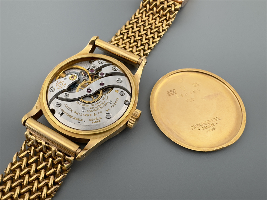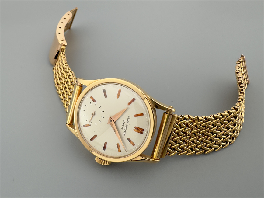 百达翡丽Ref.96,红金材质,约1963年,口径30.5mm,搭载当时领先的防磁机芯Cal. 27 AM 400,日内瓦印记,18石,手动上链,烧青字及烧青秒针环,表盘外圈点状分钟环,金质巴顿时标、金质太子妃指针、小秒针。附金质链带。