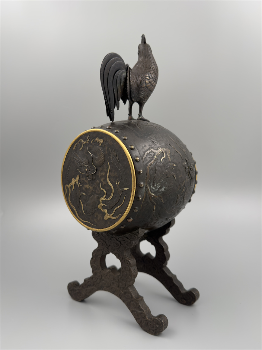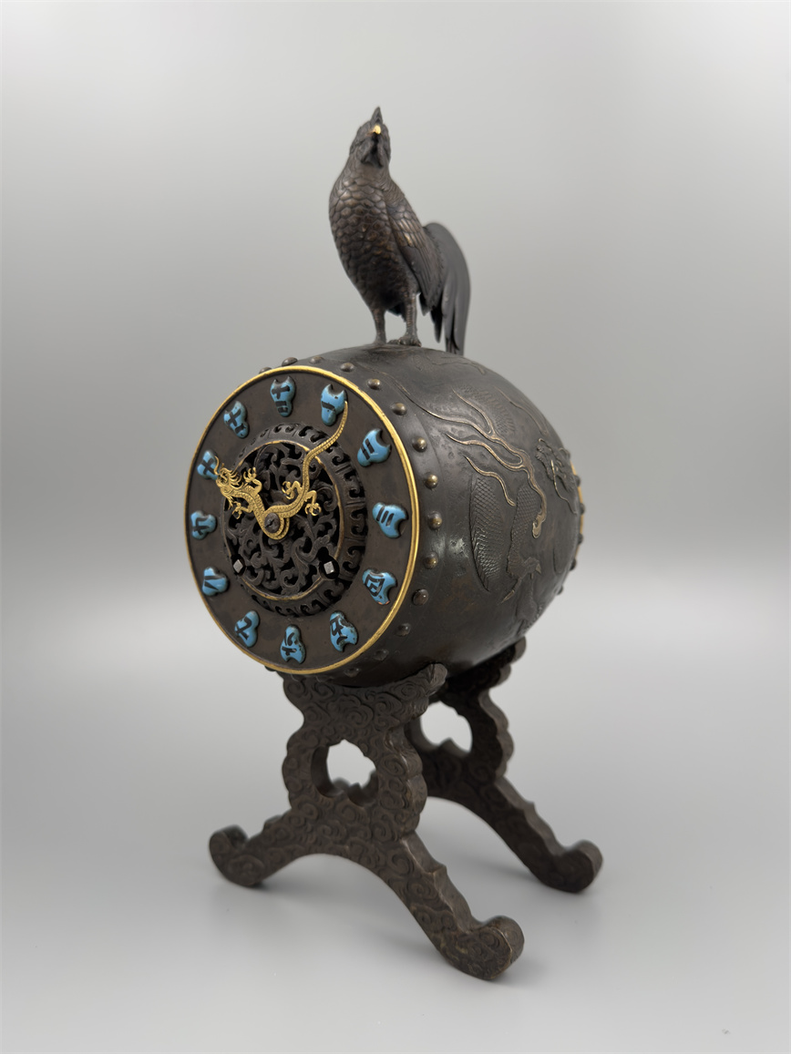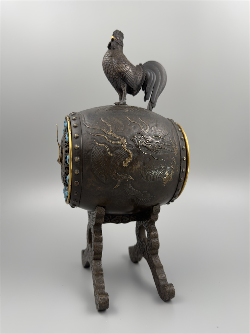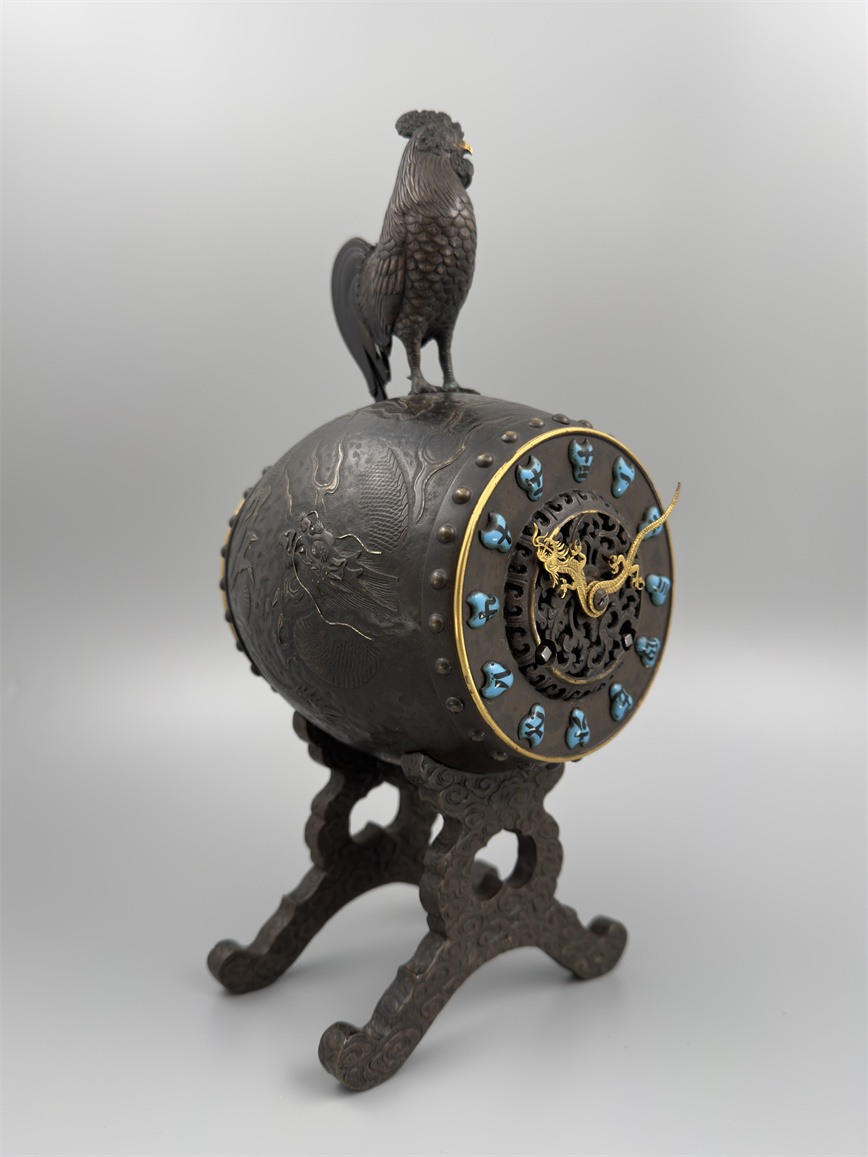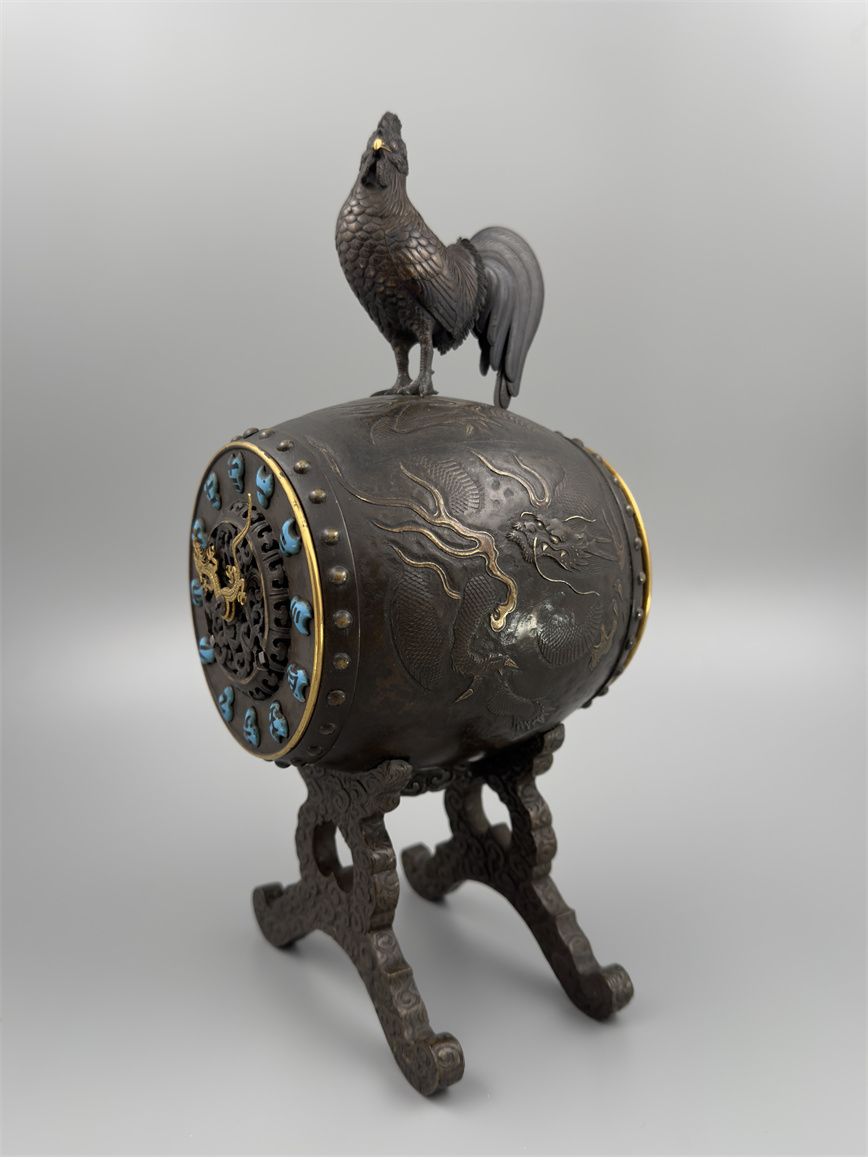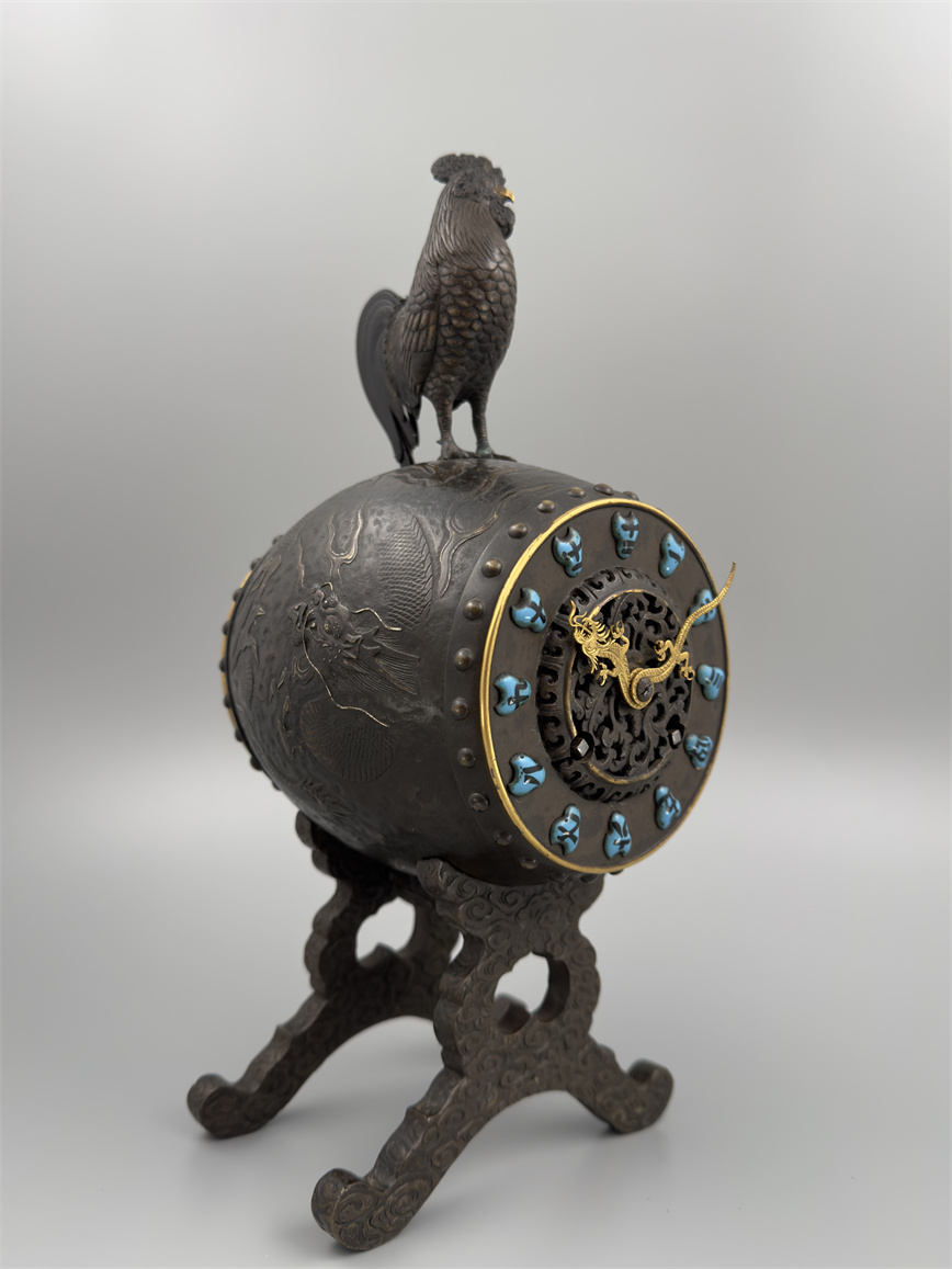 十九世纪后期,青铜材质,顶部雄鸡雕塑,卷曲纹饰的镂空表盘,蓝色松石汉字时标,镀金黄铜龙形指针,整点半点自鸣机芯内置于座钟的桶型钟身,钟身及背面龙纹浮雕装饰,云纹雕刻的钟架。机芯签名Susse Frères。