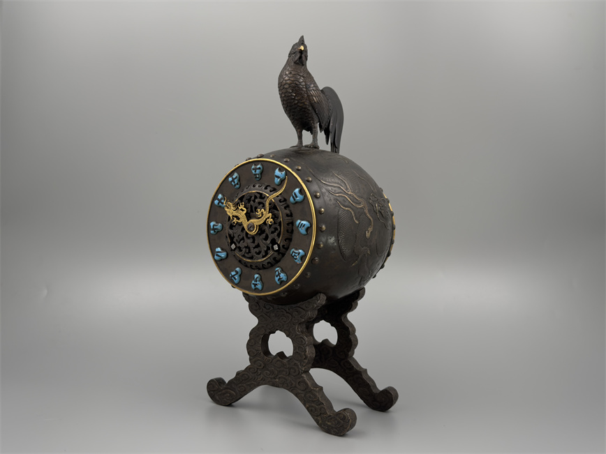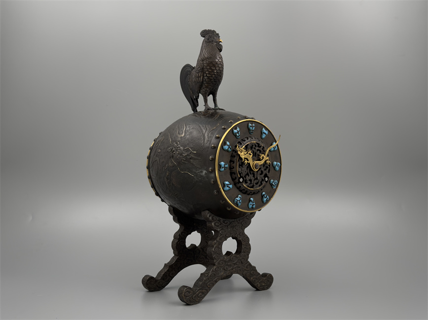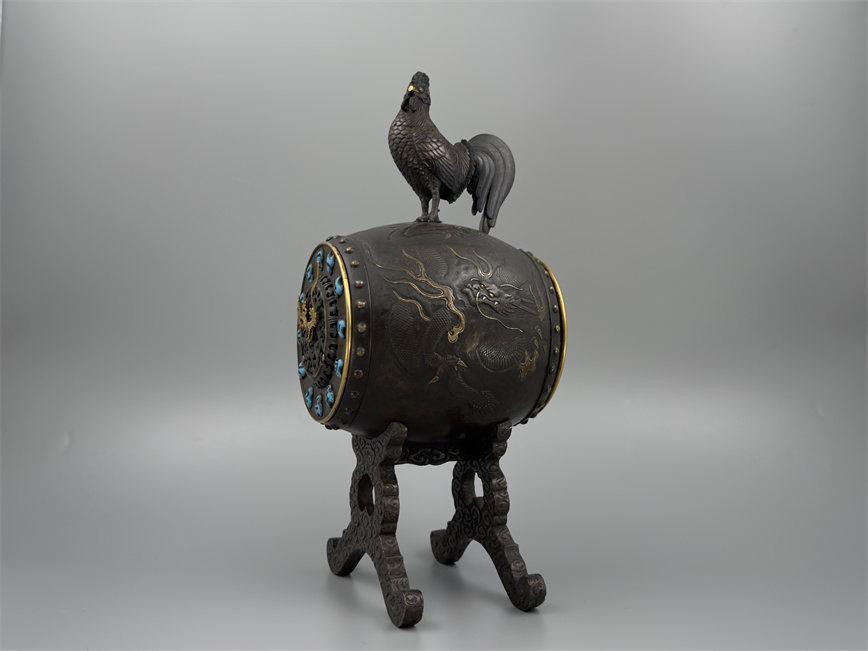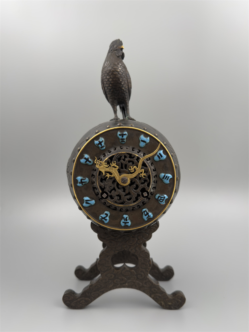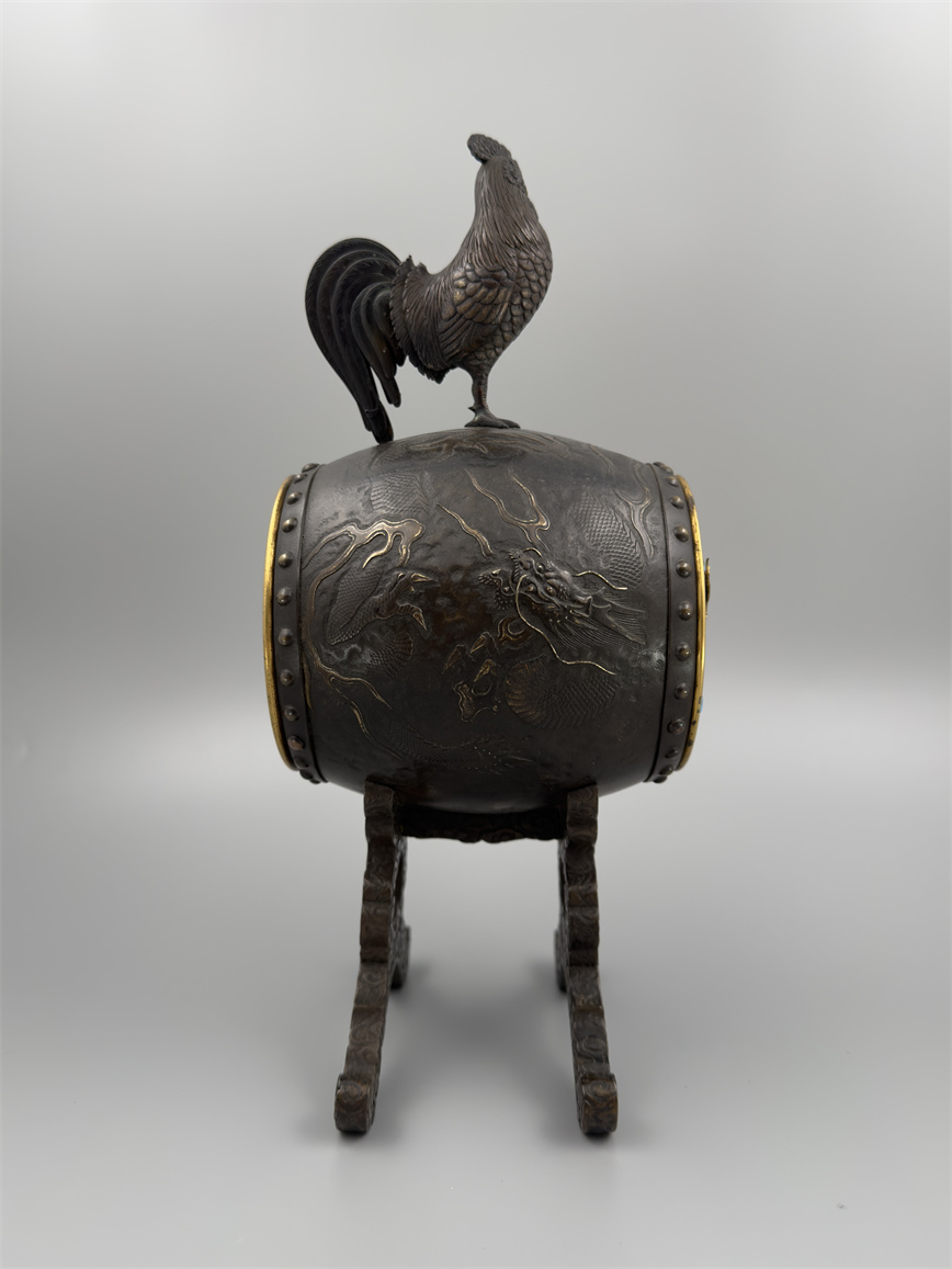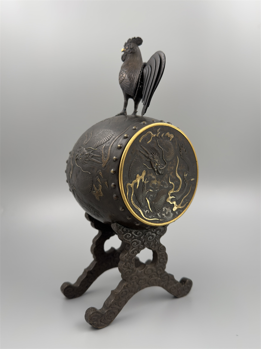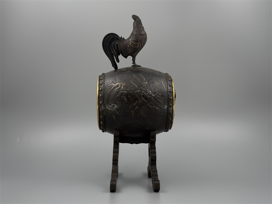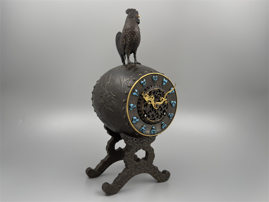 十九世纪后期,青铜材质,顶部雄鸡雕塑,卷曲纹饰的镂空表盘,蓝色松石汉字时标,镀金黄铜龙形指针,整点半点自鸣机芯内置于座钟的桶型钟身,钟身及背面龙纹浮雕装饰,云纹雕刻的钟架。机芯签名Susse Frères。