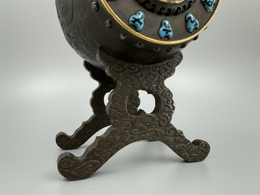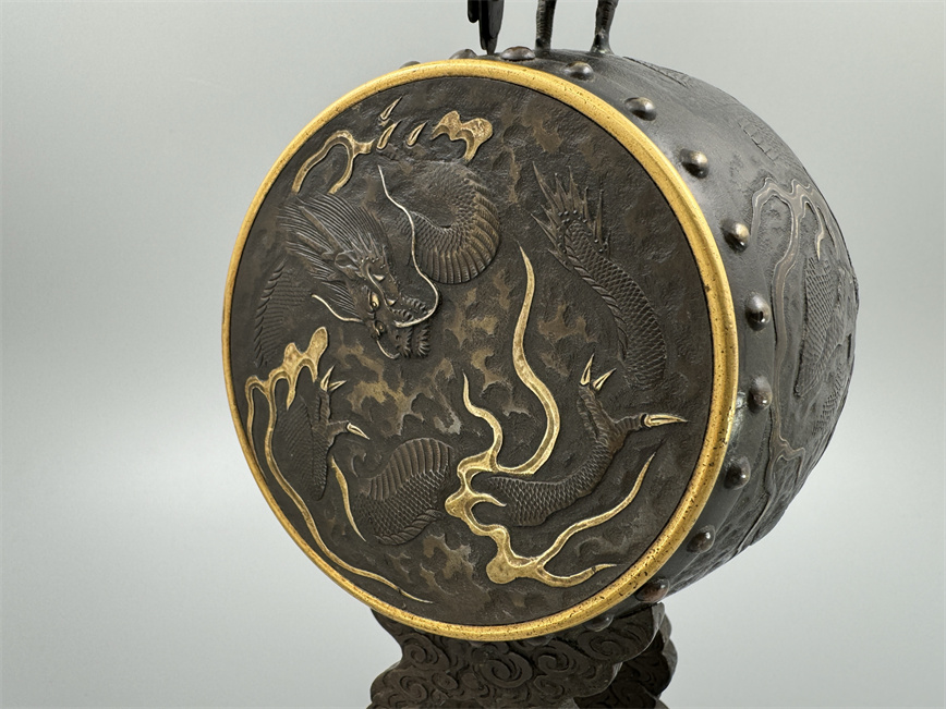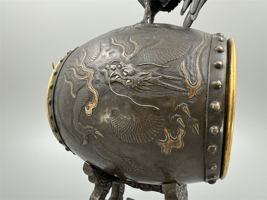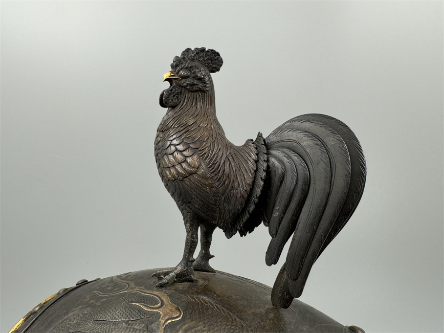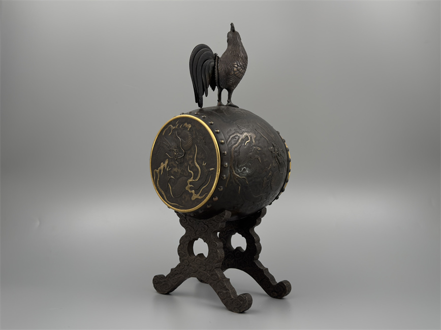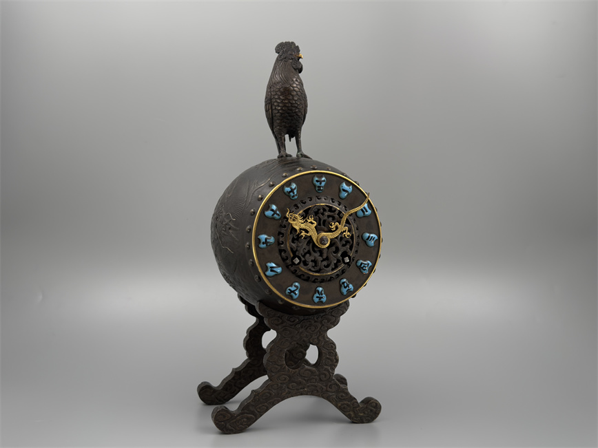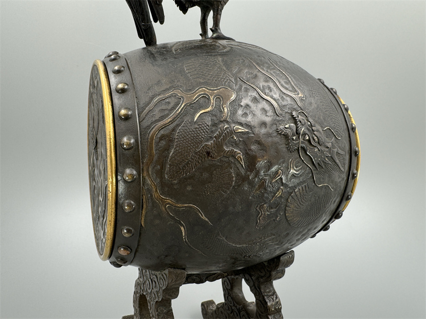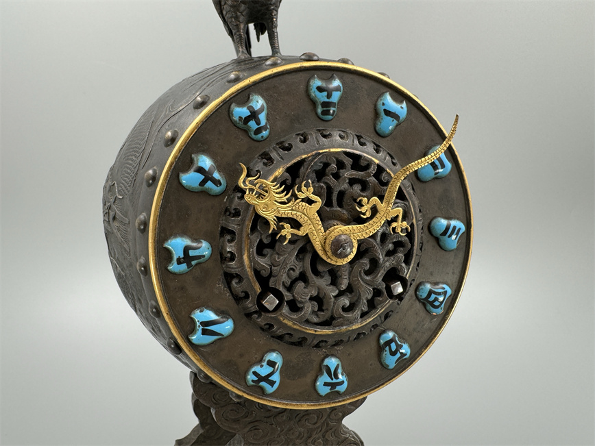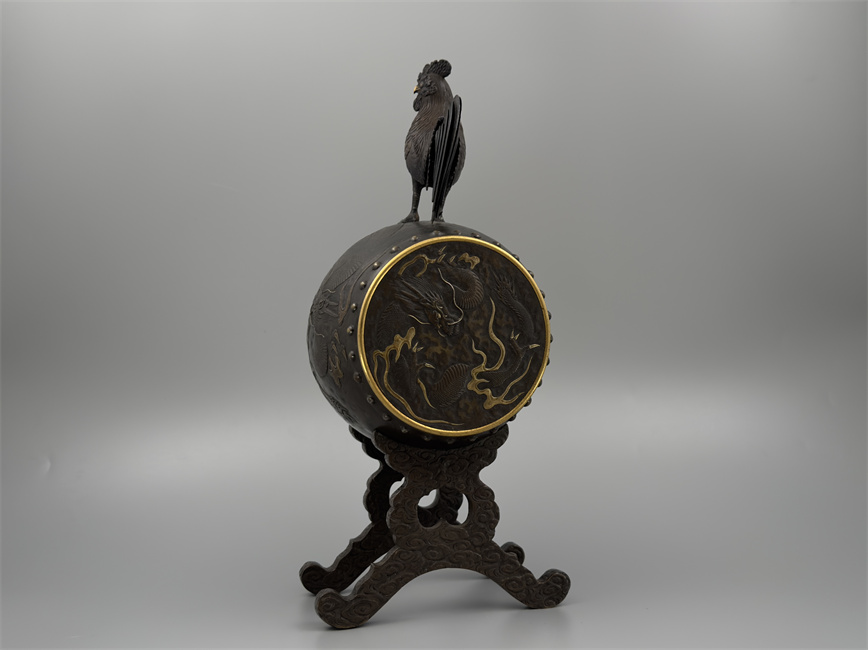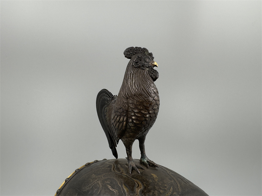 十九世纪后期,青铜材质,顶部雄鸡雕塑,卷曲纹饰的镂空表盘,蓝色松石汉字时标,镀金黄铜龙形指针,整点半点自鸣机芯内置于座钟的桶型钟身,钟身及背面龙纹浮雕装饰,云纹雕刻的钟架。机芯签名Susse Frères。