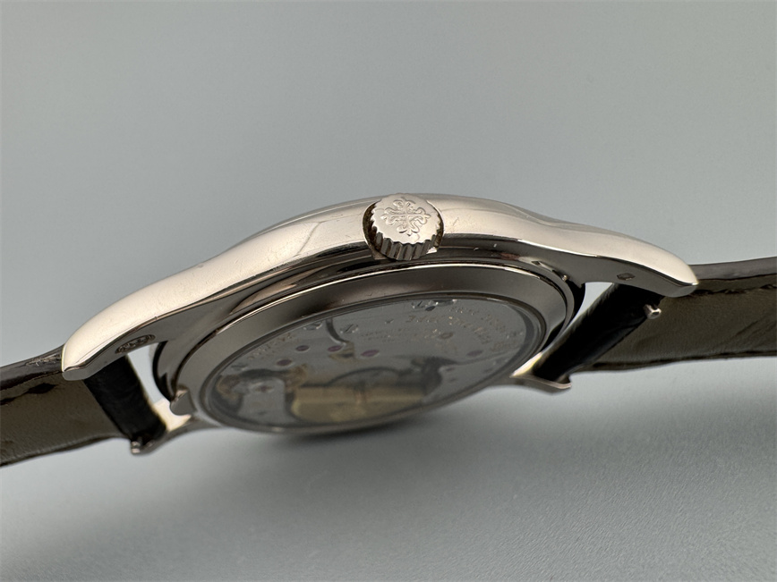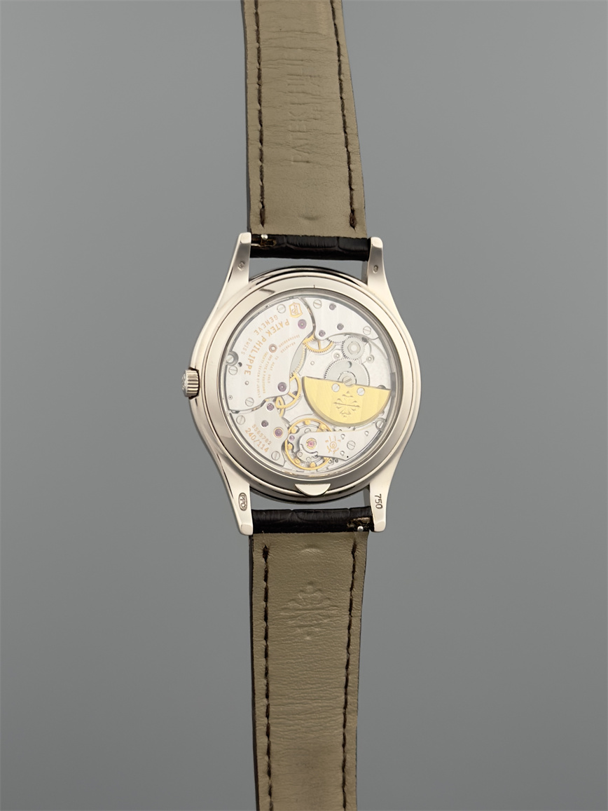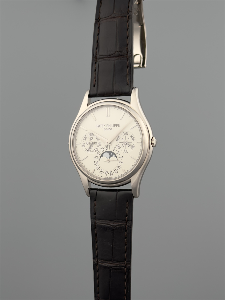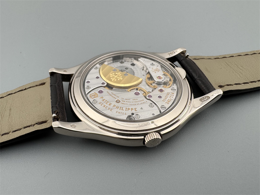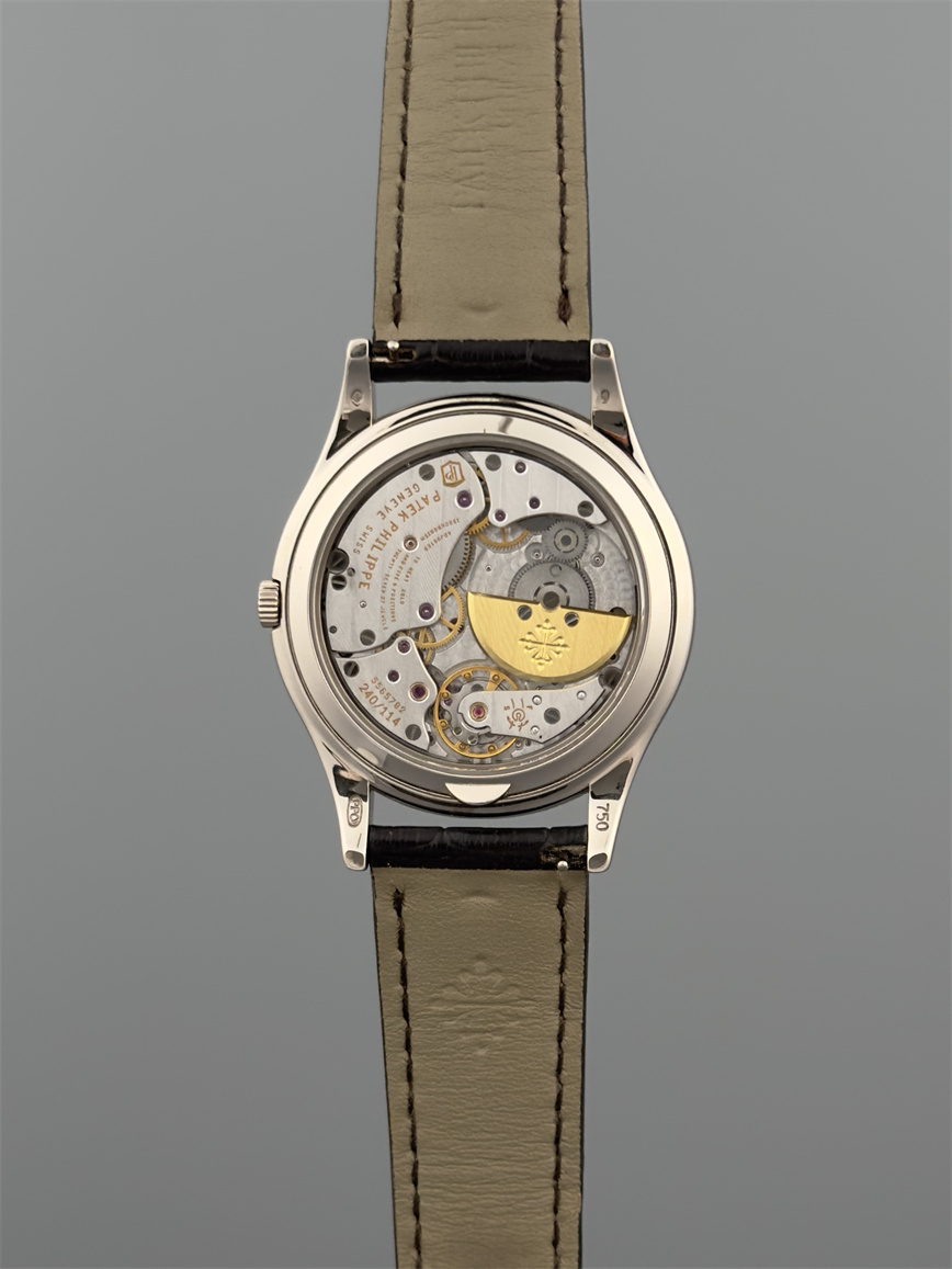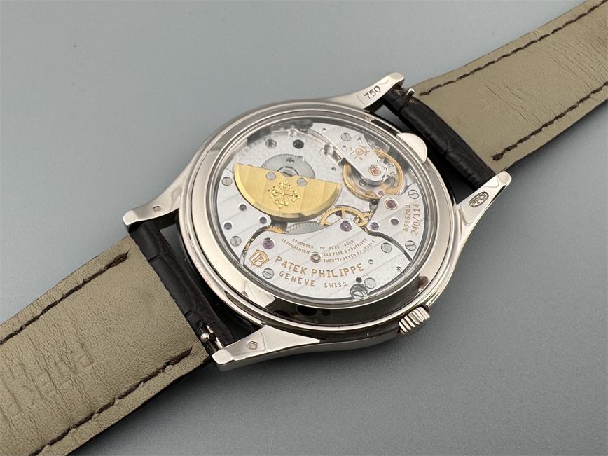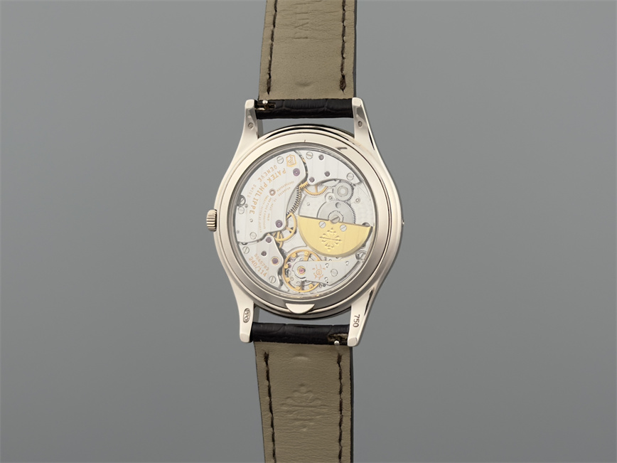 百达翡丽Ref.5140G,约2010年,卡拉卓华超薄自动万年历腕表,银色盘面,口径37毫米。透明底盖,卡拉卓华十字表冠;搭载机芯Cal.240/114,27颗宝石,22k金偏心迷你自动盘,Gyromax摆轮,双P印记;金质立体子弹时标,金质太子妃指针,万年历,月相,闰年,24小时盘。盘面/机芯/表壳签名百达翡丽。附百达翡丽原始折叠扣。