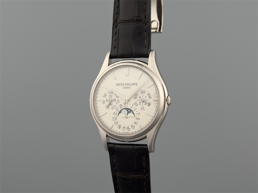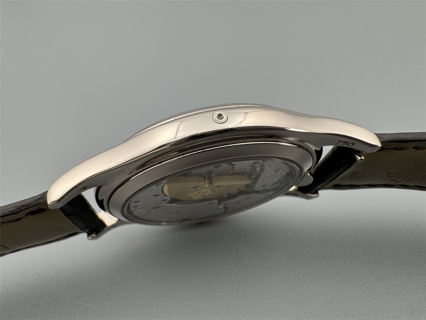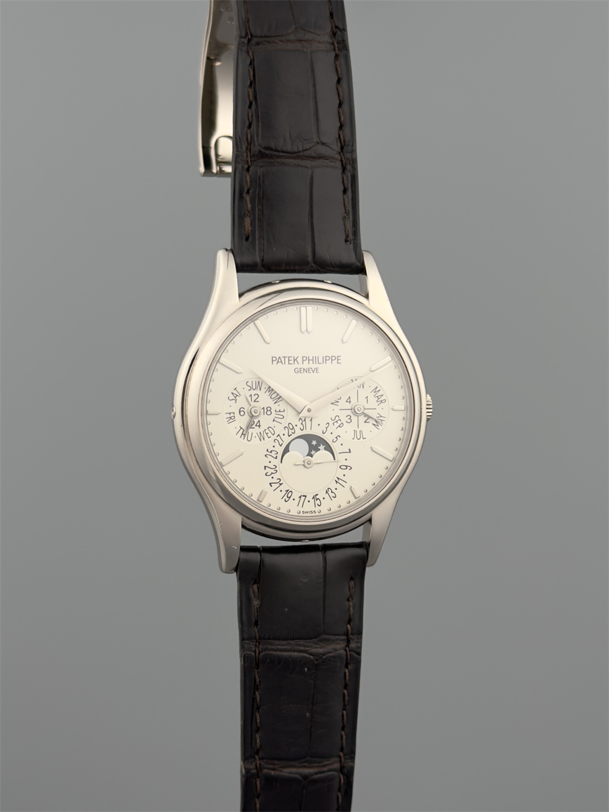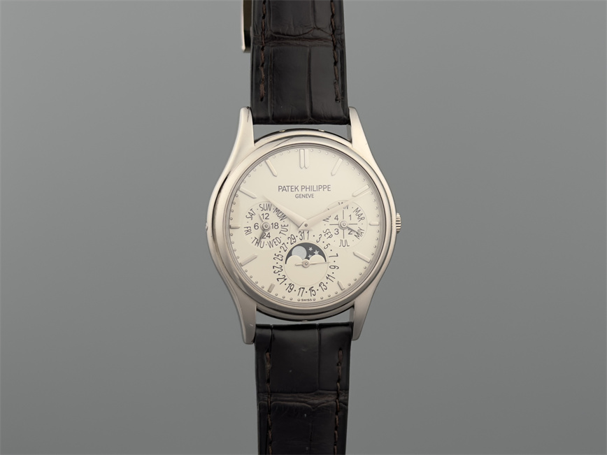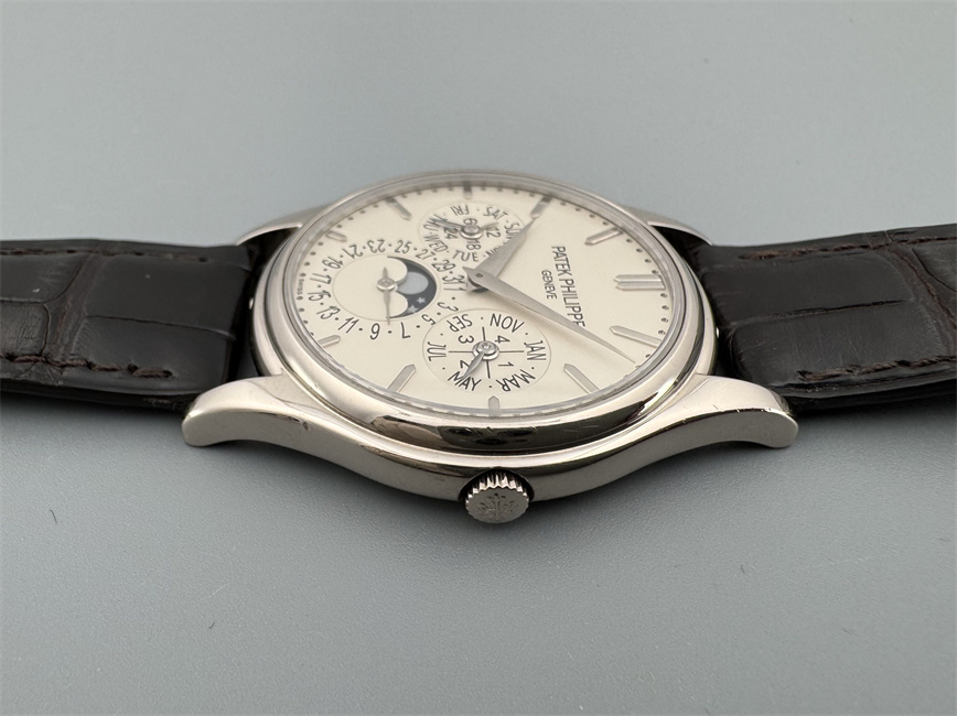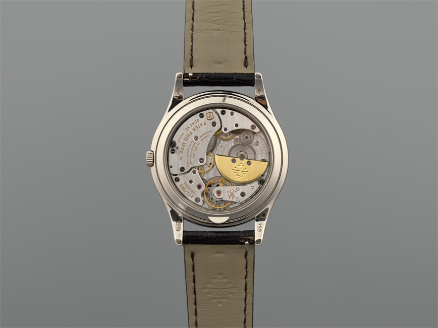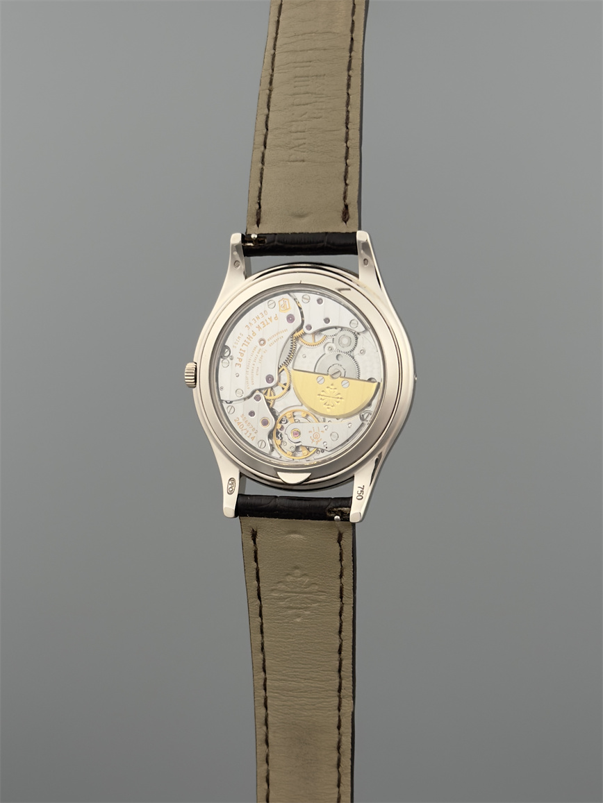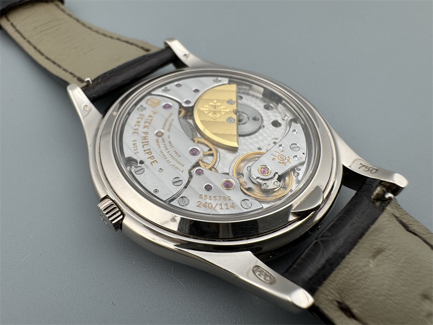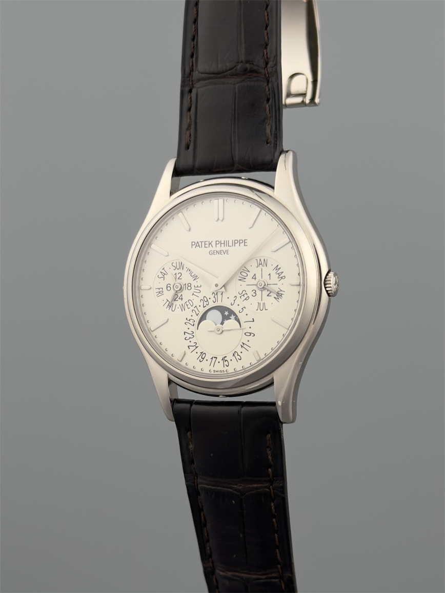 百达翡丽Ref.5140G,约2010年,卡拉卓华超薄自动万年历腕表,银色盘面,口径37毫米。透明底盖,卡拉卓华十字表冠;搭载机芯Cal.240/114,27颗宝石,22k金偏心迷你自动盘,Gyromax摆轮,双P印记;金质立体子弹时标,金质太子妃指针,万年历,月相,闰年,24小时盘。盘面/机芯/表壳签名百达翡丽。附百达翡丽原始折叠扣。
