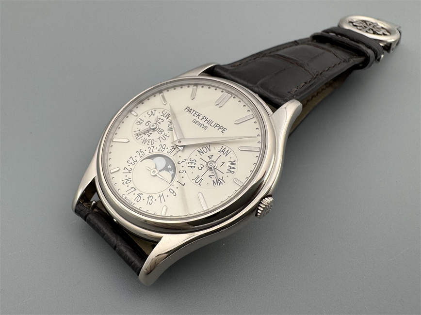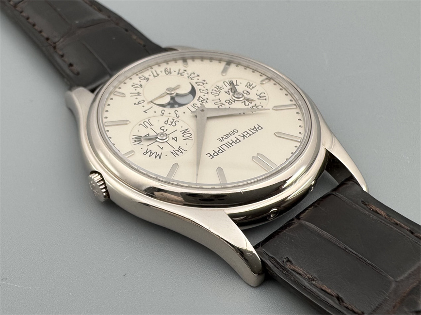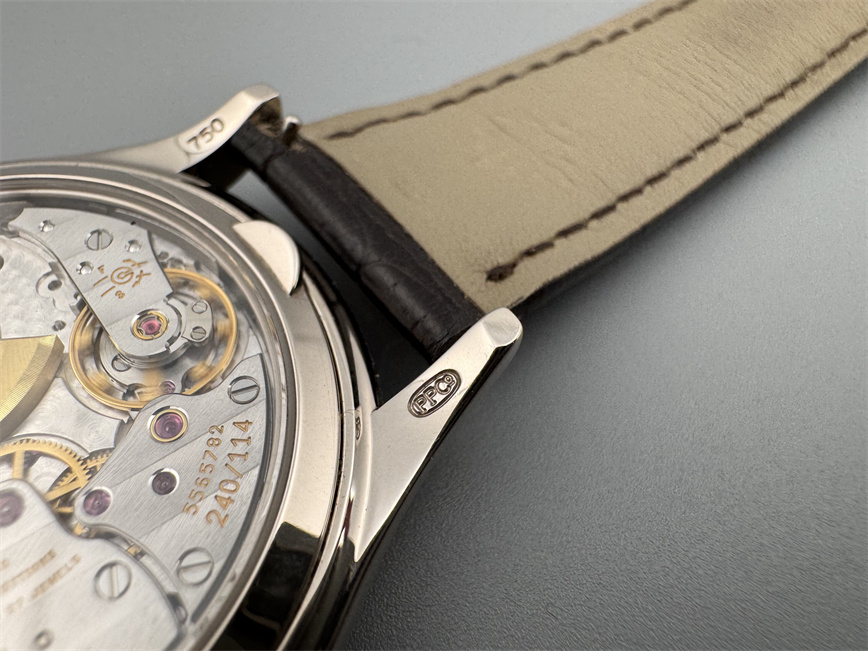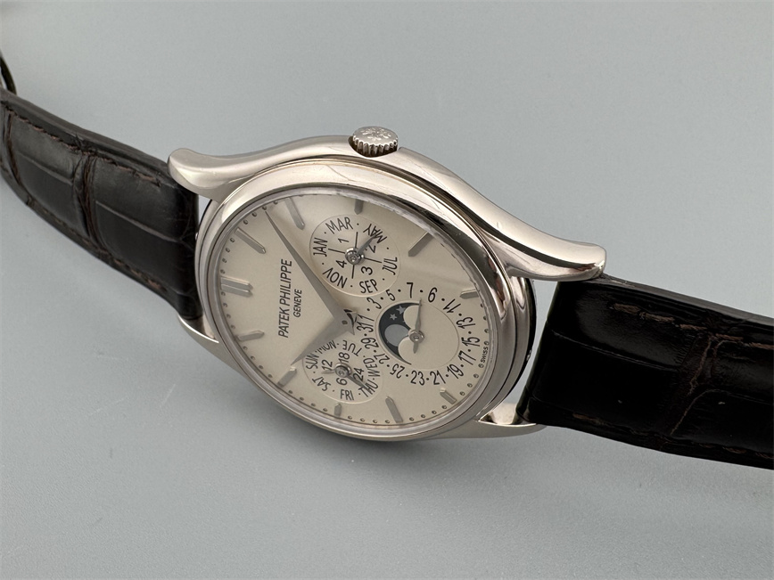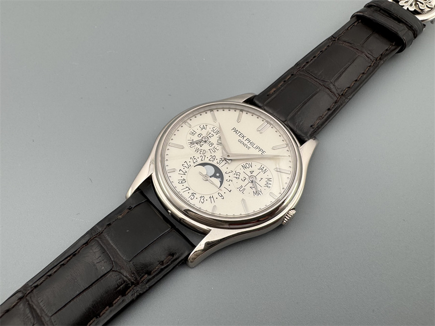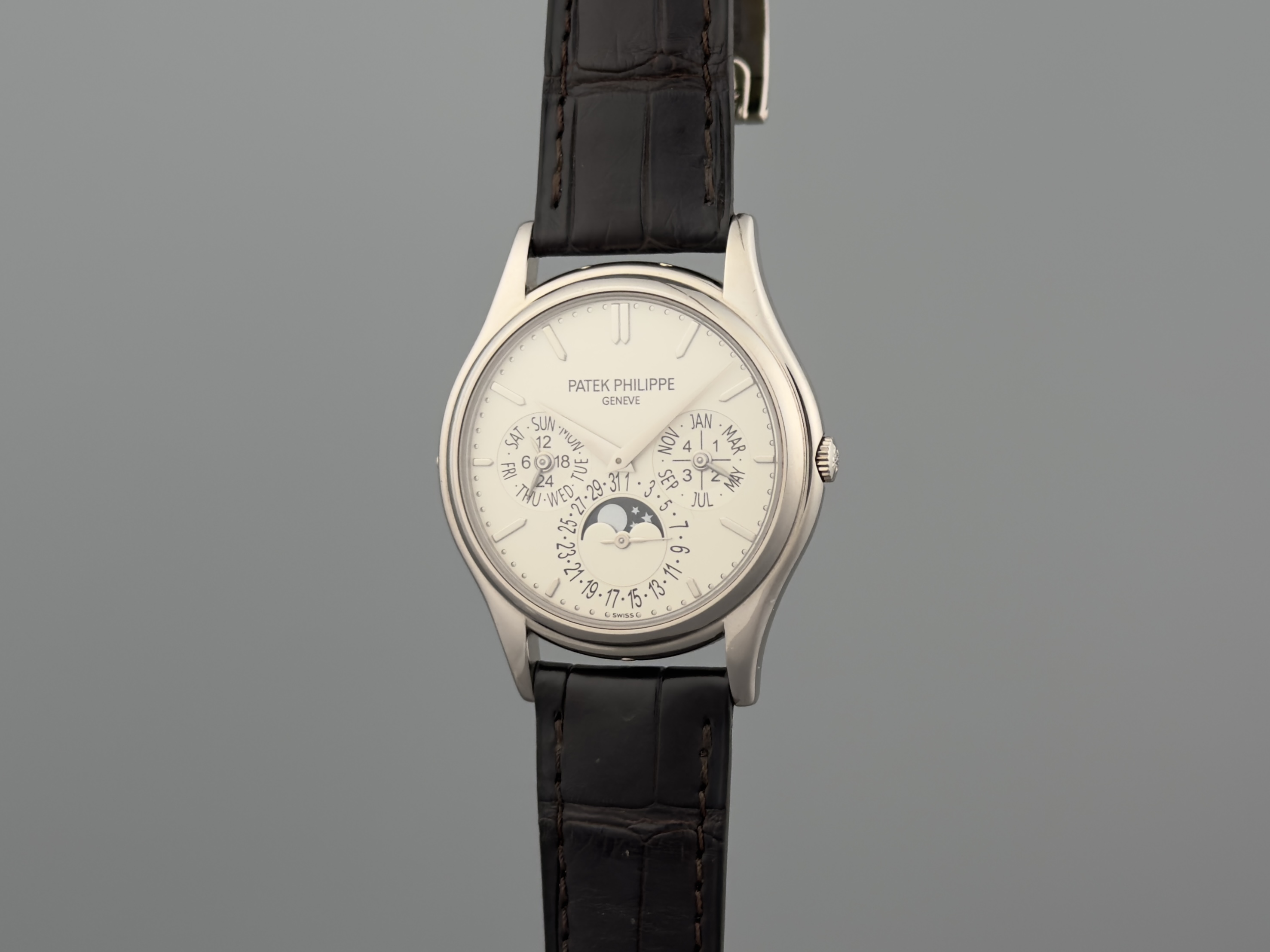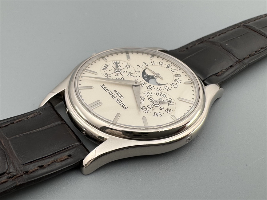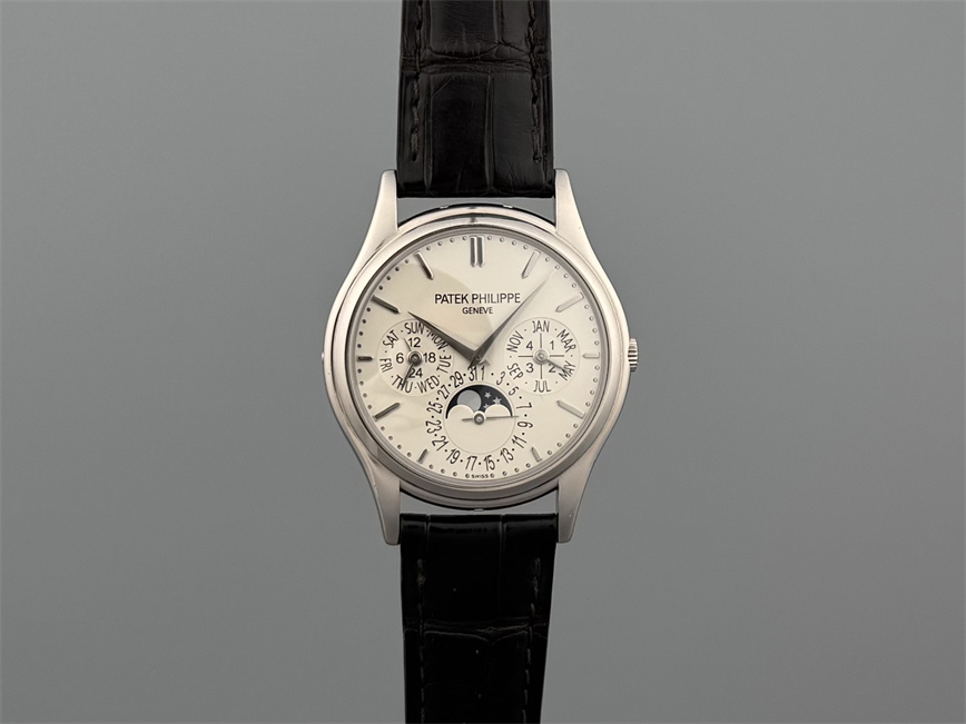 百达翡丽Ref.5140G,约2010年,卡拉卓华超薄自动万年历腕表,银色盘面,口径37毫米。透明底盖,卡拉卓华十字表冠;搭载机芯Cal.240/114,27颗宝石,22k金偏心迷你自动盘,Gyromax摆轮,双P印记;金质立体子弹时标,金质太子妃指针,万年历,月相,闰年,24小时盘。盘面/机芯/表壳签名百达翡丽。附百达翡丽原始折叠扣。