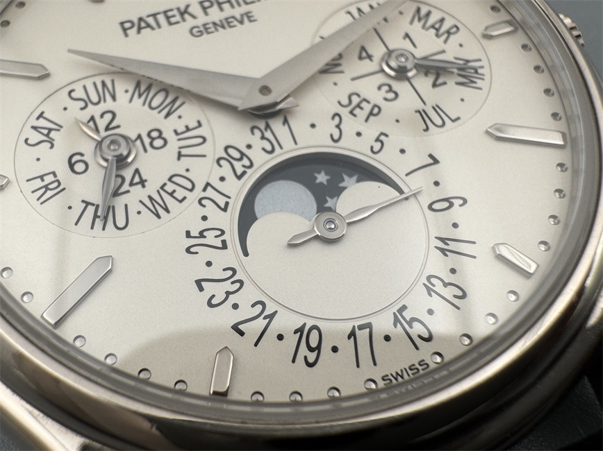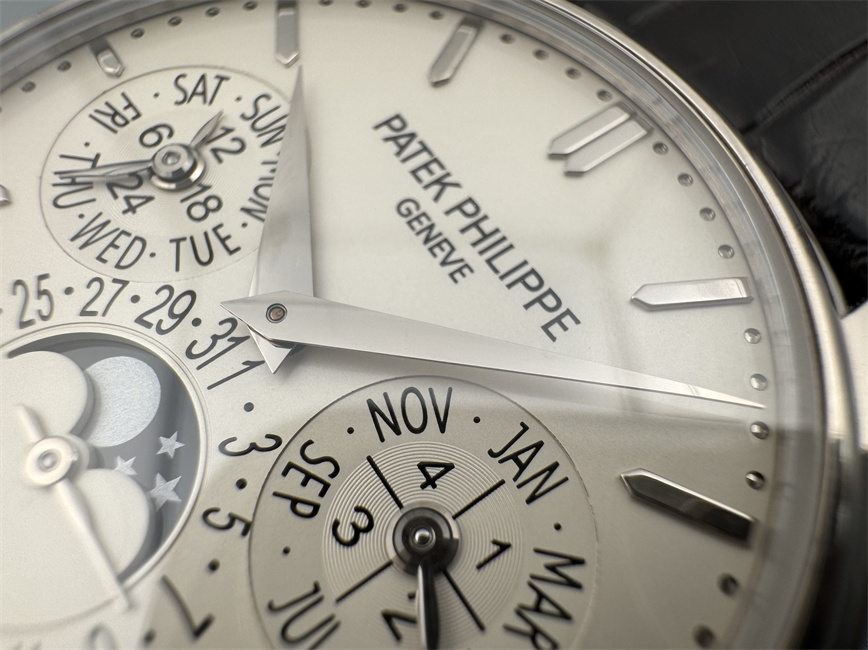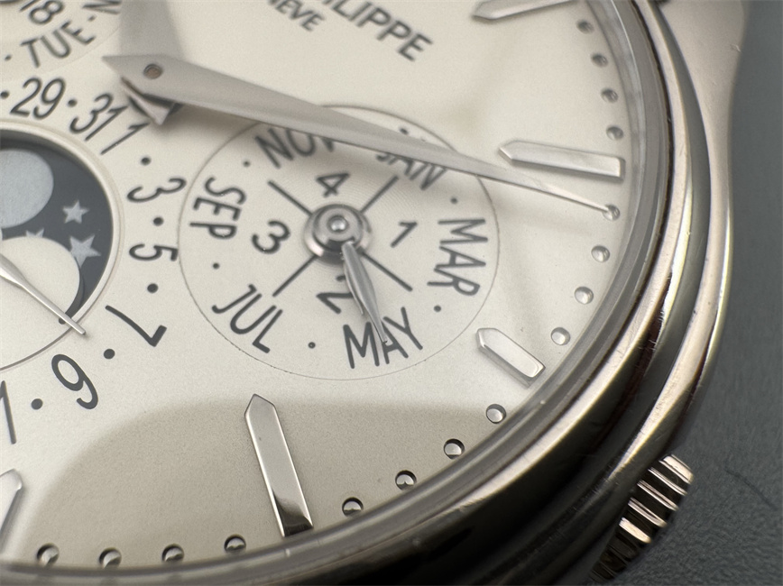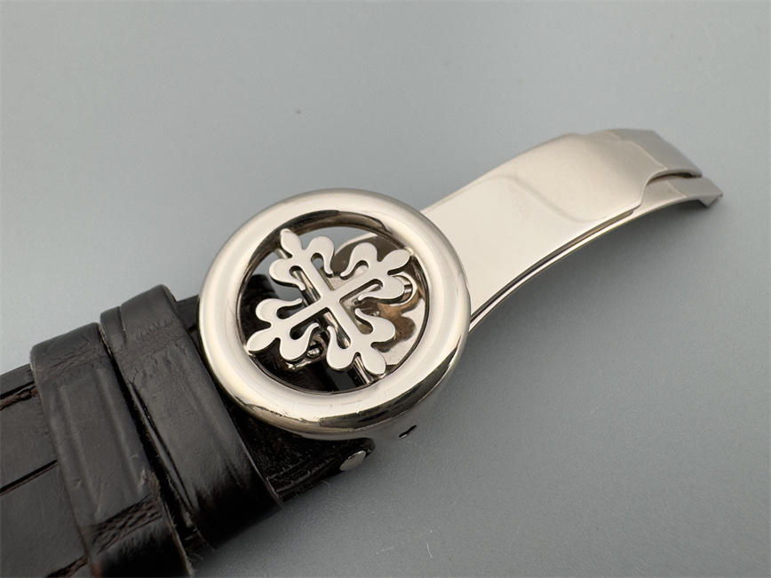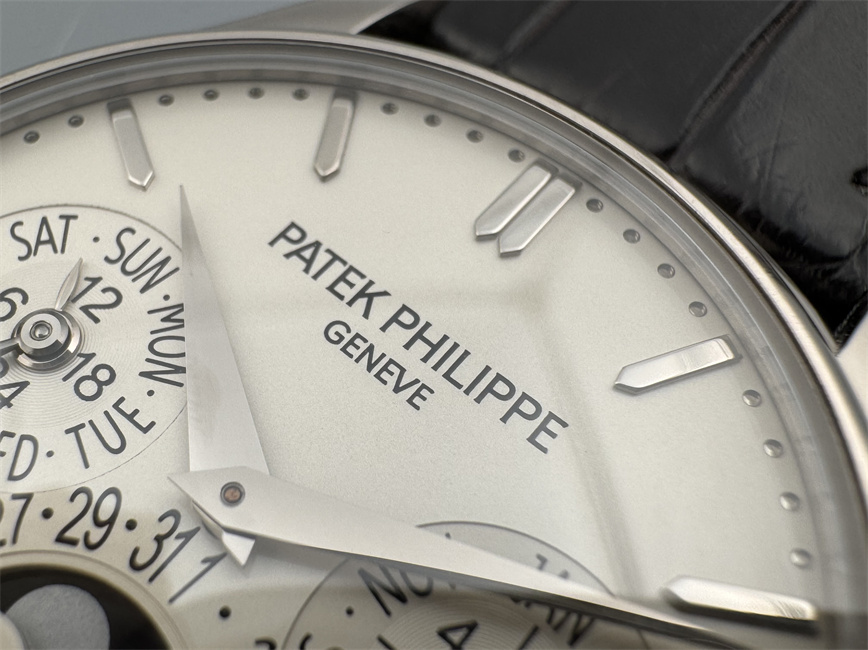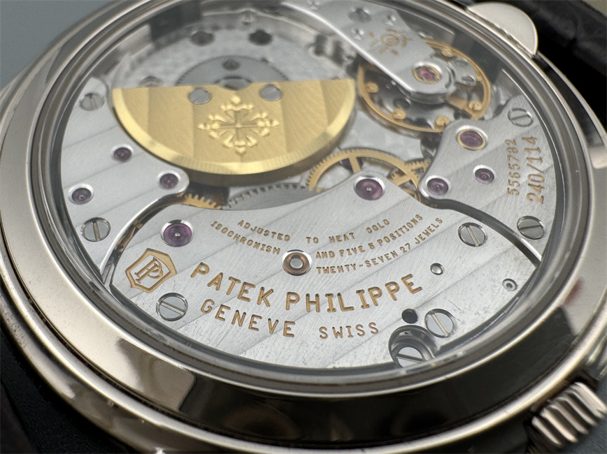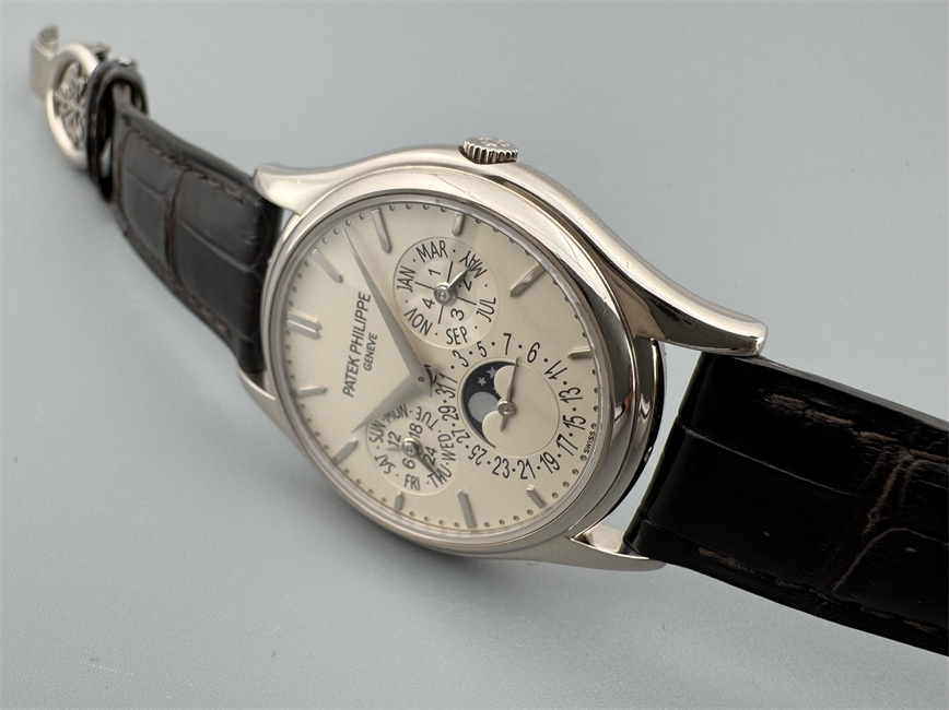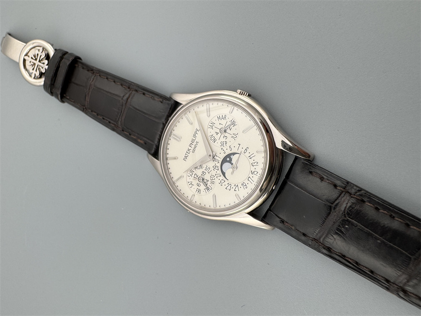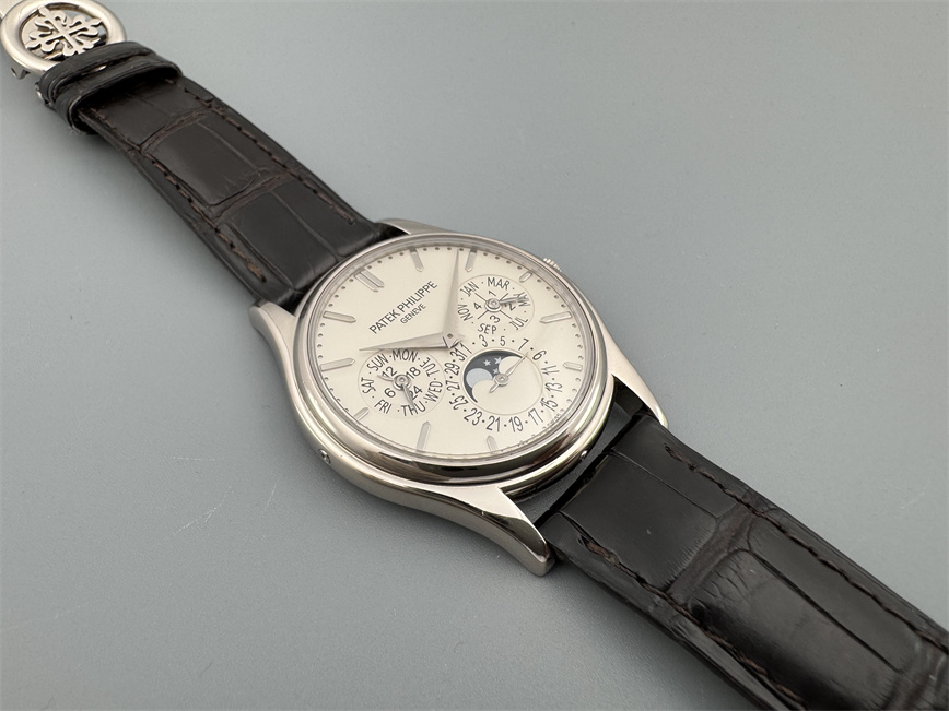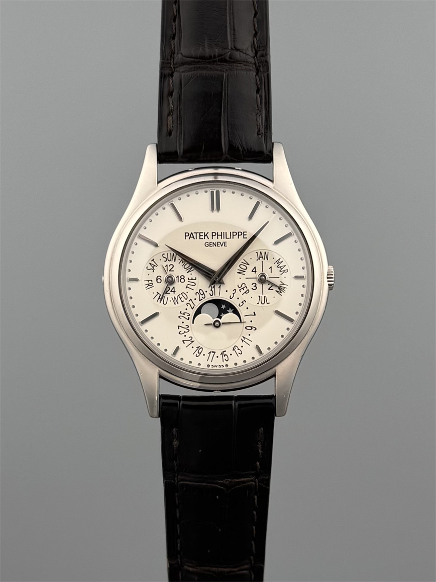 百达翡丽Ref.5140G,约2010年,卡拉卓华超薄自动万年历腕表,银色盘面,口径37毫米。透明底盖,卡拉卓华十字表冠;搭载机芯Cal.240/114,27颗宝石,22k金偏心迷你自动盘,Gyromax摆轮,双P印记;金质立体子弹时标,金质太子妃指针,万年历,月相,闰年,24小时盘。盘面/机芯/表壳签名百达翡丽。附百达翡丽原始折叠扣。