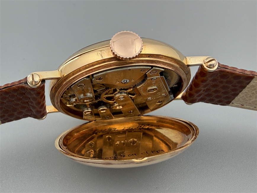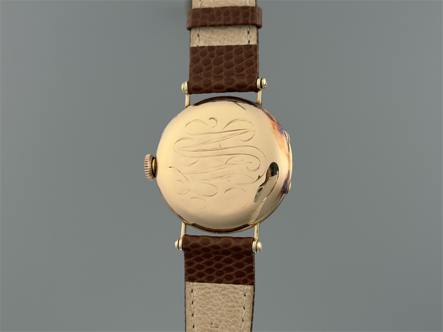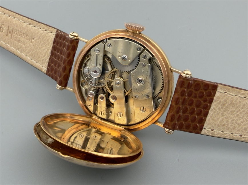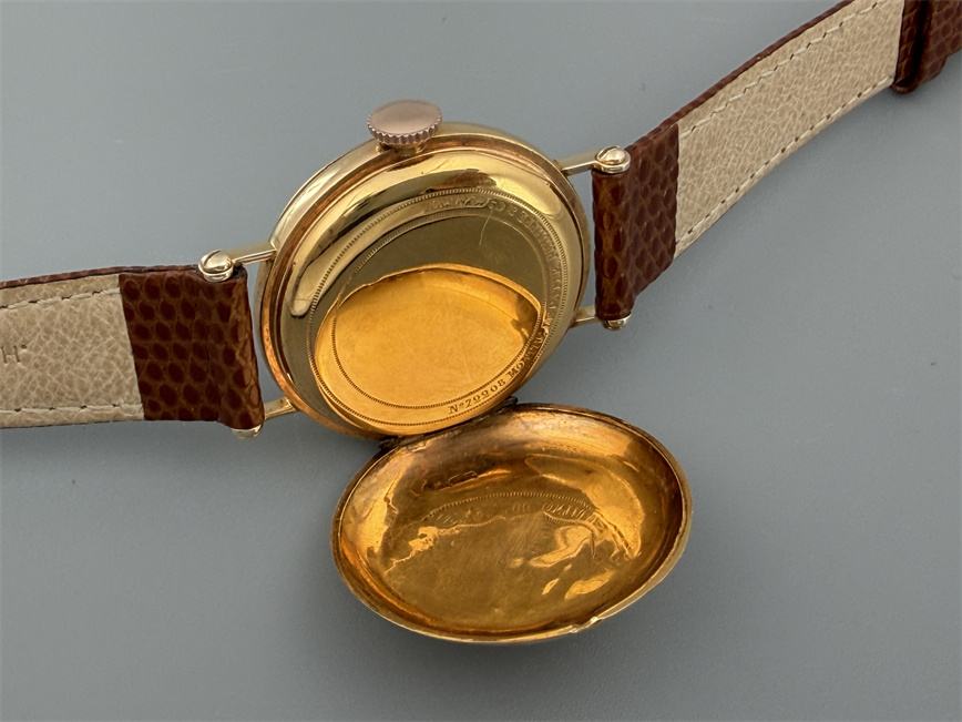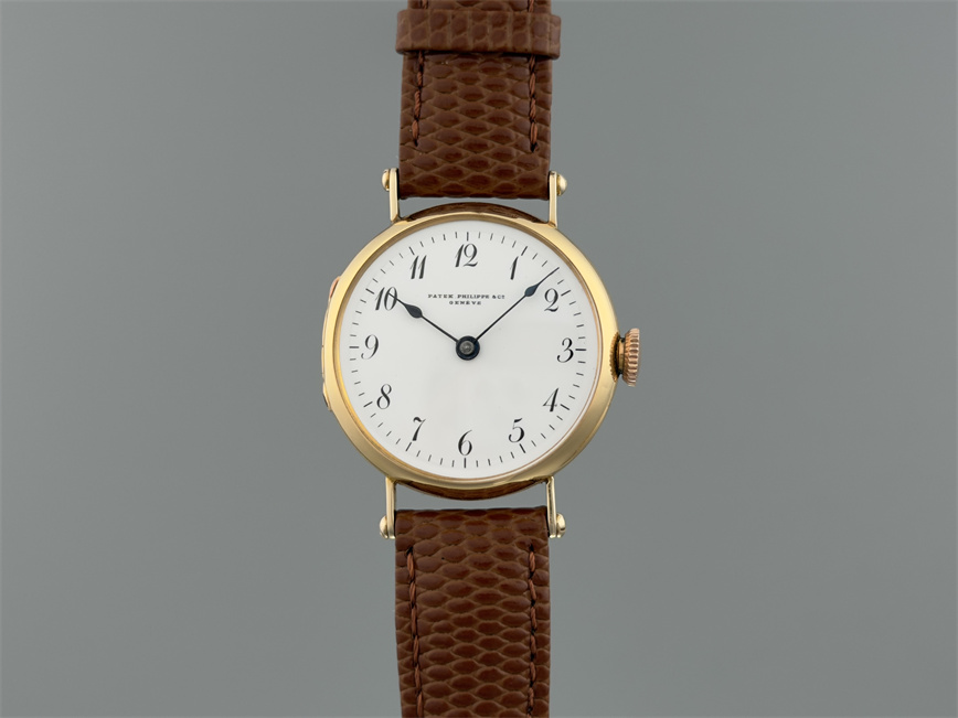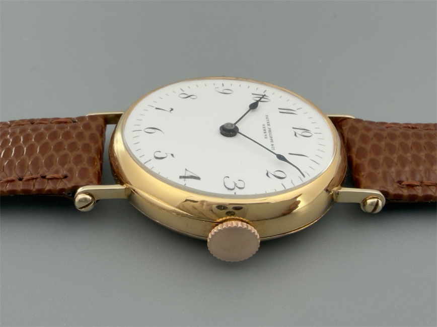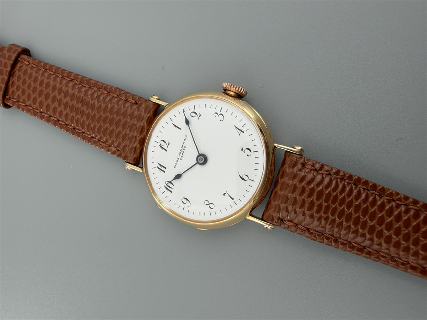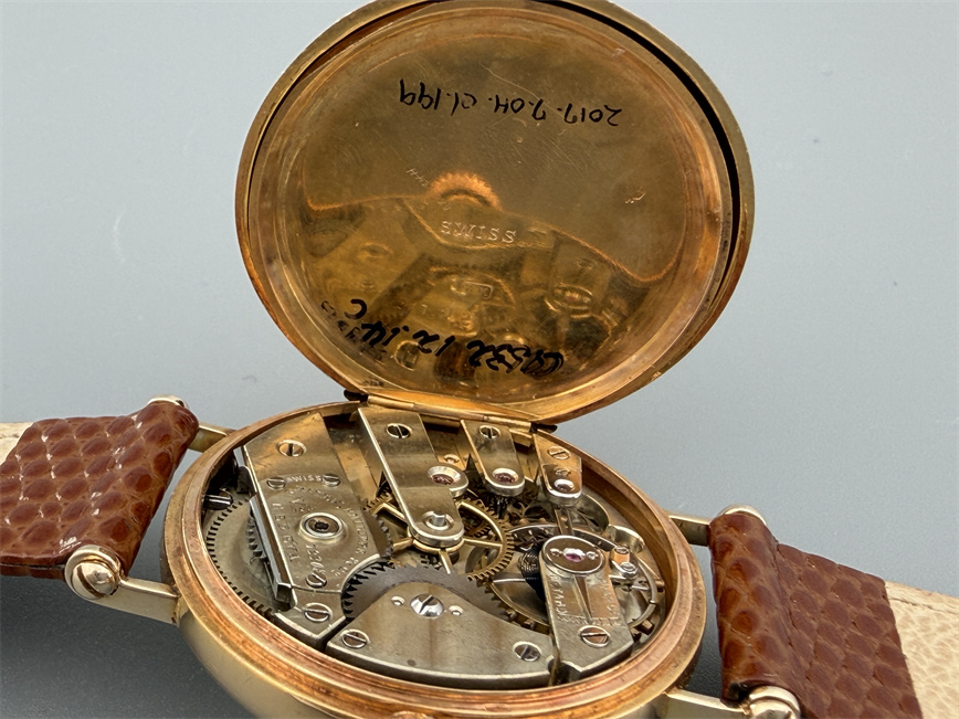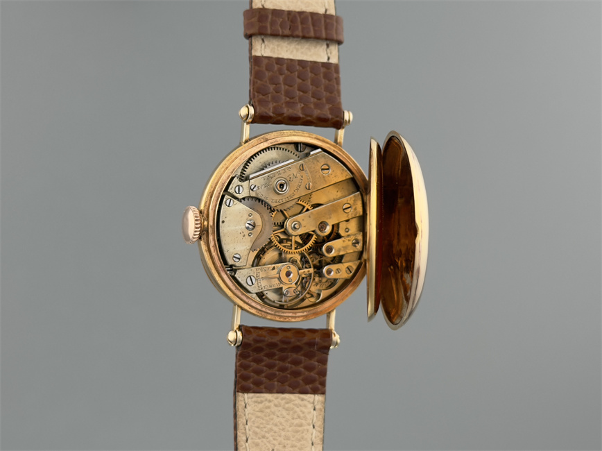 黄金材质,口径30毫米,手动上链,钢制怀表机芯,珐琅盘面,黑色宝玑字,长签名,蓝钢桃型指针,平表冠。可能由怀表改制。