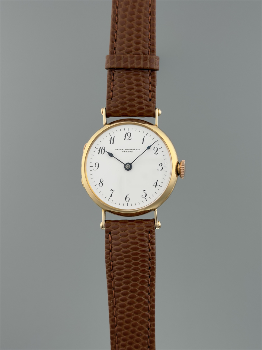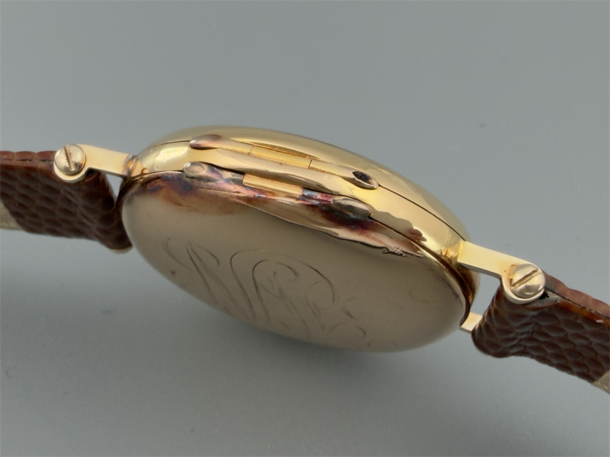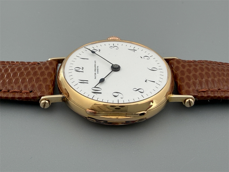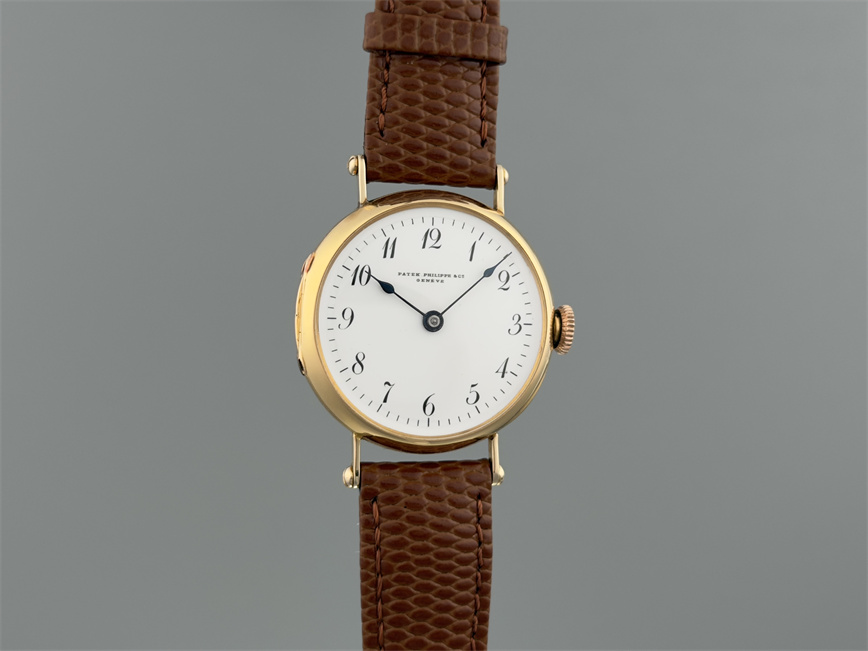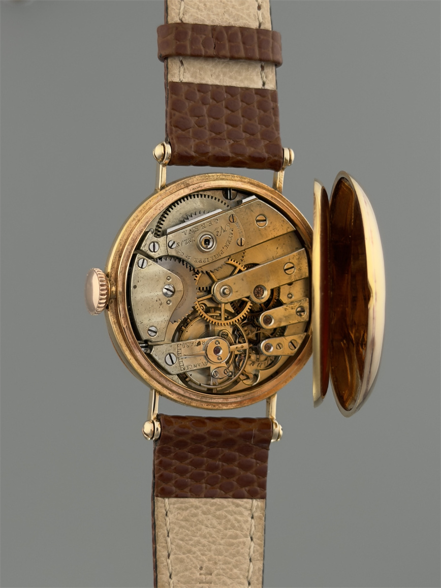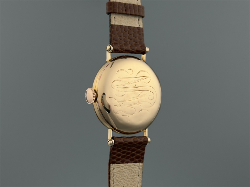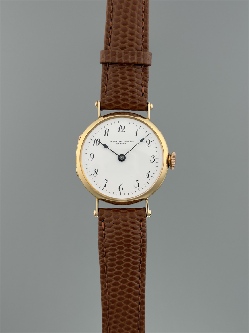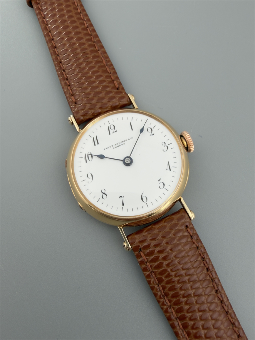 黄金材质,口径30毫米,手动上链,钢制怀表机芯,珐琅盘面,黑色宝玑字,长签名,蓝钢桃型指针,平表冠。可能由怀表改制。