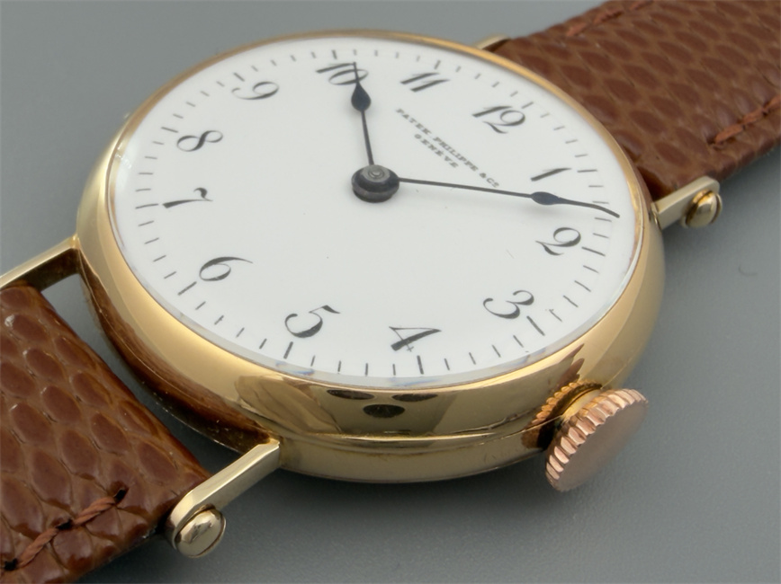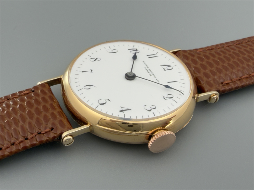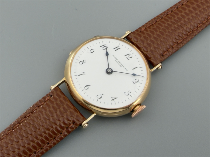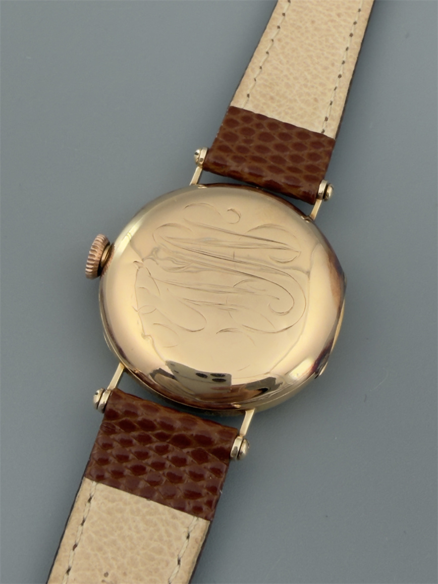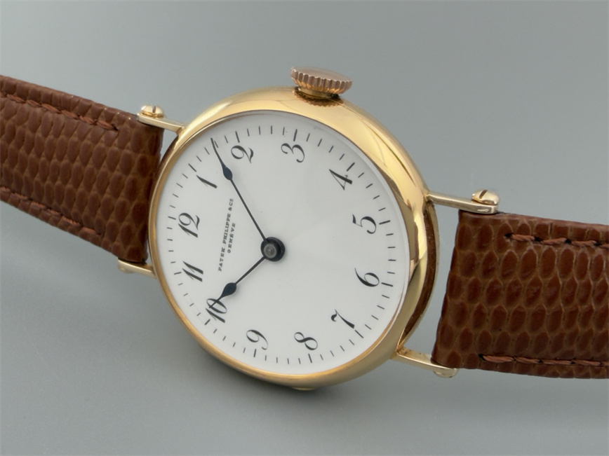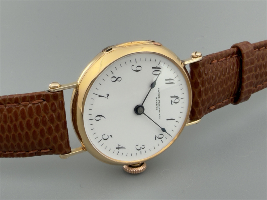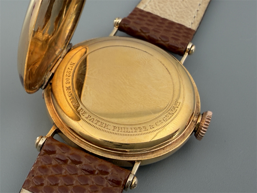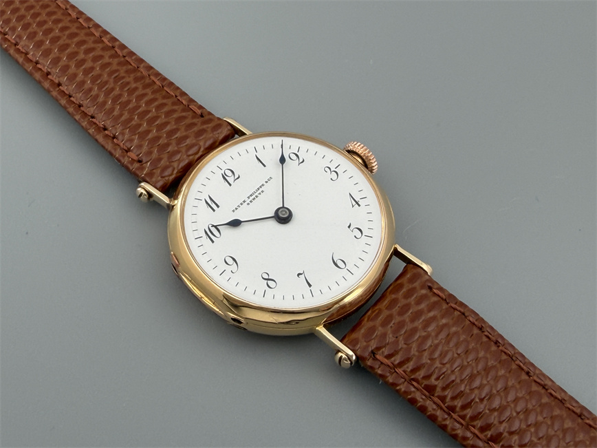 黄金材质,口径30毫米,手动上链,钢制怀表机芯,珐琅盘面,黑色宝玑字,长签名,蓝钢桃型指针,平表冠。可能由怀表改制。