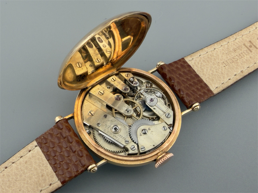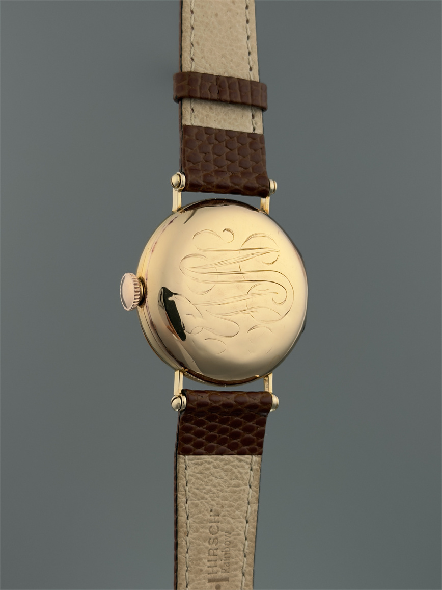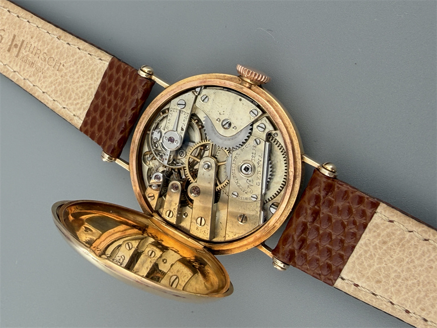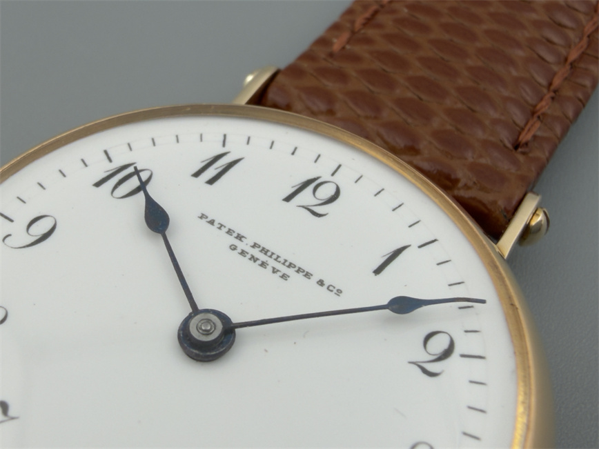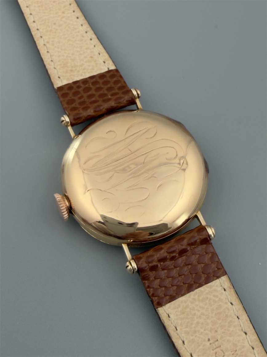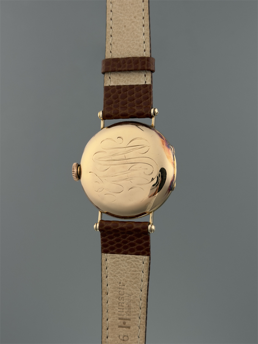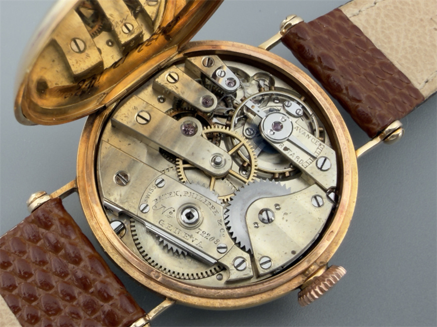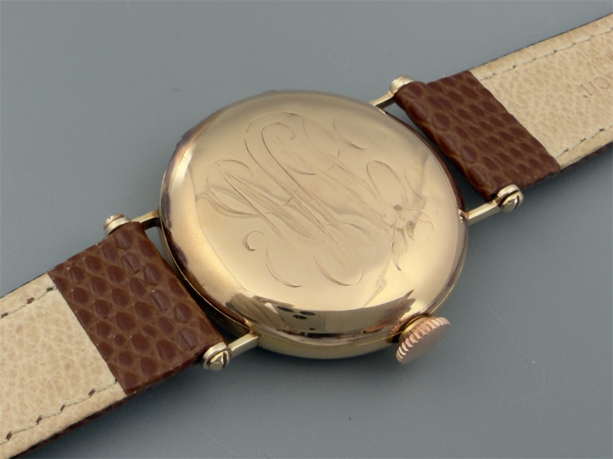 黄金材质,口径30毫米,手动上链,钢制怀表机芯,珐琅盘面,黑色宝玑字,长签名,蓝钢桃型指针,平表冠。可能由怀表改制。