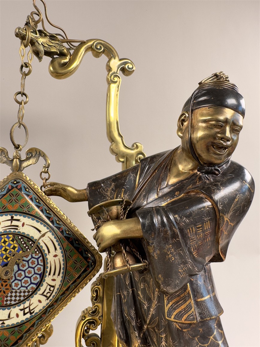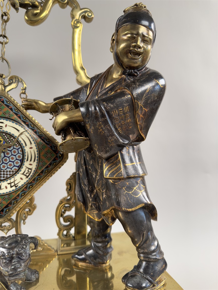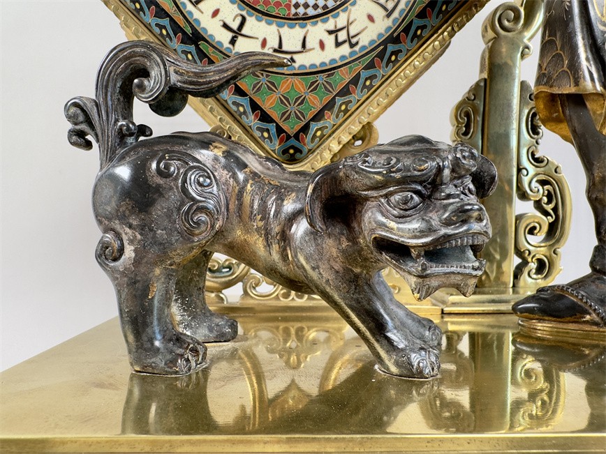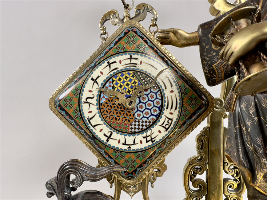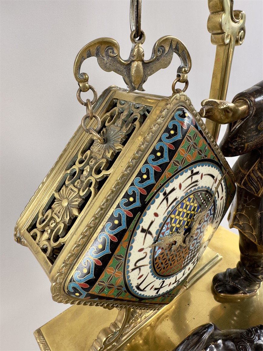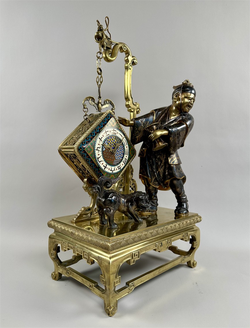 青铜与珐琅装饰的日式风格壁炉座钟,高 56 厘米,由法国十九世纪艺术大师爱德华·利弗设计,约 1870 年。方形珐琅装饰钟盘,带有汉字时标和龙形指针;悬挂于龙形柱子之上,旁边是手拿沙漏,着传统服装的人物以及狮子,整个情境安置于桌子形状的底座之上。