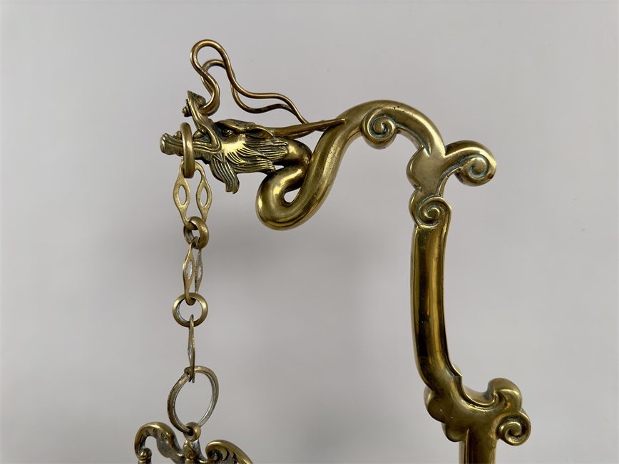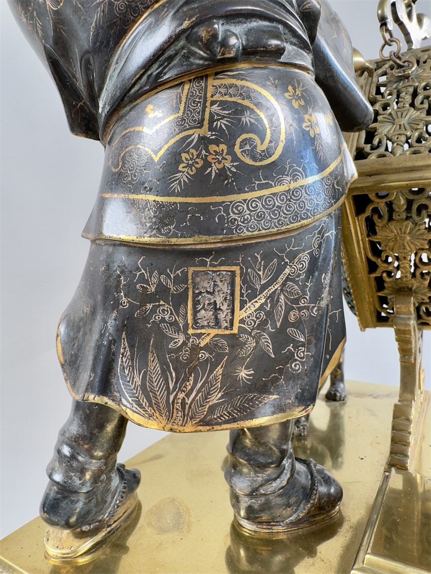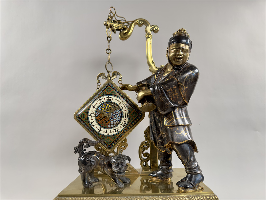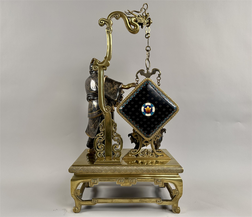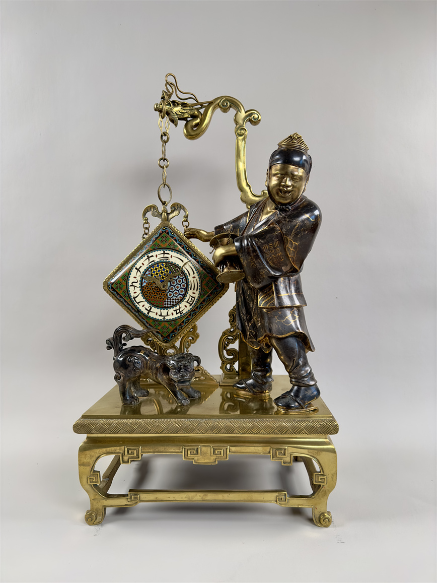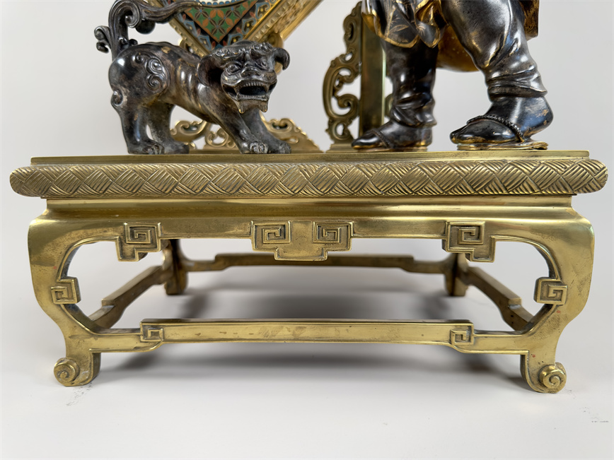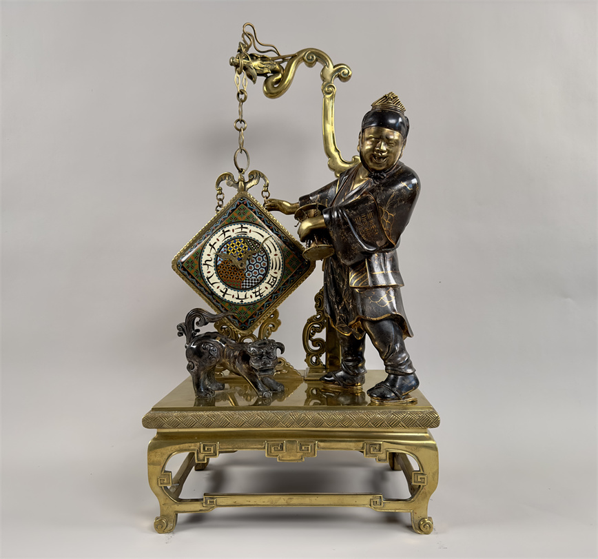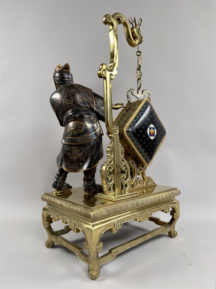 青铜与珐琅装饰的日式风格壁炉座钟,高 56 厘米,由法国十九世纪艺术大师爱德华·利弗设计,约 1870 年。方形珐琅装饰钟盘,带有汉字时标和龙形指针;悬挂于龙形柱子之上,旁边是手拿沙漏,着传统服装的人物以及狮子,整个情境安置于桌子形状的底座之上。