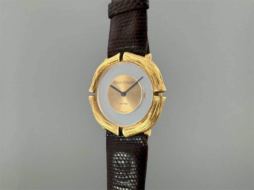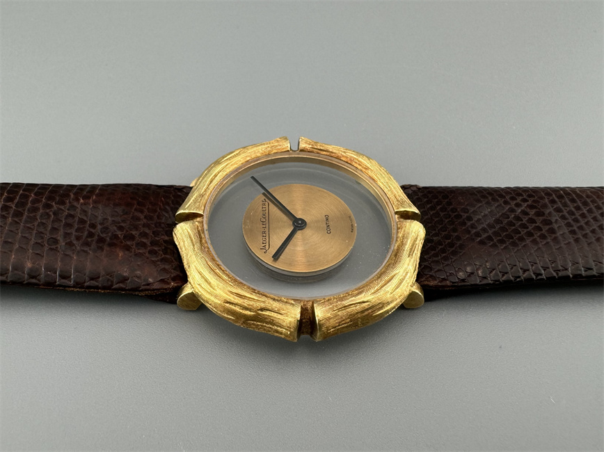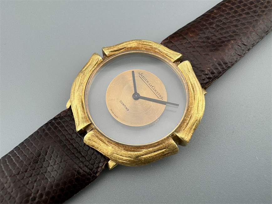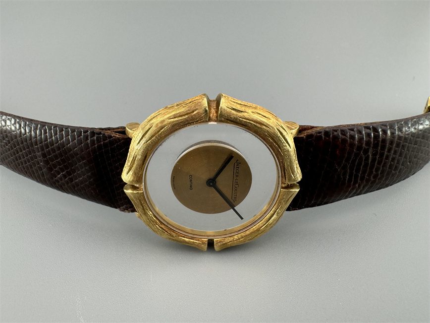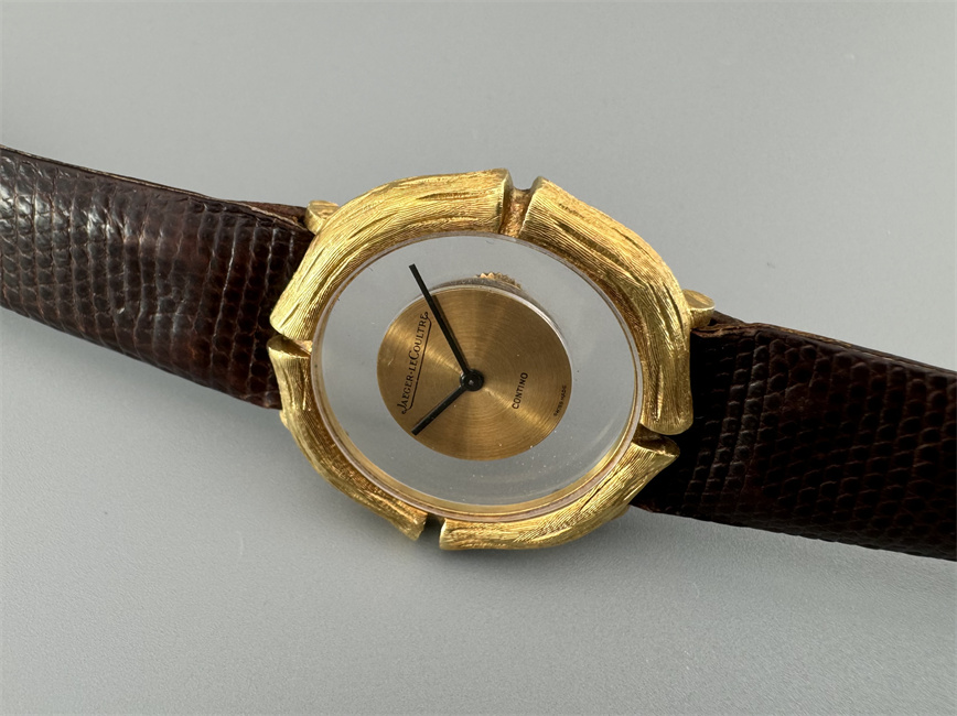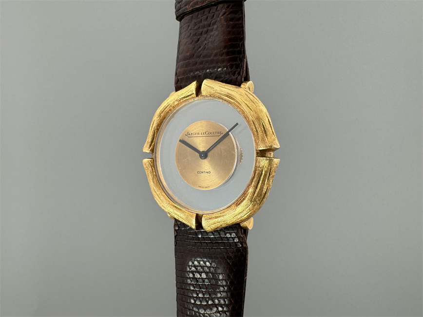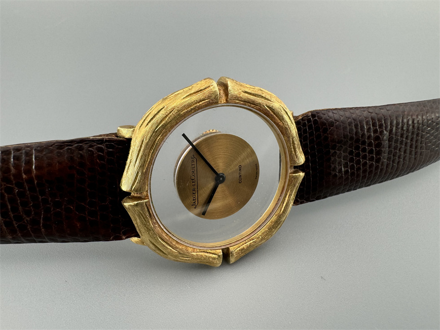 积家JAEGER-LECOULTRE,竹之谜,Bamboo Mystery,1970年代,口径32毫米。18k黄金圆形表壳,竹节形状表圈,以竹节的开口处作为3/6/9/12的时标,神秘表盘,双签名Contino,棒形指针,手动机芯Cal.430,17颗宝石,附积家表扣。