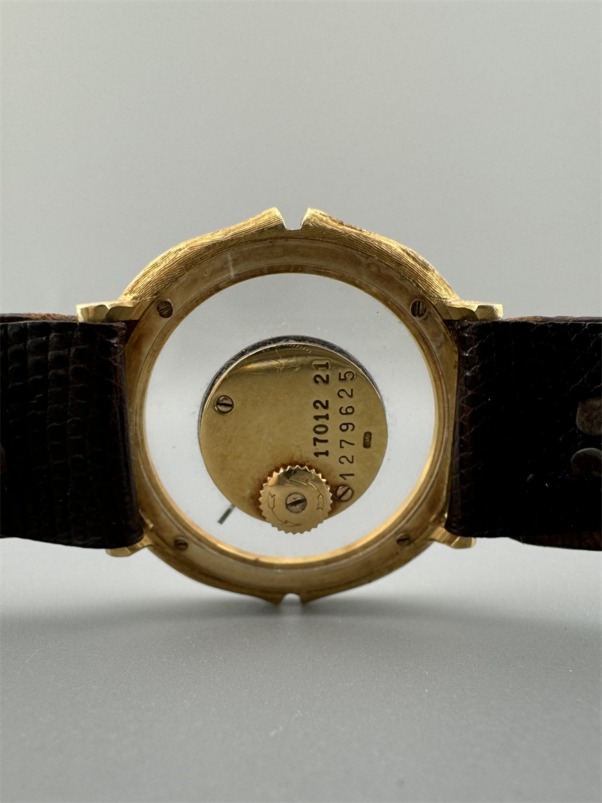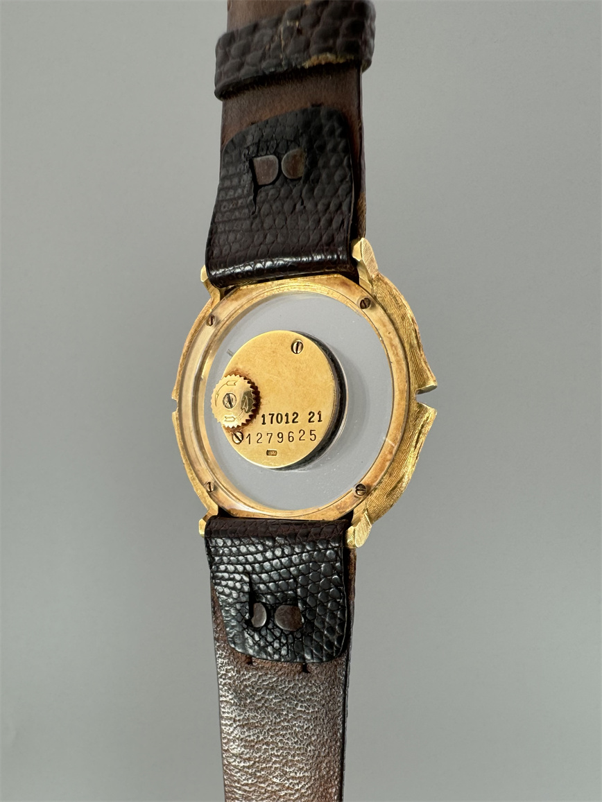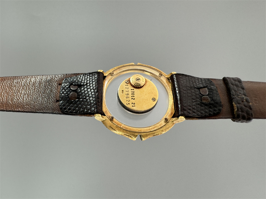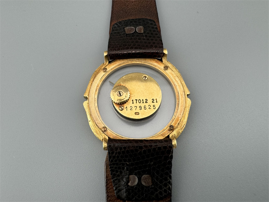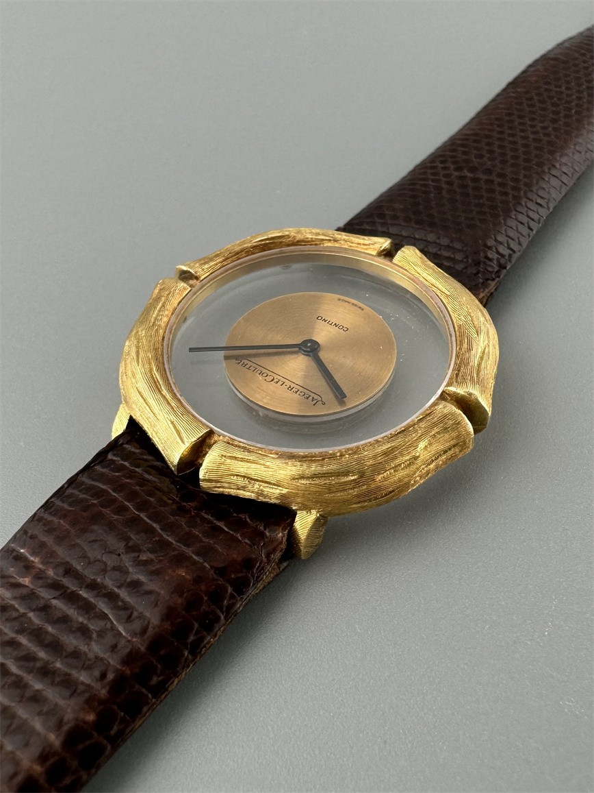 积家JAEGER-LECOULTRE,竹之谜,Bamboo Mystery,1970年代,口径32毫米。18k黄金圆形表壳,竹节形状表圈,以竹节的开口处作为3/6/9/12的时标,神秘表盘,双签名Contino,棒形指针,手动机芯Cal.430,17颗宝石,附积家表扣。