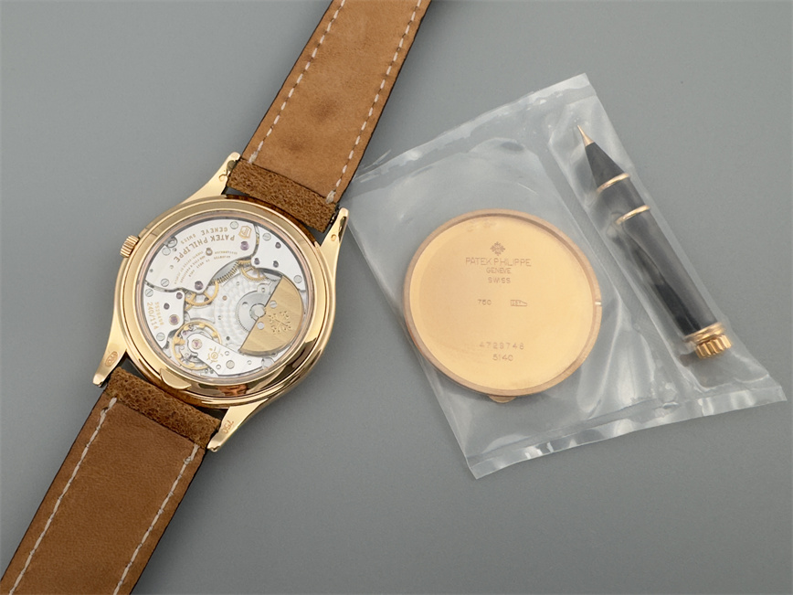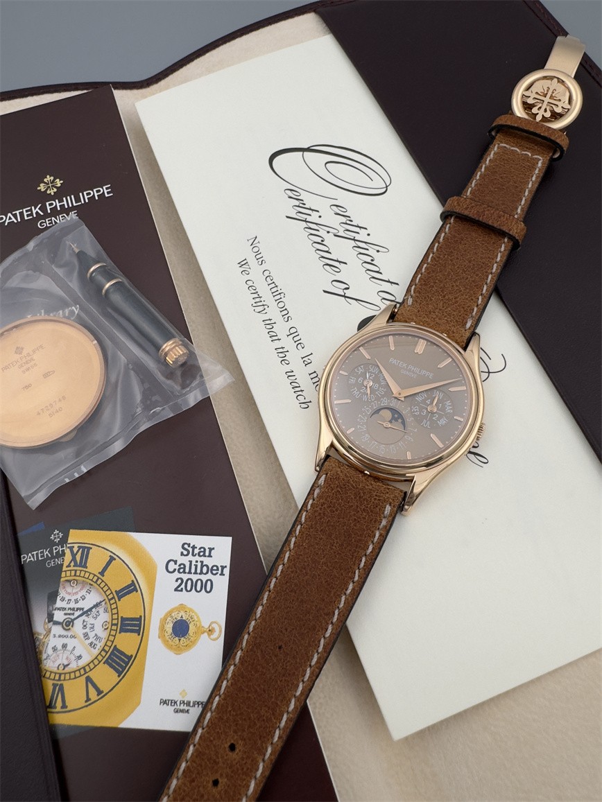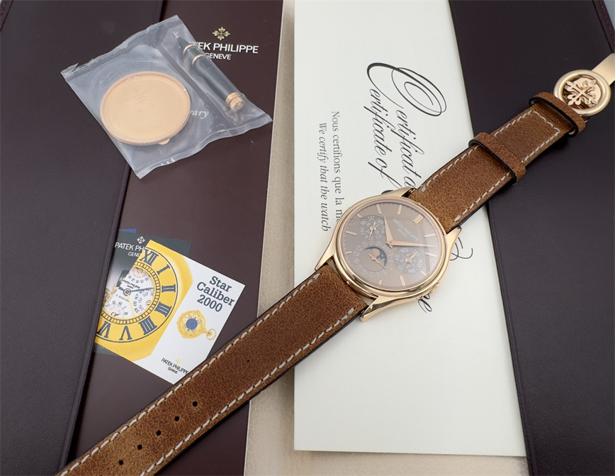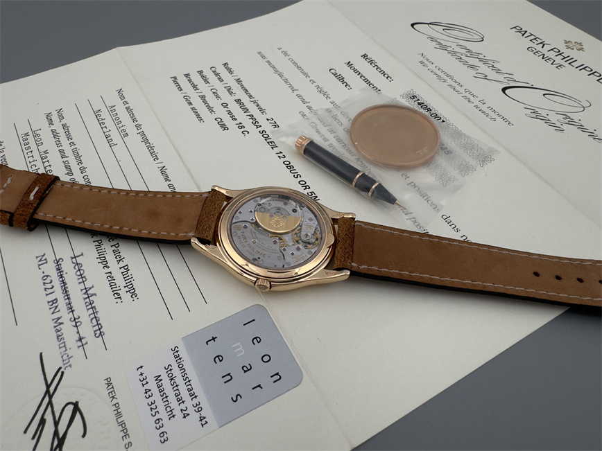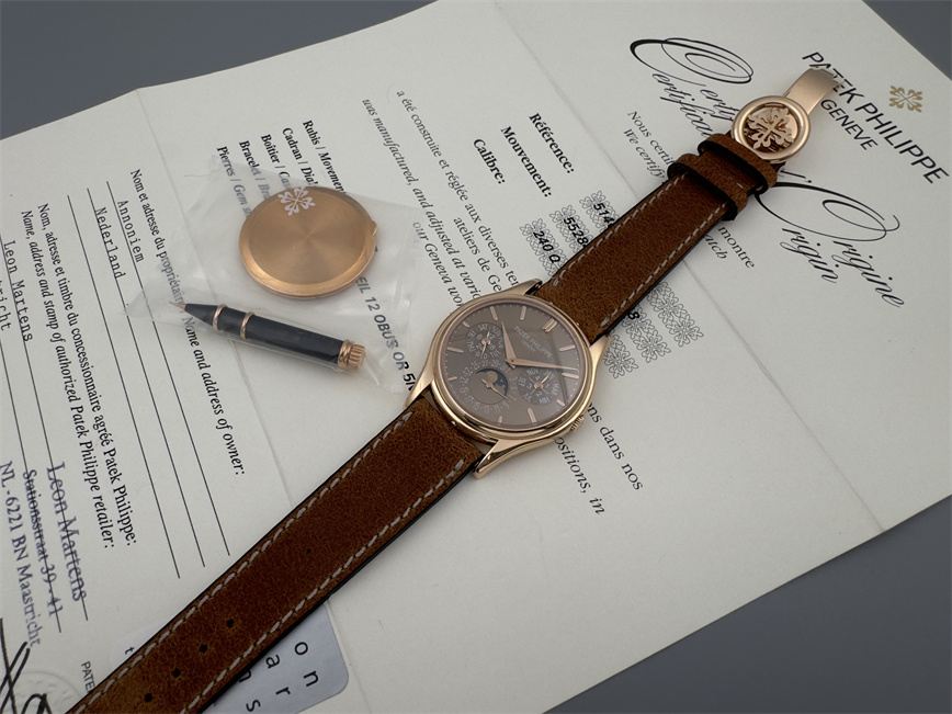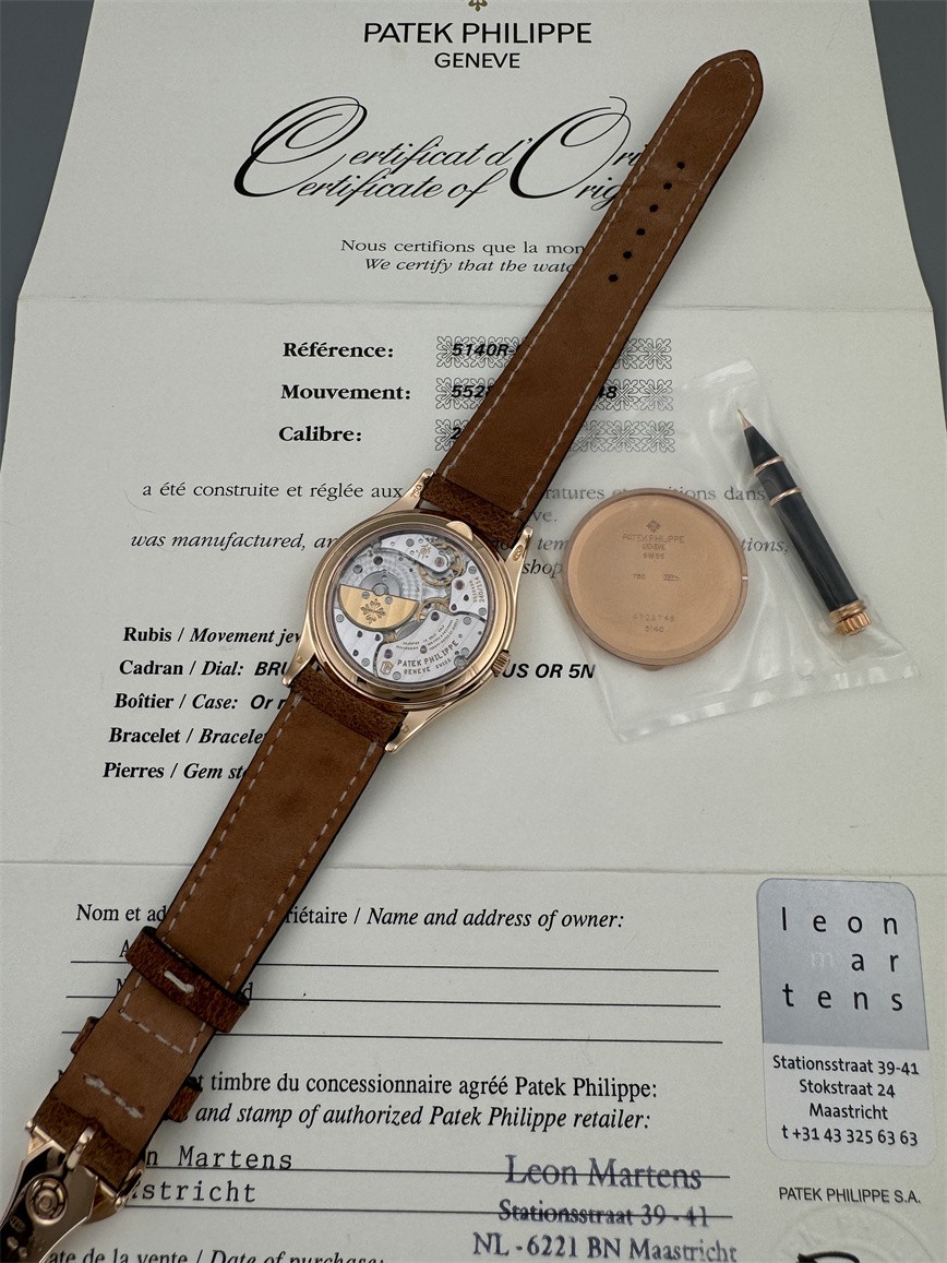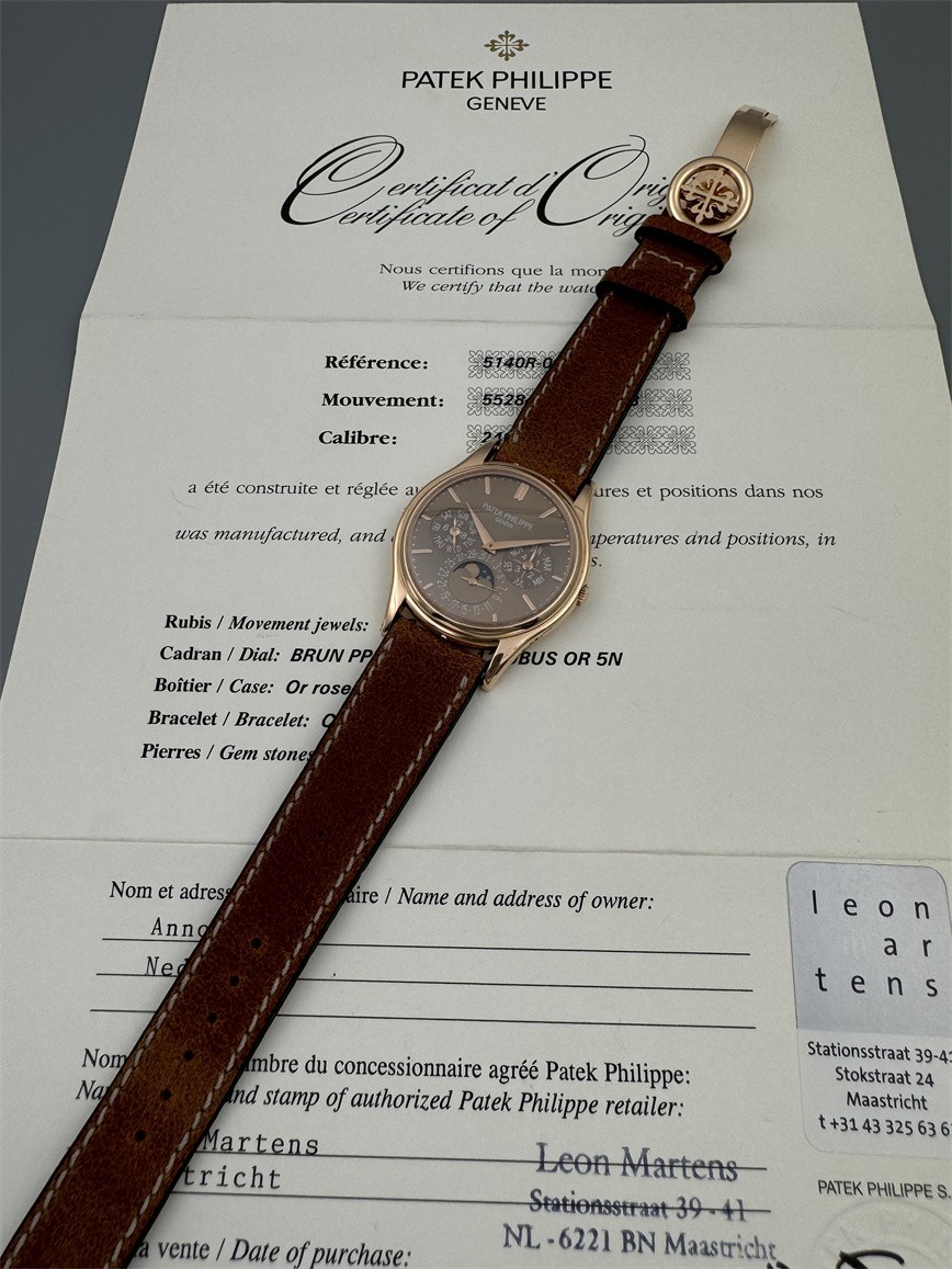 百达翡丽Ref.5140,卡拉卓华,超薄自动万年历腕表,红金材质,咖啡色盘面,口径37毫米,约2009年。透明底盖,卡拉卓华十字表冠;搭载机芯Cal.240/114,27颗宝石,22k金偏心迷你自动盘,Gyromax摆轮,日内瓦印记;银色盘面,金质立体子弹时标,金质太子妃指针,万年历,月相,闰年,24小时盘。盘面/机芯/表壳签名百达翡丽。附百达翡丽原始证书、金质底盖、调节笔及原始折叠扣。