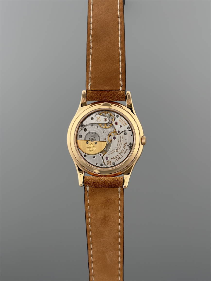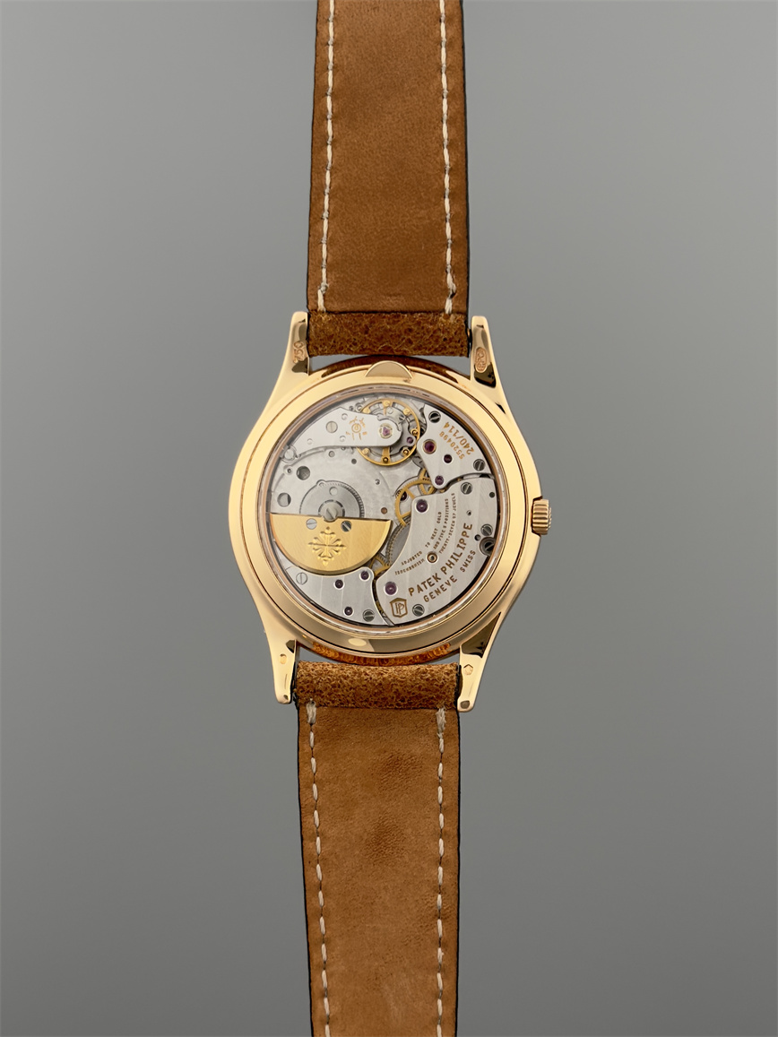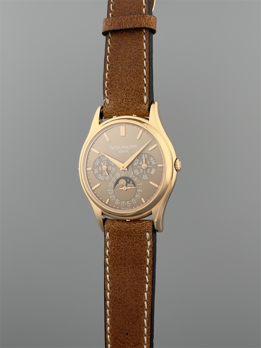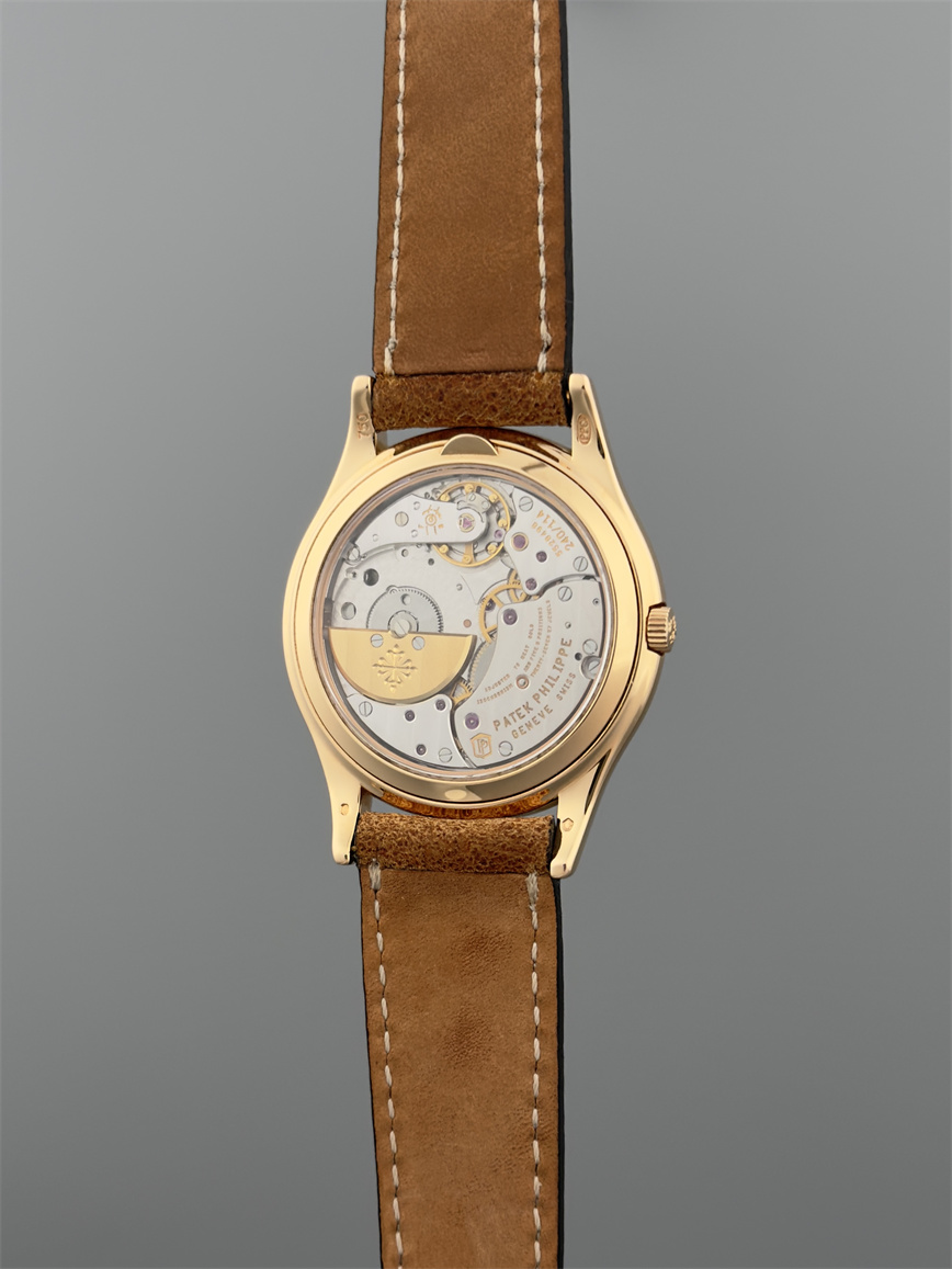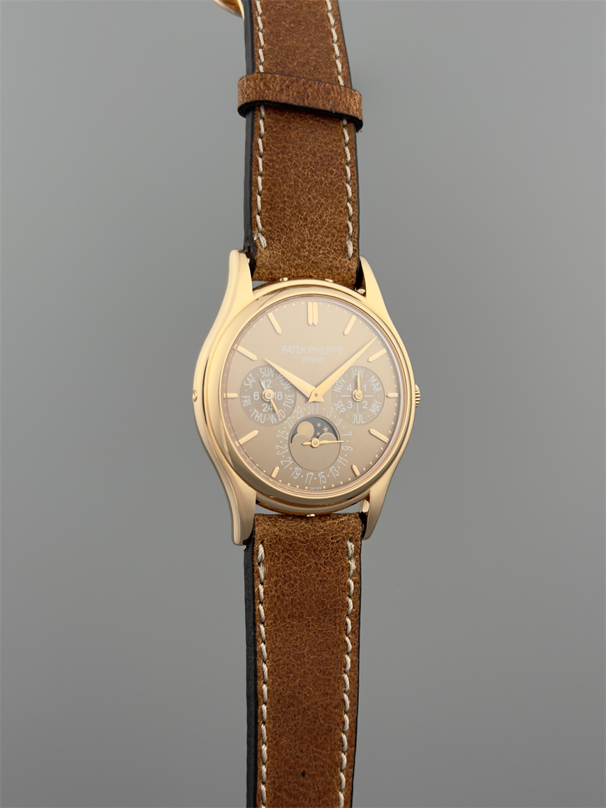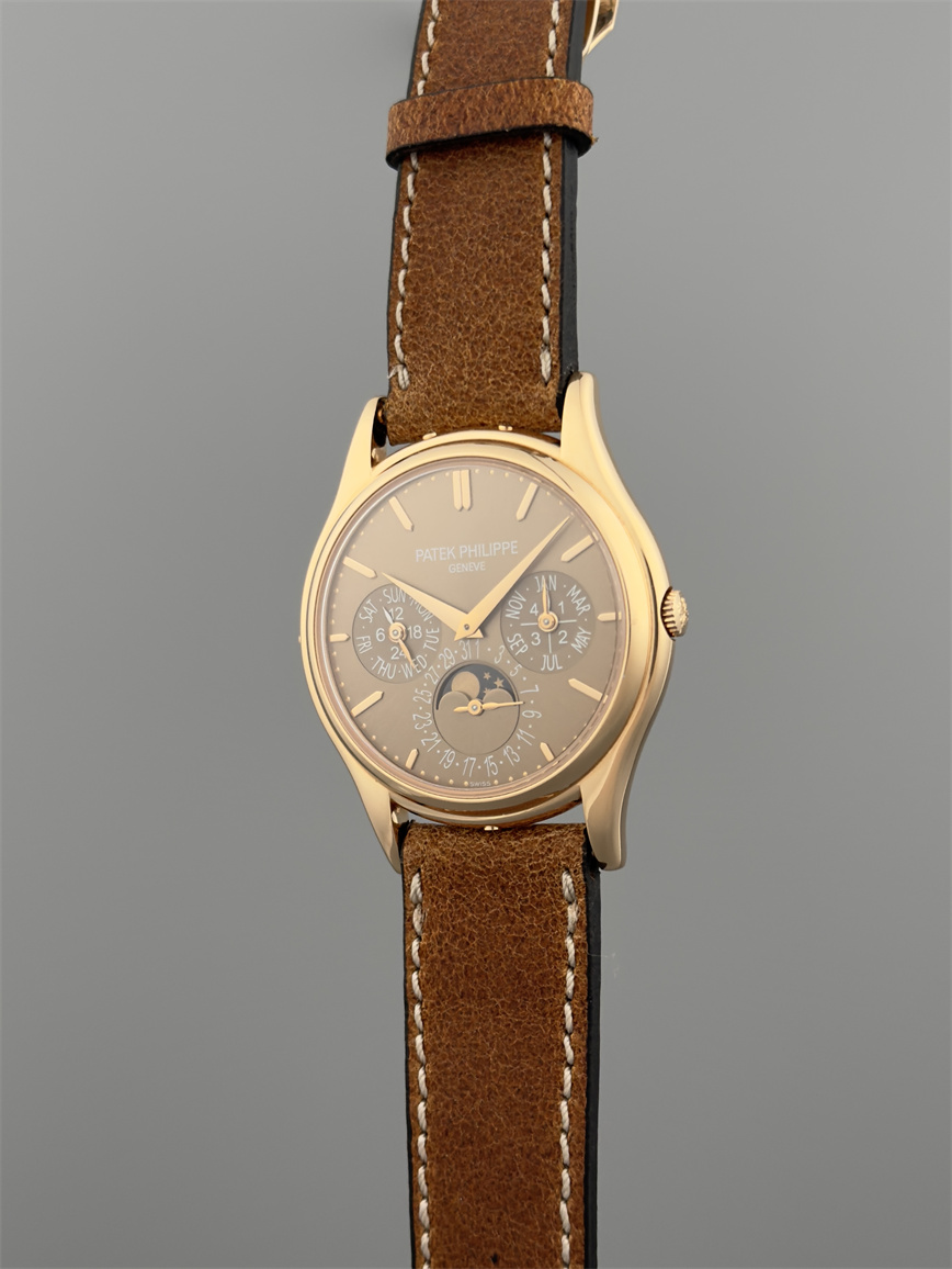 百达翡丽Ref.5140,卡拉卓华,超薄自动万年历腕表,红金材质,咖啡色盘面,口径37毫米,约2009年。透明底盖,卡拉卓华十字表冠;搭载机芯Cal.240/114,27颗宝石,22k金偏心迷你自动盘,Gyromax摆轮,日内瓦印记;银色盘面,金质立体子弹时标,金质太子妃指针,万年历,月相,闰年,24小时盘。盘面/机芯/表壳签名百达翡丽。附百达翡丽原始证书、金质底盖、调节笔及原始折叠扣。
