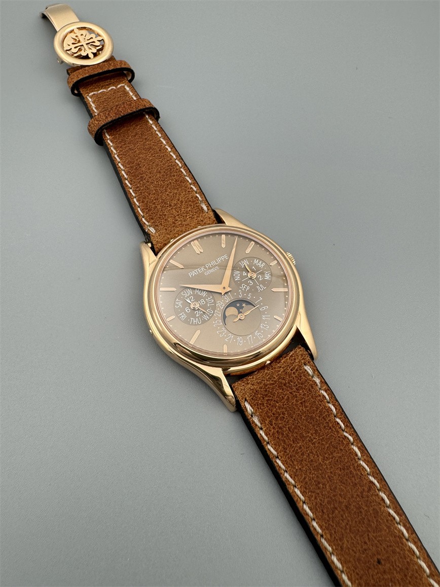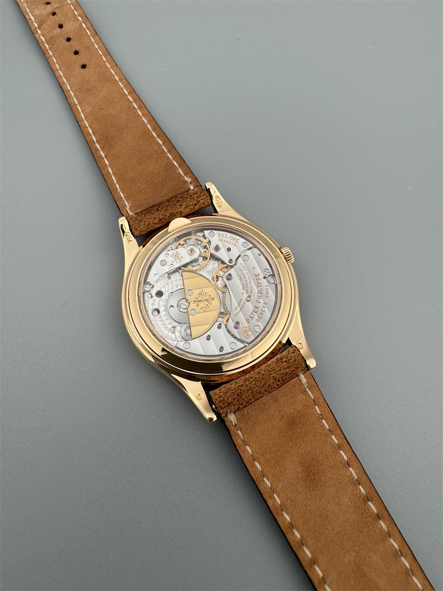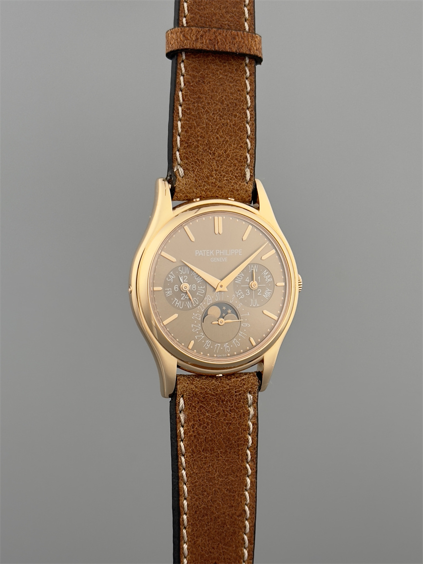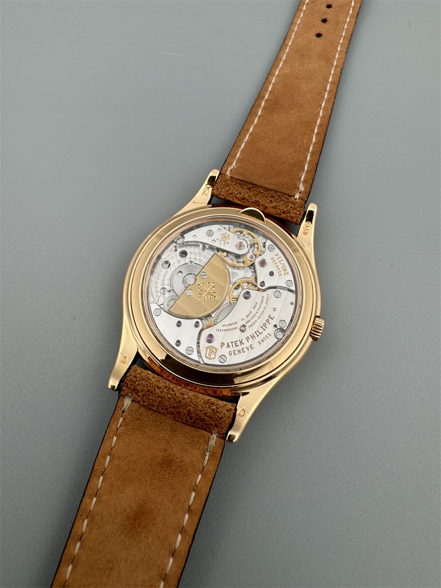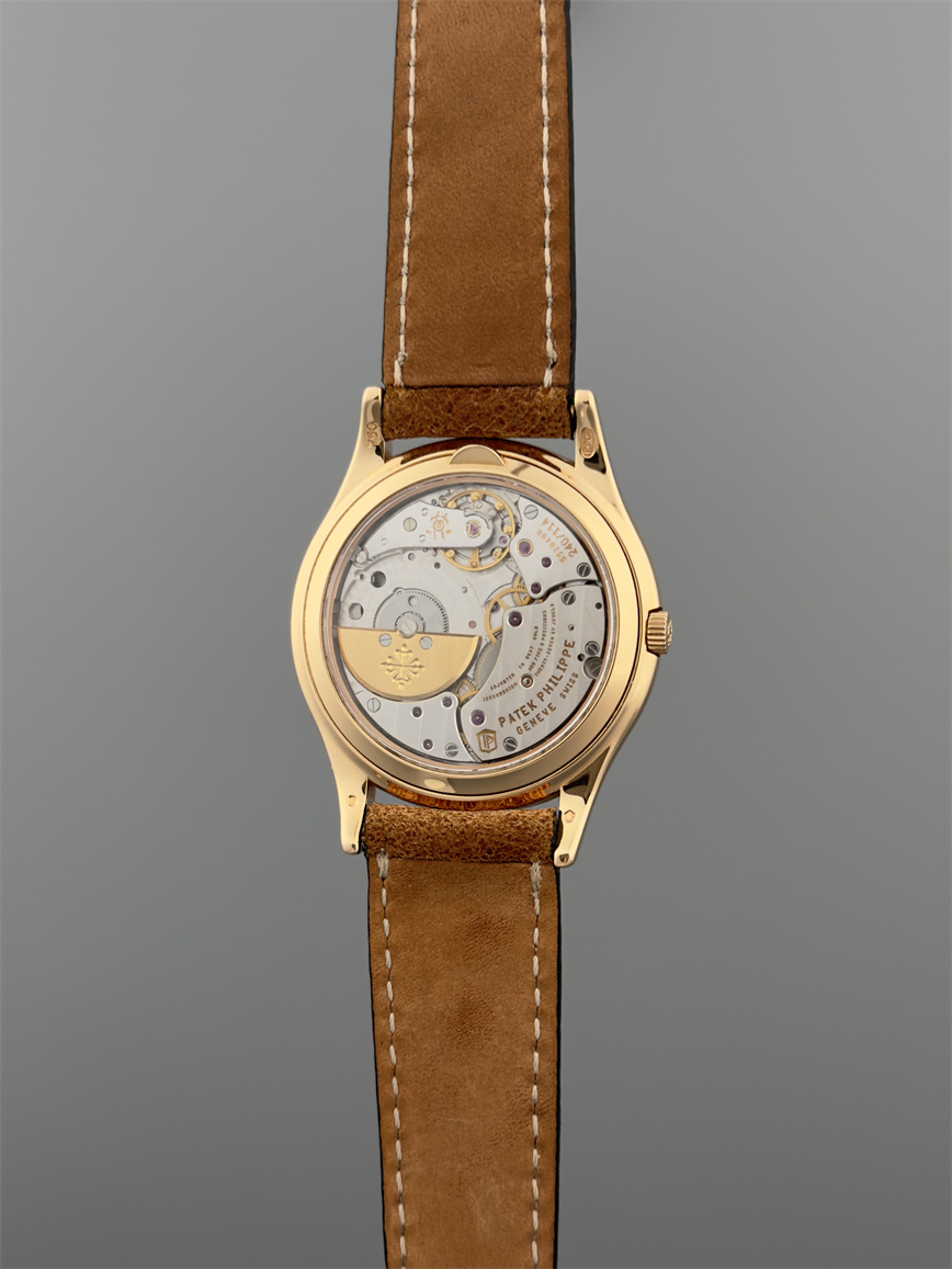 百达翡丽Ref.5140,卡拉卓华,超薄自动万年历腕表,红金材质,咖啡色盘面,口径37毫米,约2009年。透明底盖,卡拉卓华十字表冠;搭载机芯Cal.240/114,27颗宝石,22k金偏心迷你自动盘,Gyromax摆轮,日内瓦印记;银色盘面,金质立体子弹时标,金质太子妃指针,万年历,月相,闰年,24小时盘。盘面/机芯/表壳签名百达翡丽。附百达翡丽原始证书、金质底盖、调节笔及原始折叠扣。