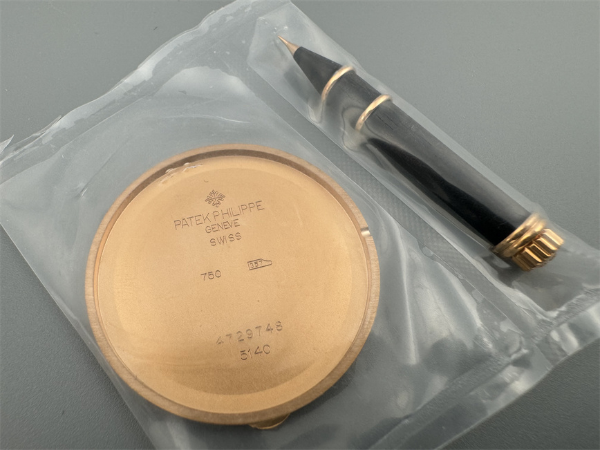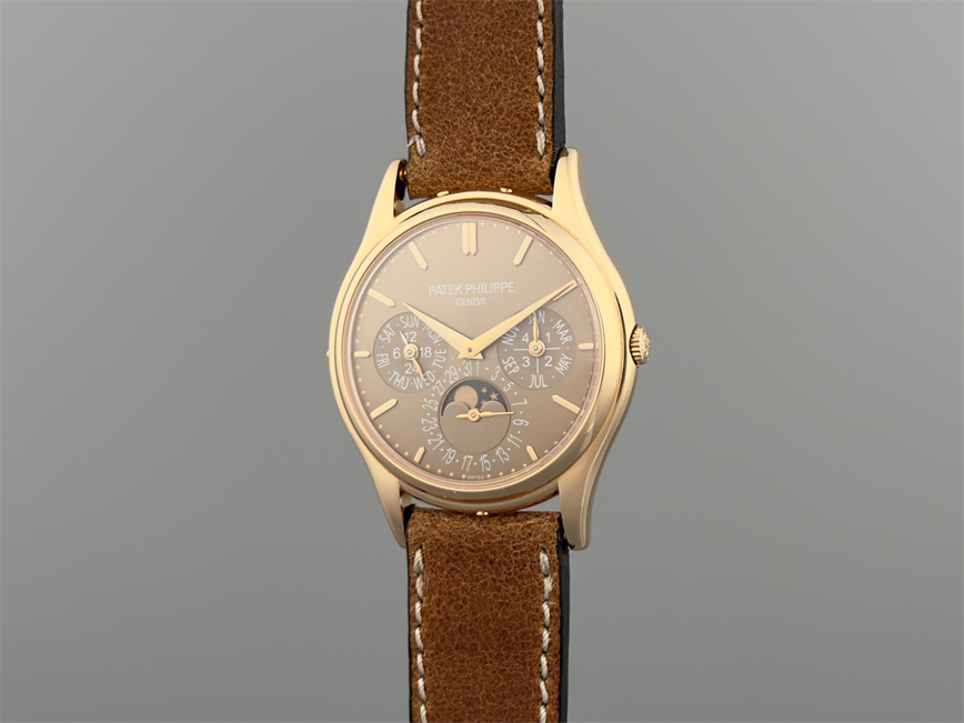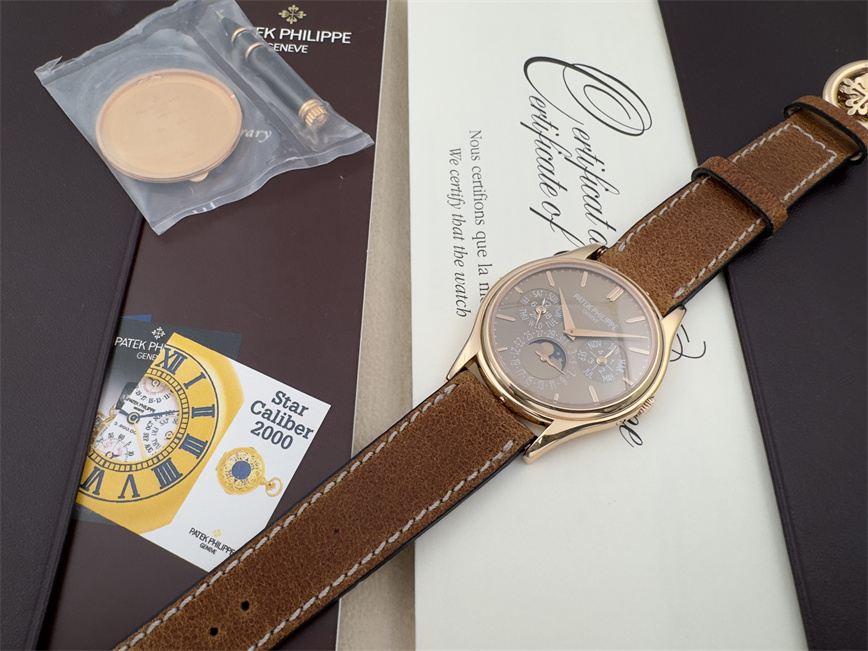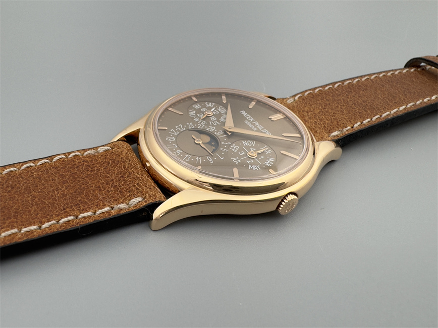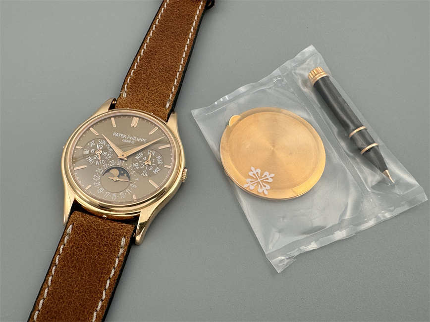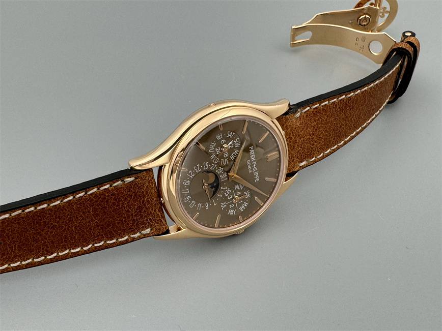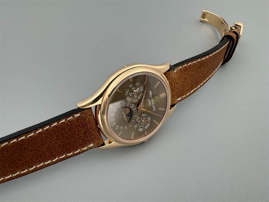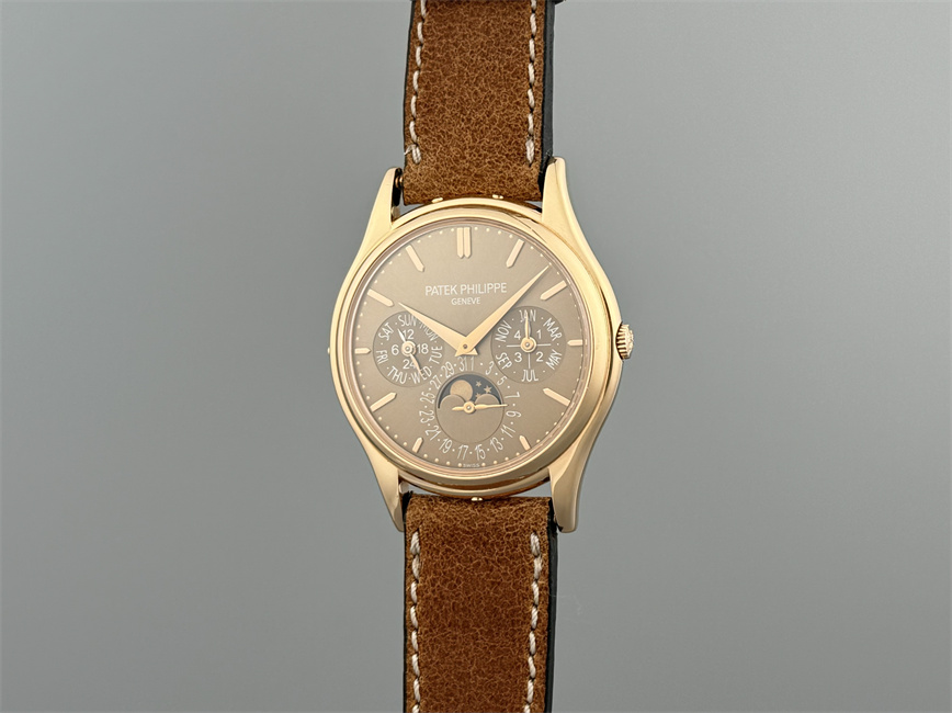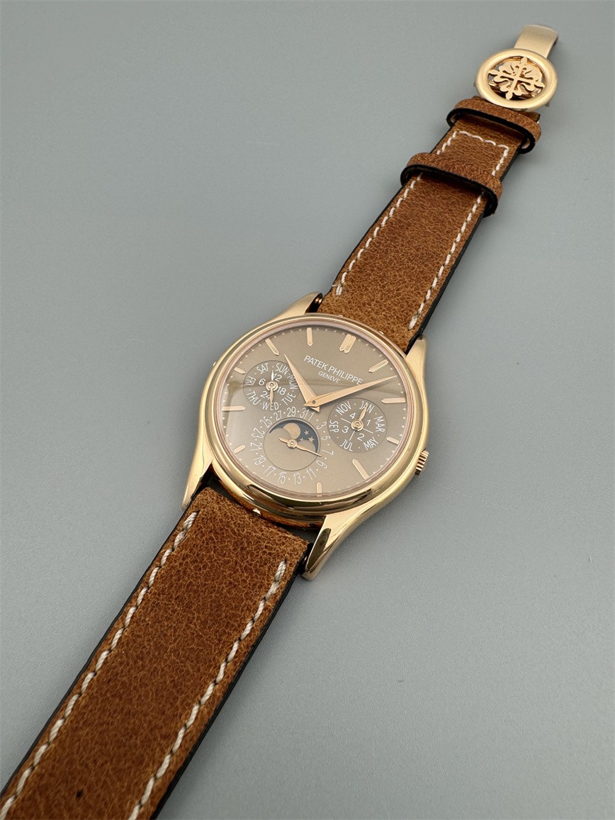 百达翡丽Ref.5140,卡拉卓华,超薄自动万年历腕表,红金材质,咖啡色盘面,口径37毫米,约2009年。透明底盖,卡拉卓华十字表冠;搭载机芯Cal.240/114,27颗宝石,22k金偏心迷你自动盘,Gyromax摆轮,日内瓦印记;银色盘面,金质立体子弹时标,金质太子妃指针,万年历,月相,闰年,24小时盘。盘面/机芯/表壳签名百达翡丽。附百达翡丽原始证书、金质底盖、调节笔及原始折叠扣。